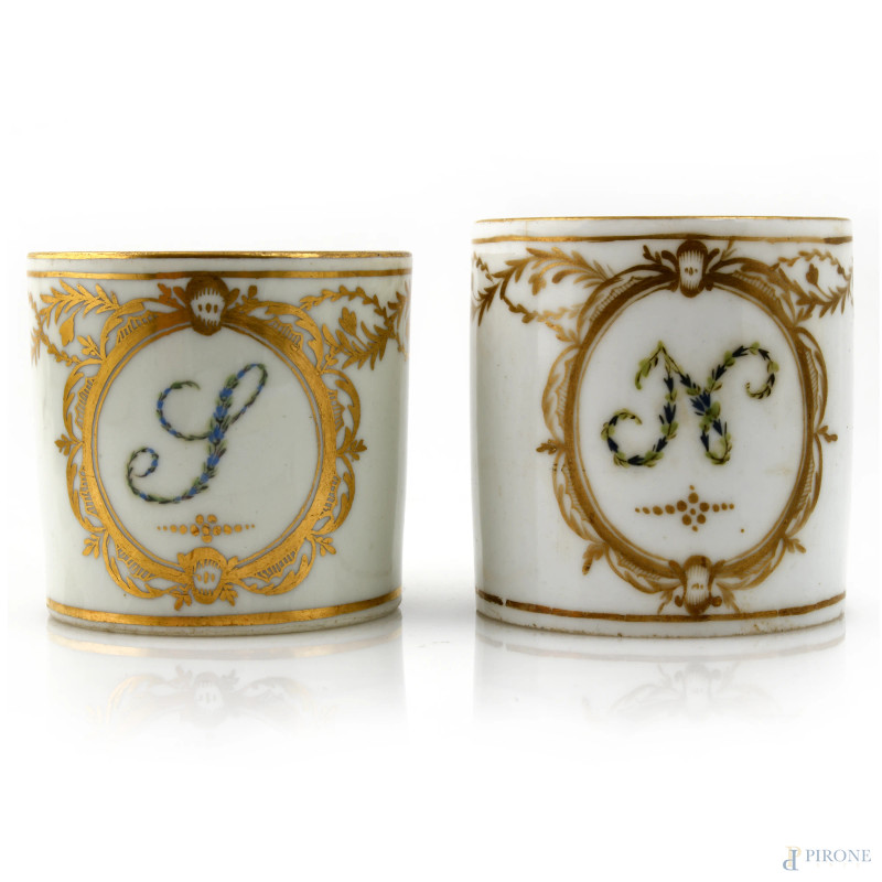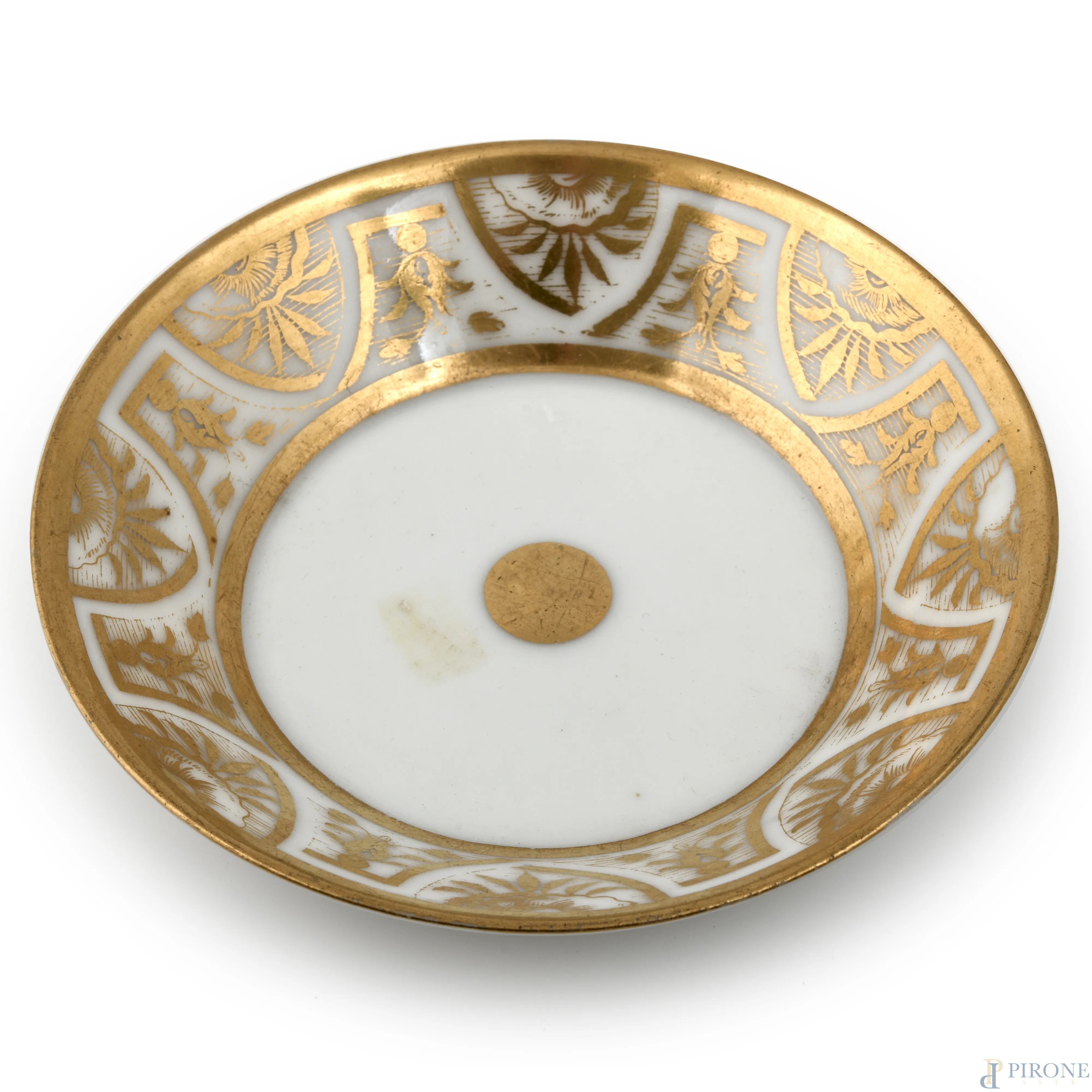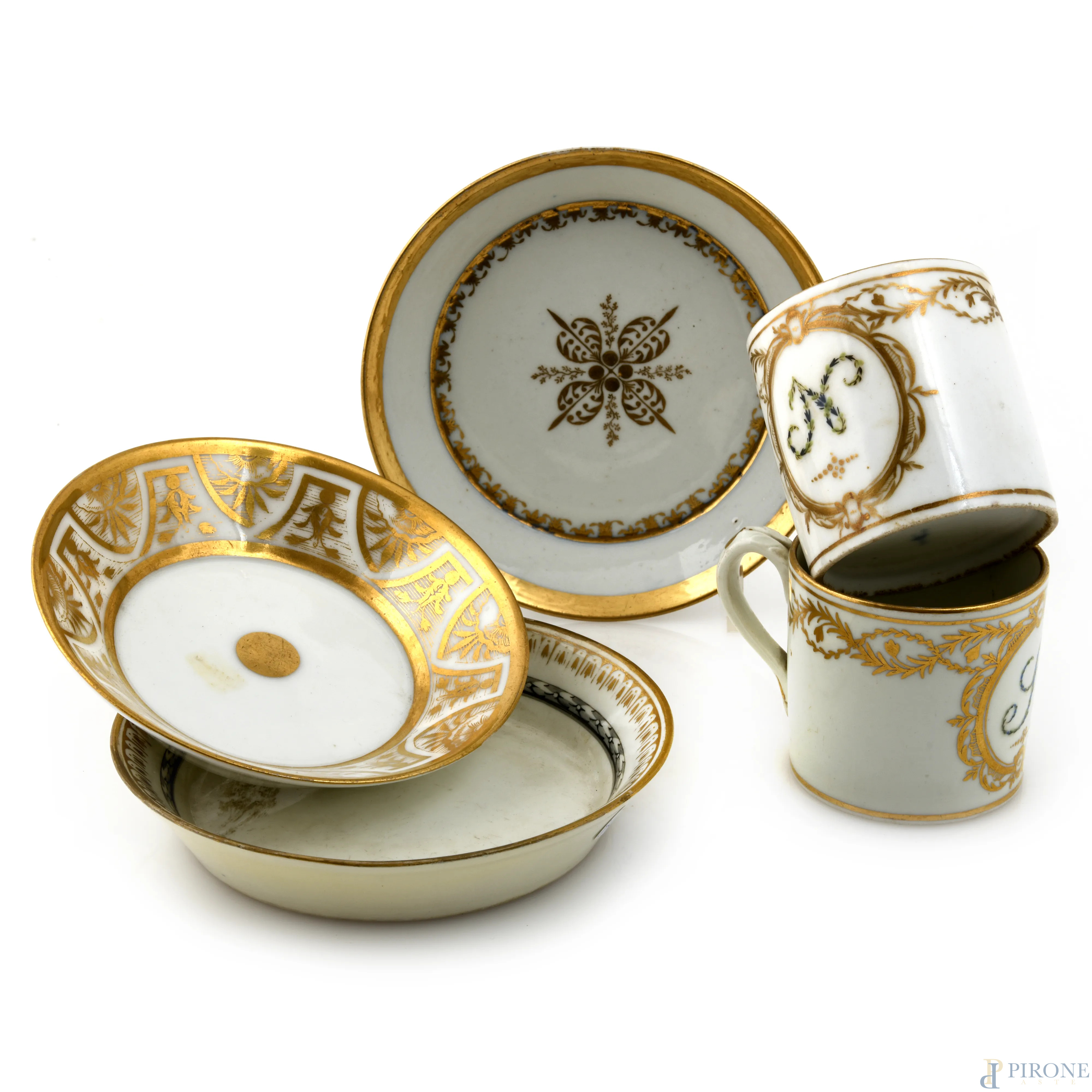 Lotto di due tazzine e tre piattini in porcellana di varia manifattura a fondo bianco ed elementi decorativi dorati, altezza tazzina cm 6; diametro massimo piattini cm 13,5,(segni di usura, difetti)