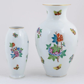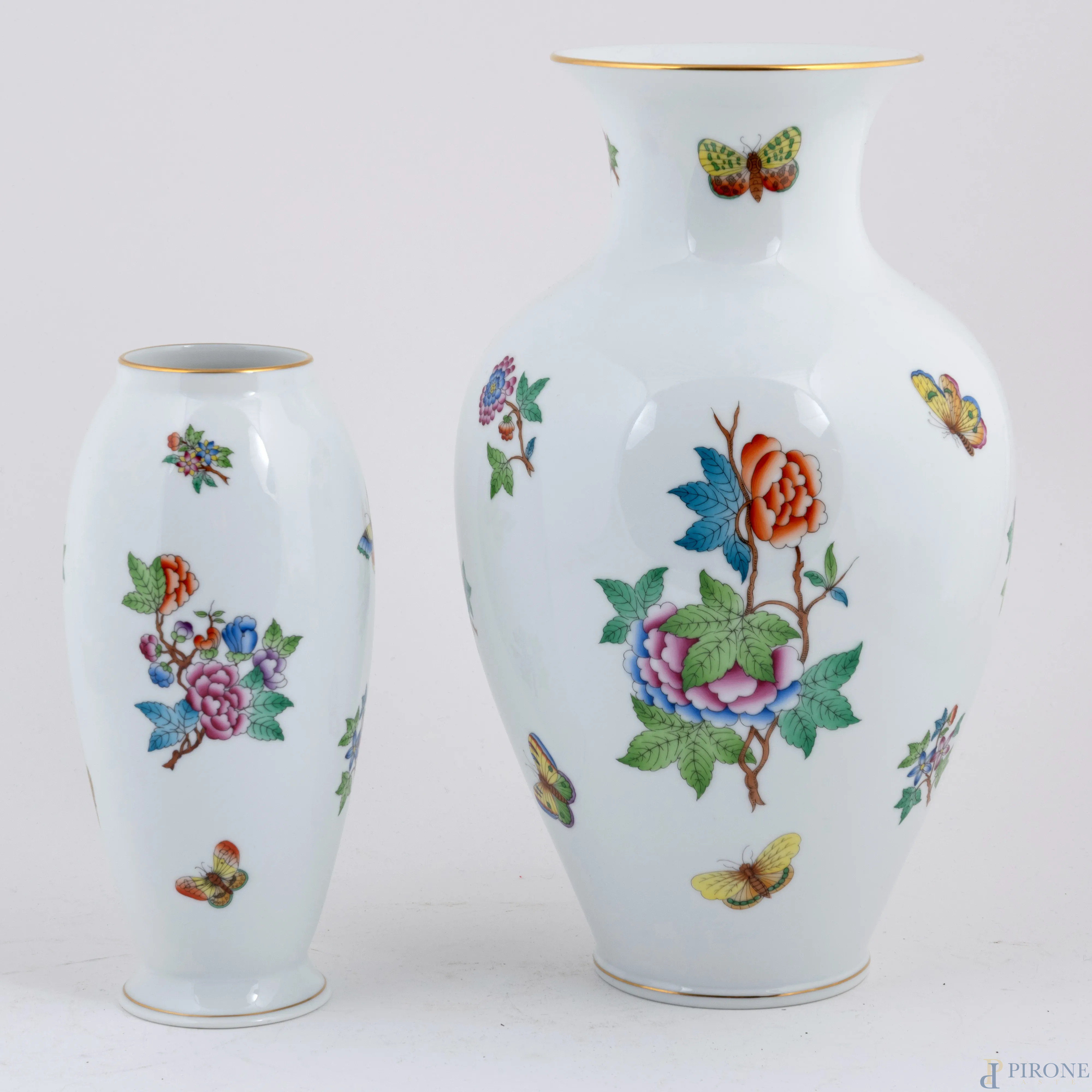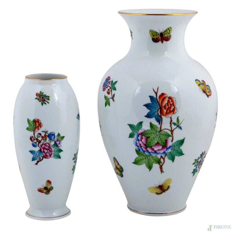 Lotto di due vasi in porcellana Herend con decori a farfalle e fiori su fondo bianco, XX secolo, altezza massima cm 32,5