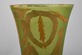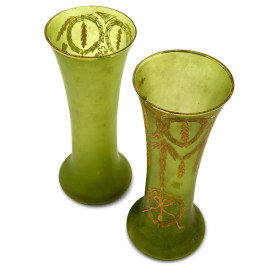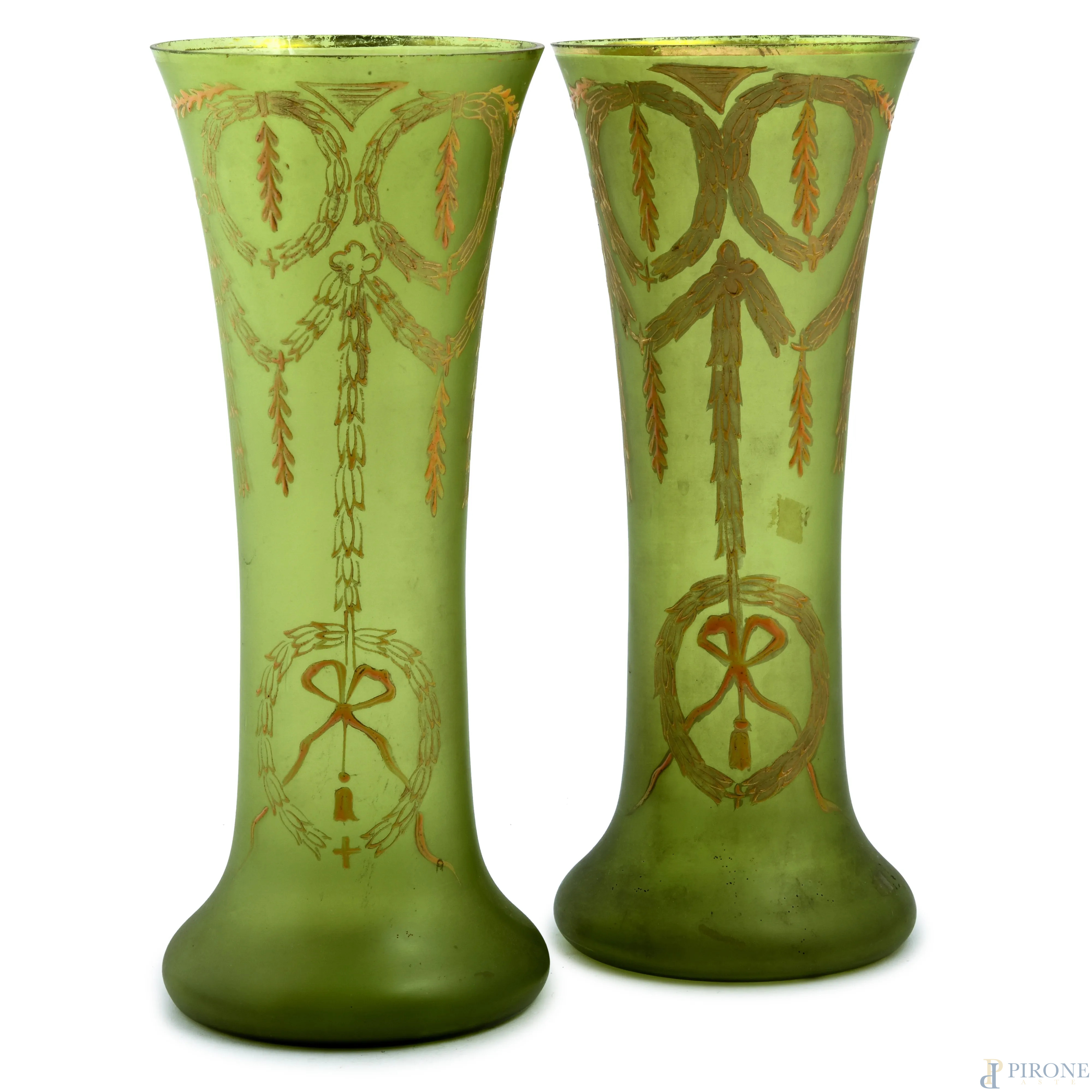 Lotto di due vasi in vetro satinato verde con decori a festoni dorati, XX secolo, altezza cm 29, (segni di usura)