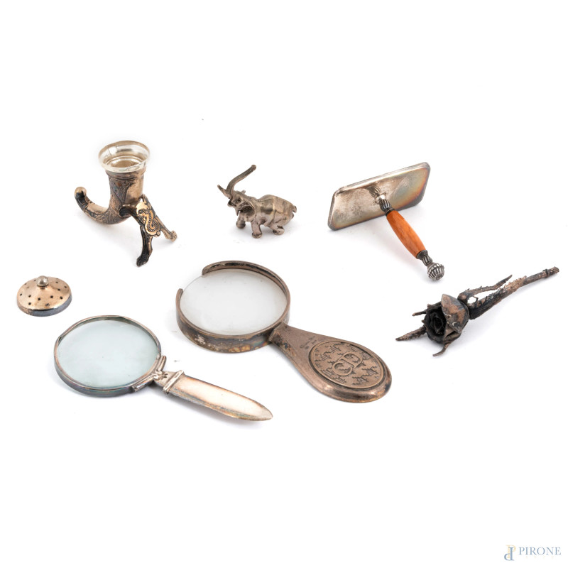 Lotto di oggetti vari in argento, peso lordo complessivo gr 190, misura massima cm 11x5, (difetti)