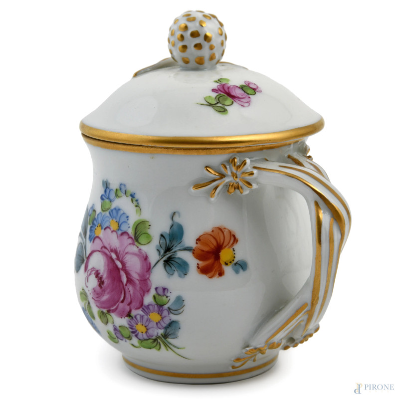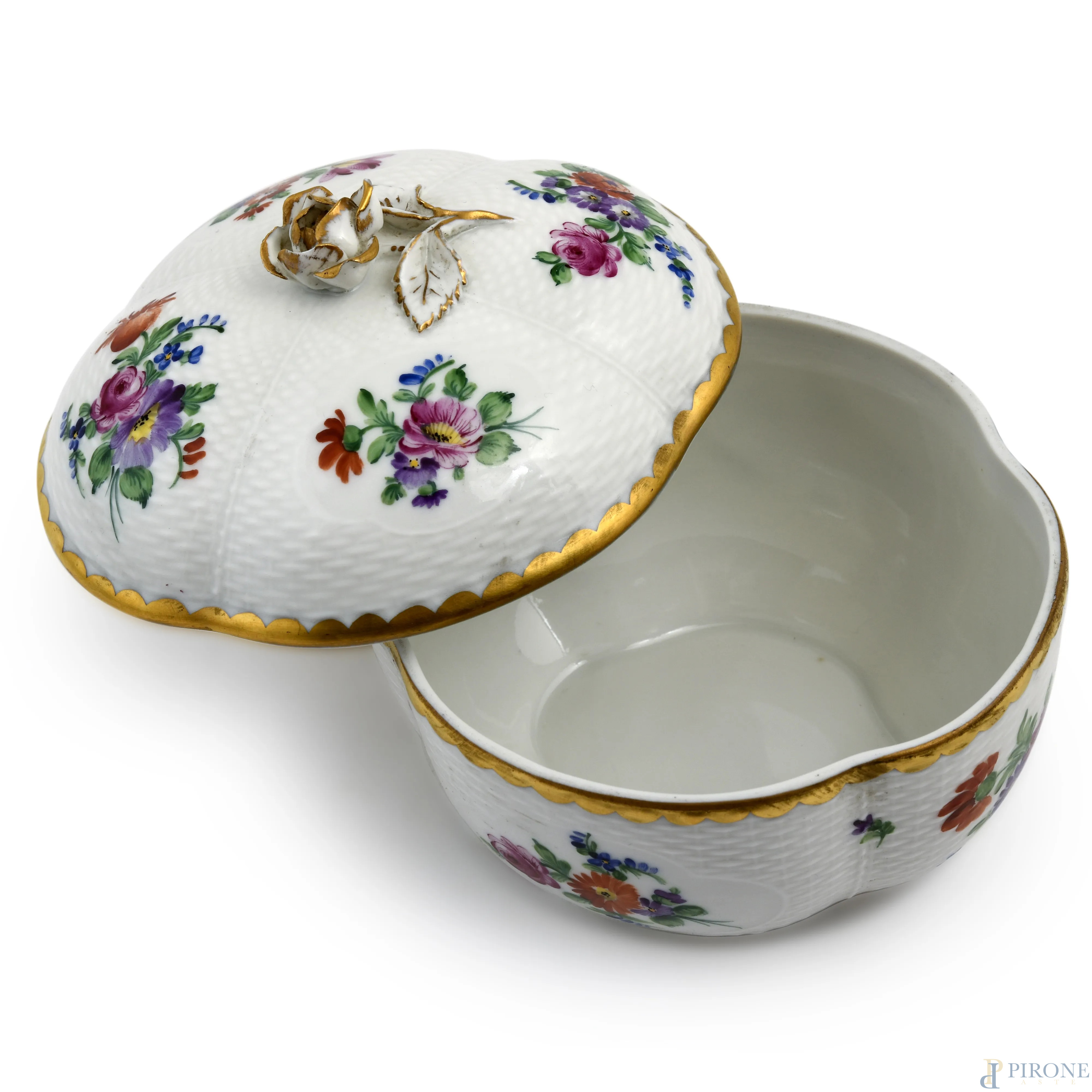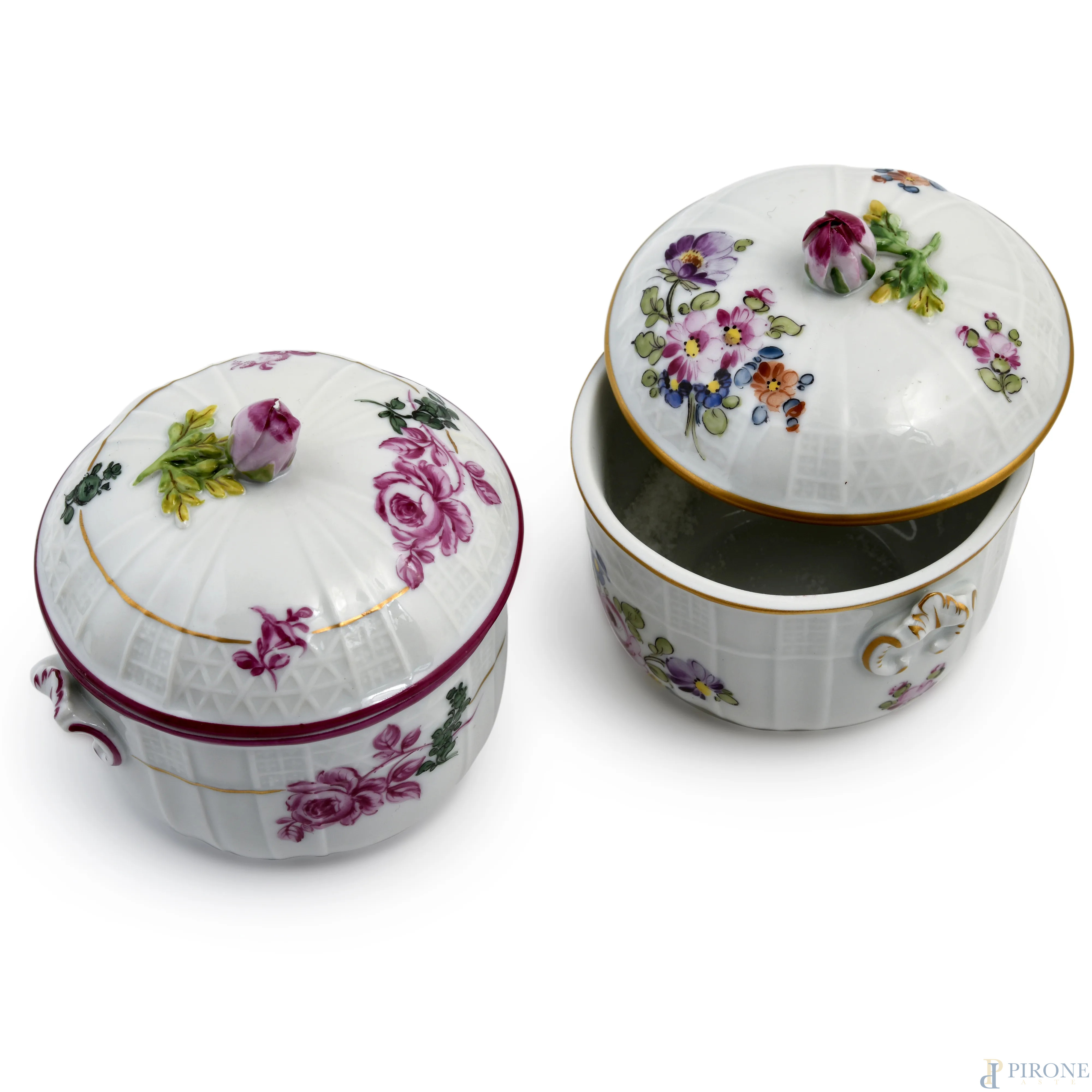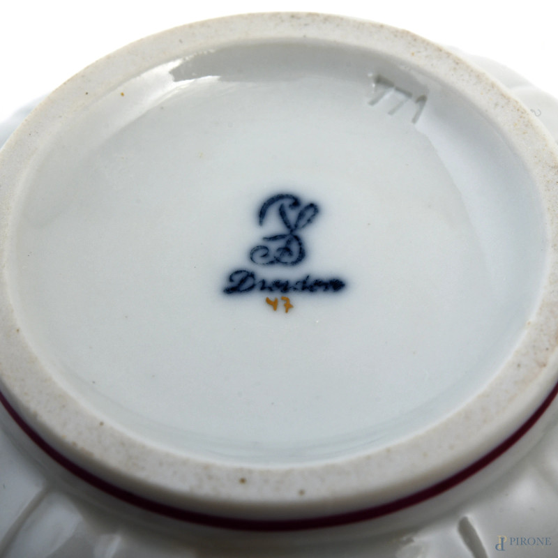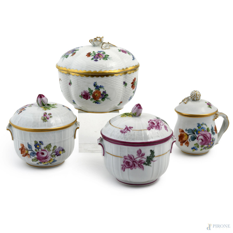 Lotto di quattro portabonbon in porcellana Dresden in vari colori, XX secolo, misure massime cm 10x12x11