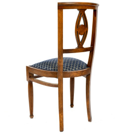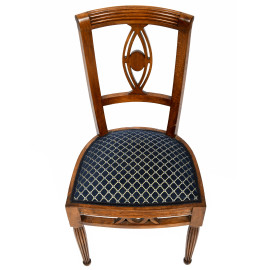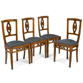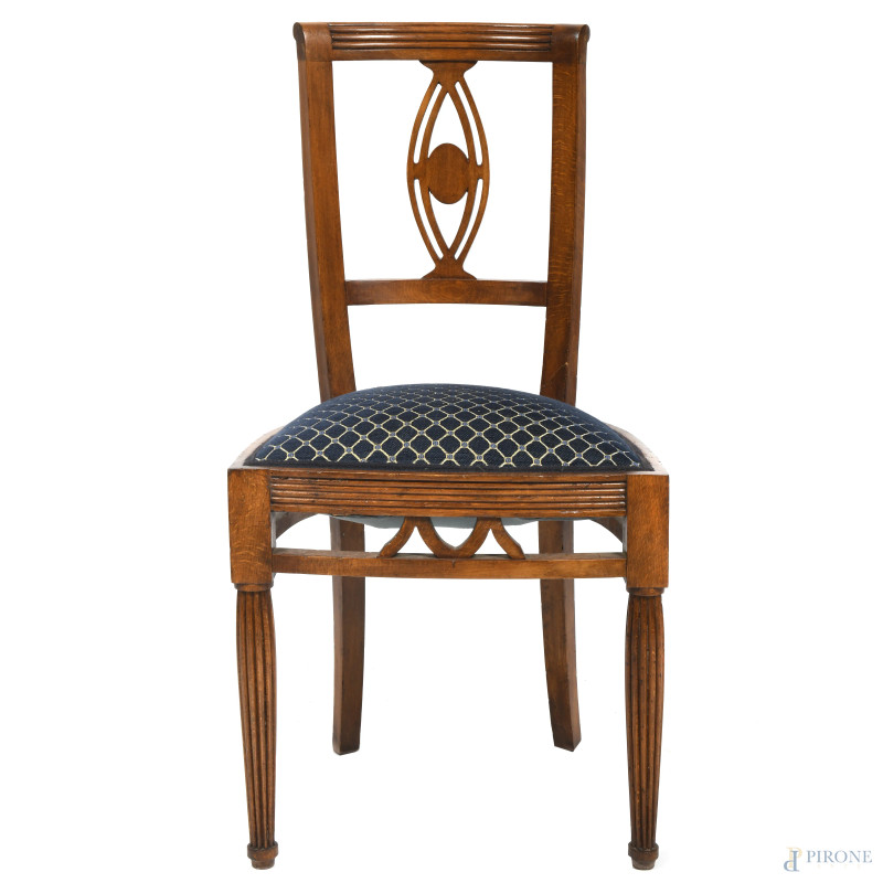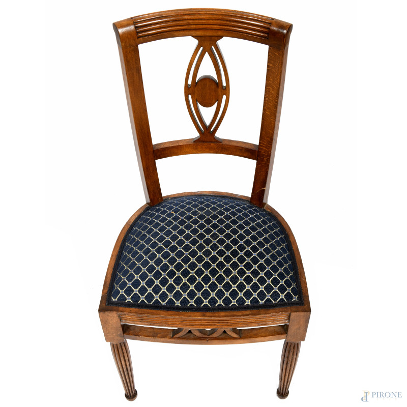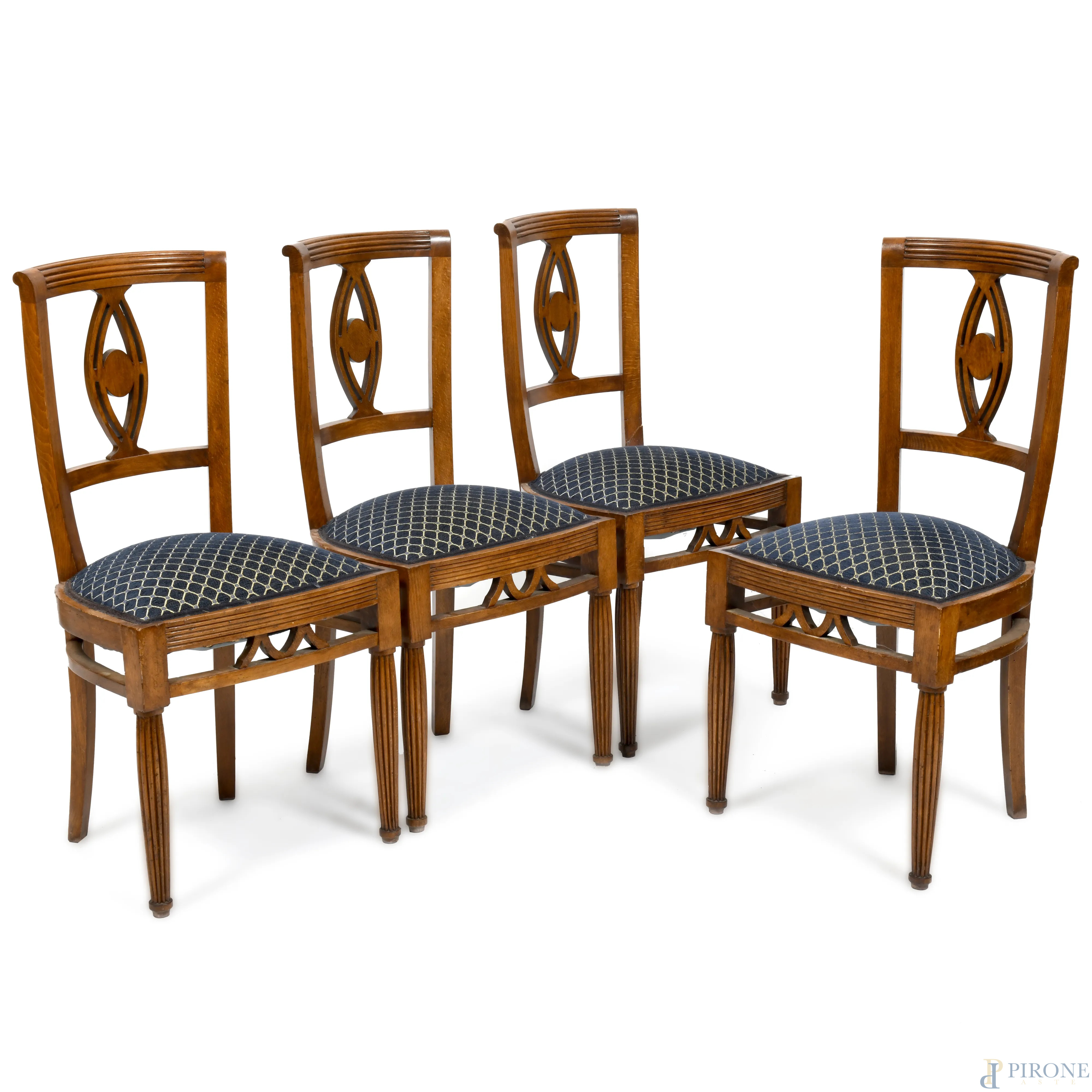 Lotto di quattro sedie in noce intagliato con gambe anteriori scanalate e schienale intagliato a mandorla. Seduta imbottita e rivestita in tessuto blu e panna, XX secolo, cm 90x46x40, (segni di usura, difetti, scalfiture, fori di tarlo)