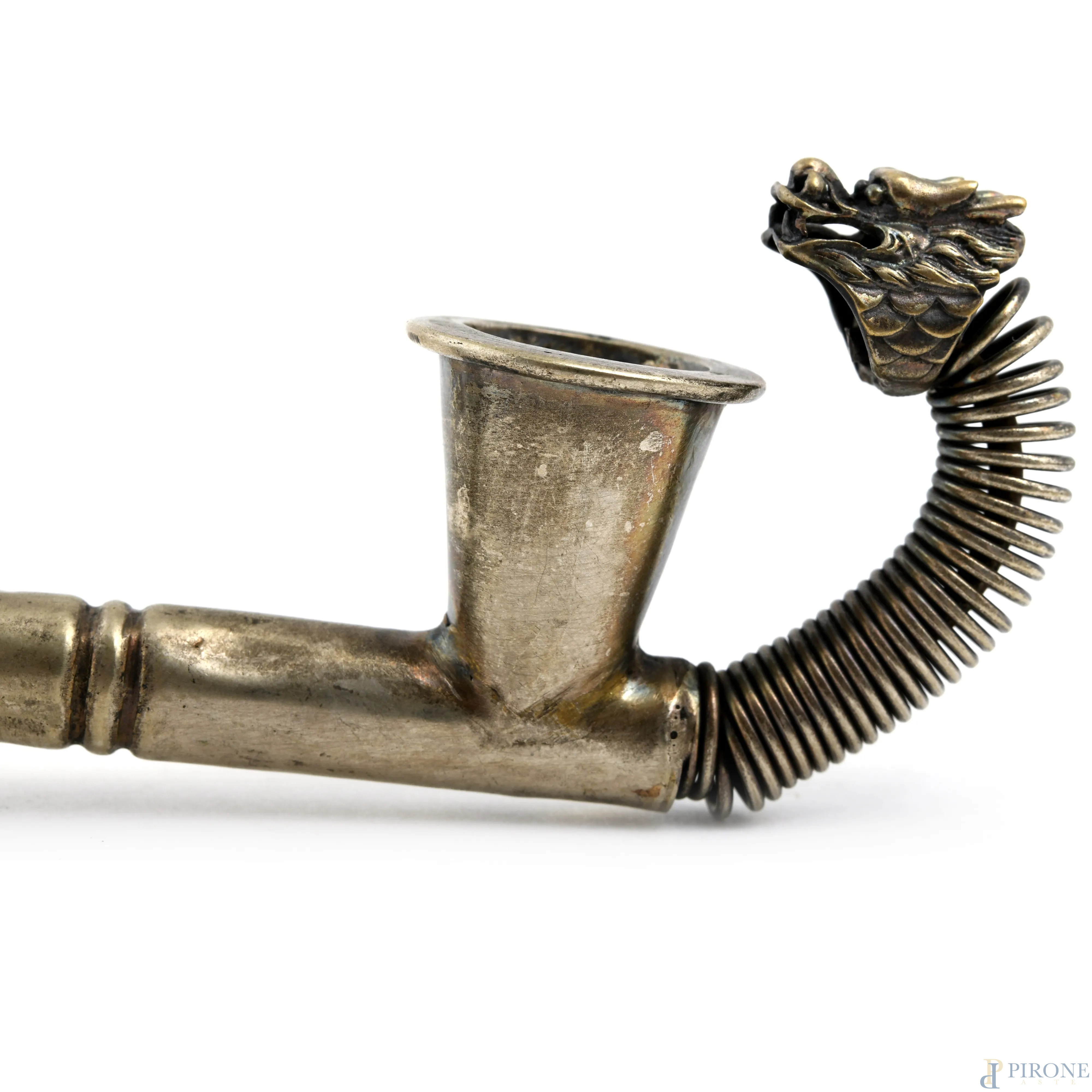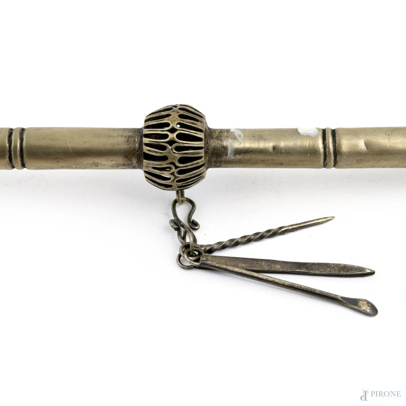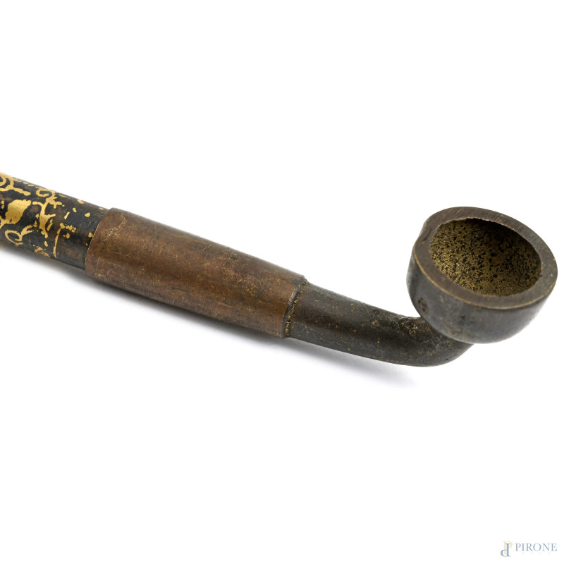 Lotto di sette pipe mediorientali in metallo, XX secolo, lunghezza massima cm 38, (segni di usura, difetti)