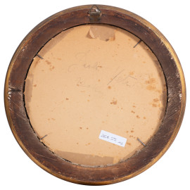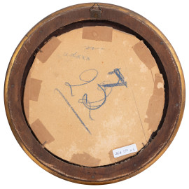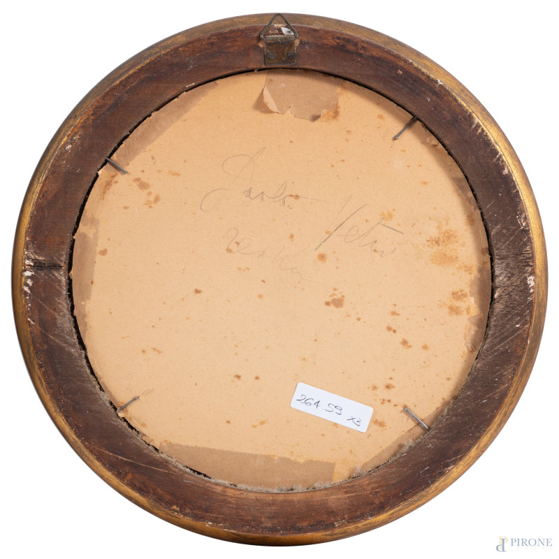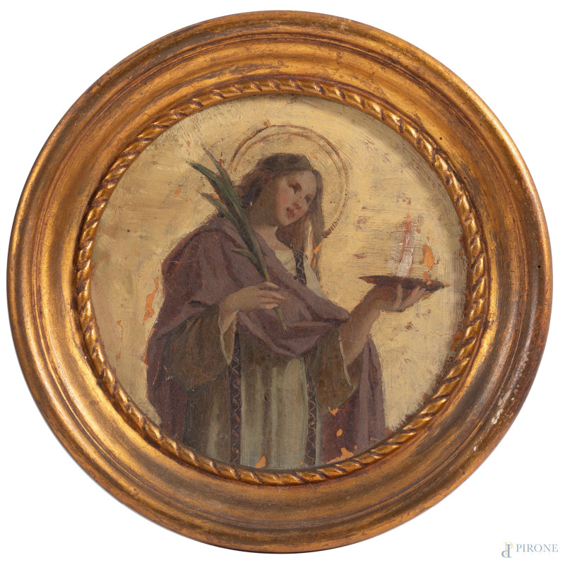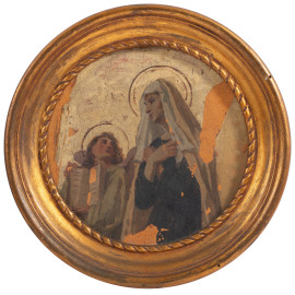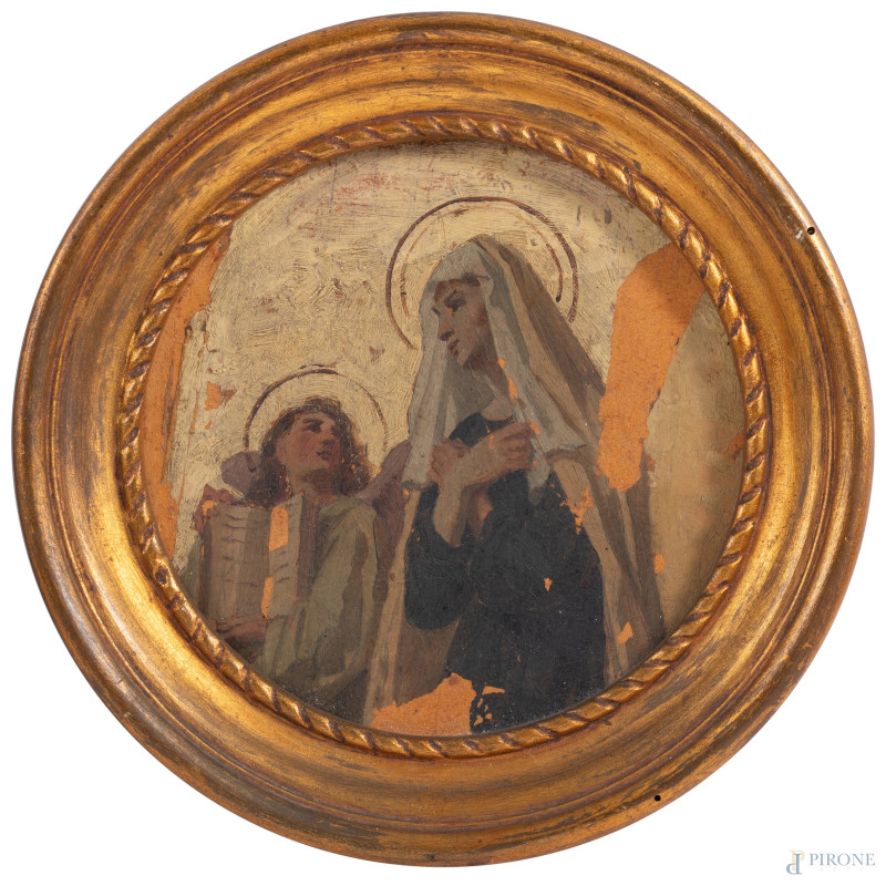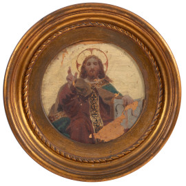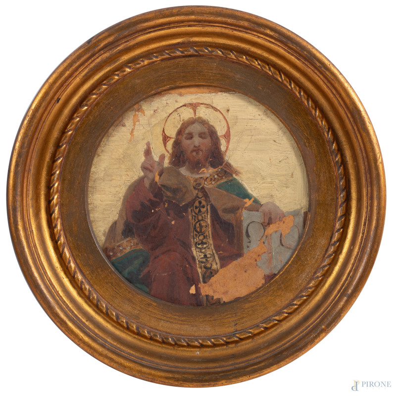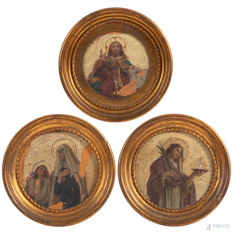 Lotto di tre dipinti ad olio su cartone in serto circolare raffiguranti Cristo tra Sante, XIX-XX secolo, diametro cm 21,5, entro cornice, (cadute di colore, abrasioni)