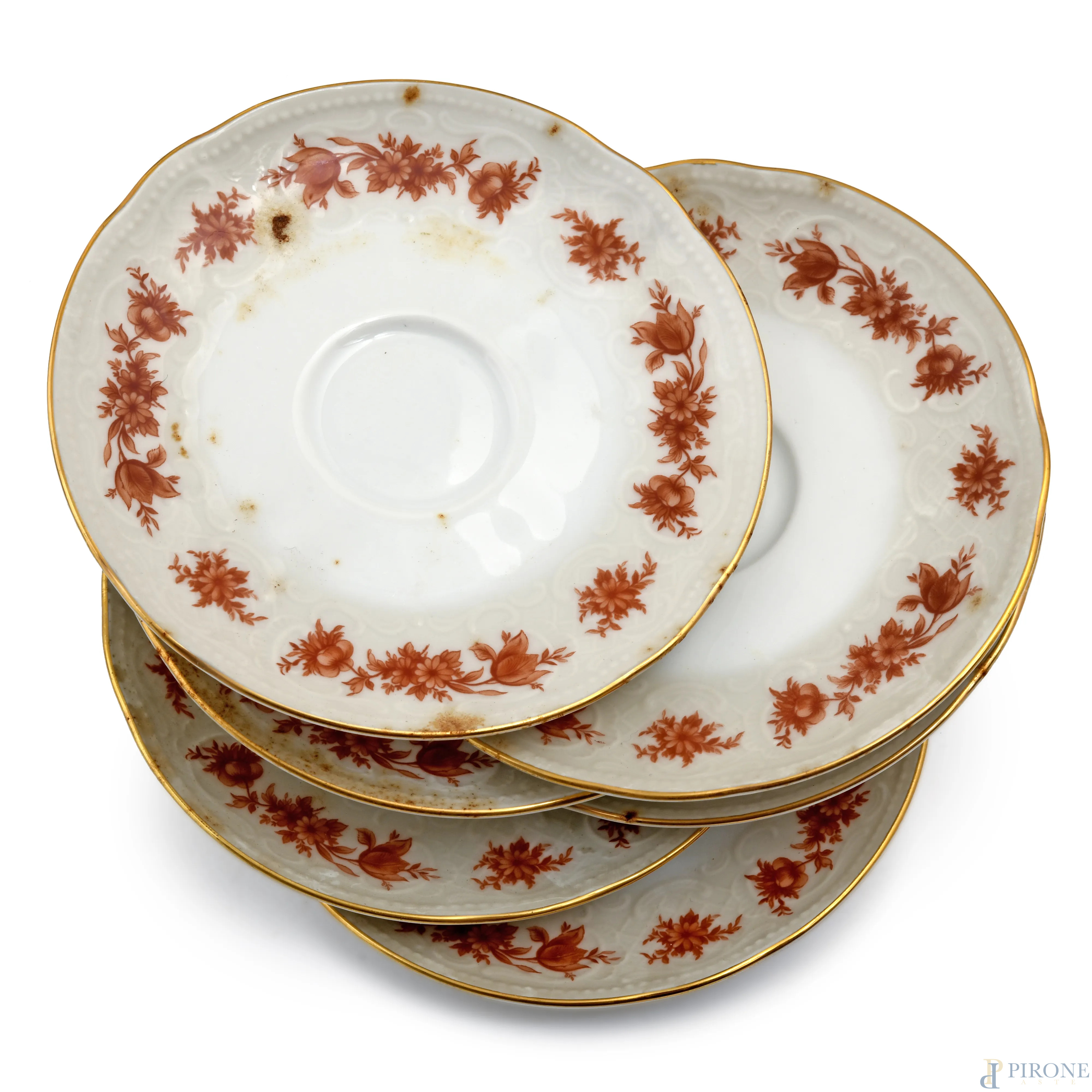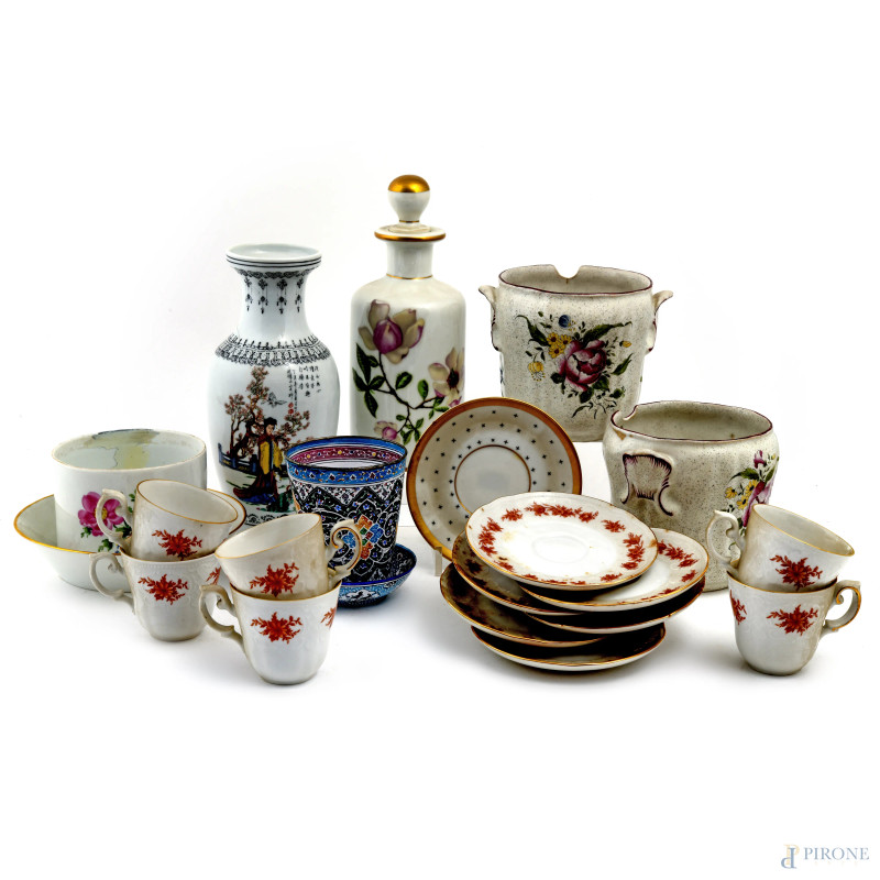 Lotto di vari articoli in maiolica e porcellana decorata, XX secolo, altezza massima cm 20, (rotture,difetti, segni di usura)