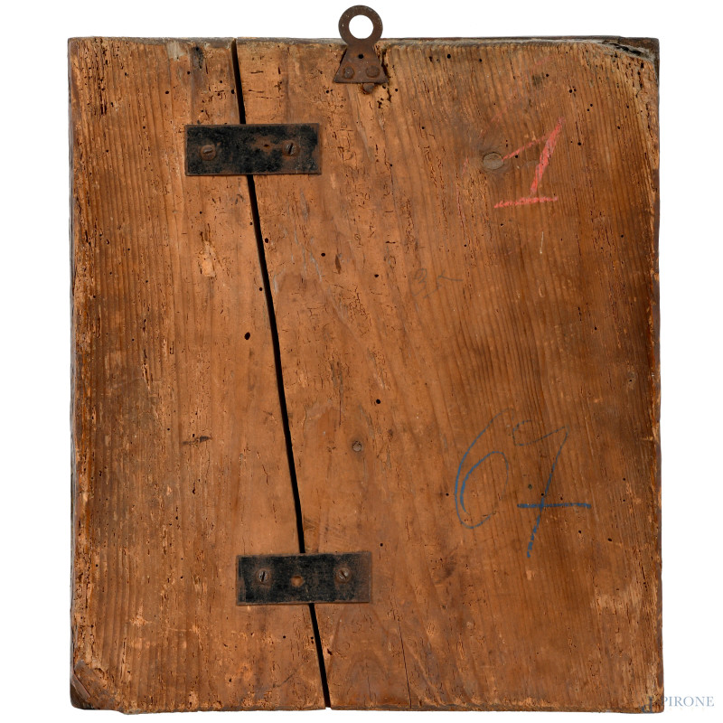 Madonna con Bambino e San Giovannino, XIX-XX secolo, olio su tavola, misure complessive cm 31x27,5,(fori di tarlo, cadute di colore, scalfiture, abrasioni, graffi)