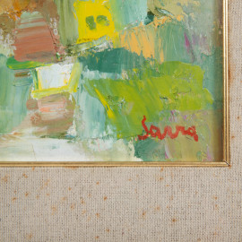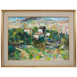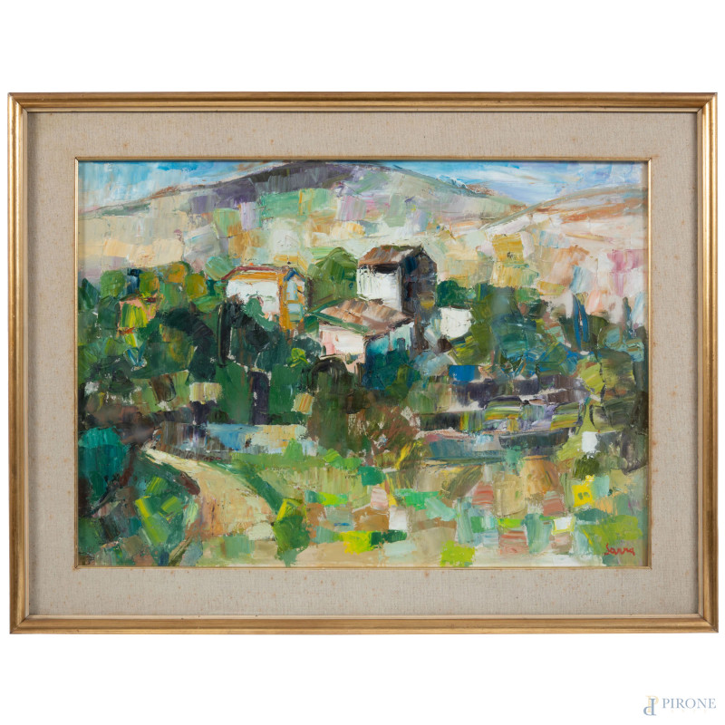 Manlio Sarra (1909-1986), Paesaggio con case, olio su tela , cm 50x70, firmato in basso a destra, entro cornice