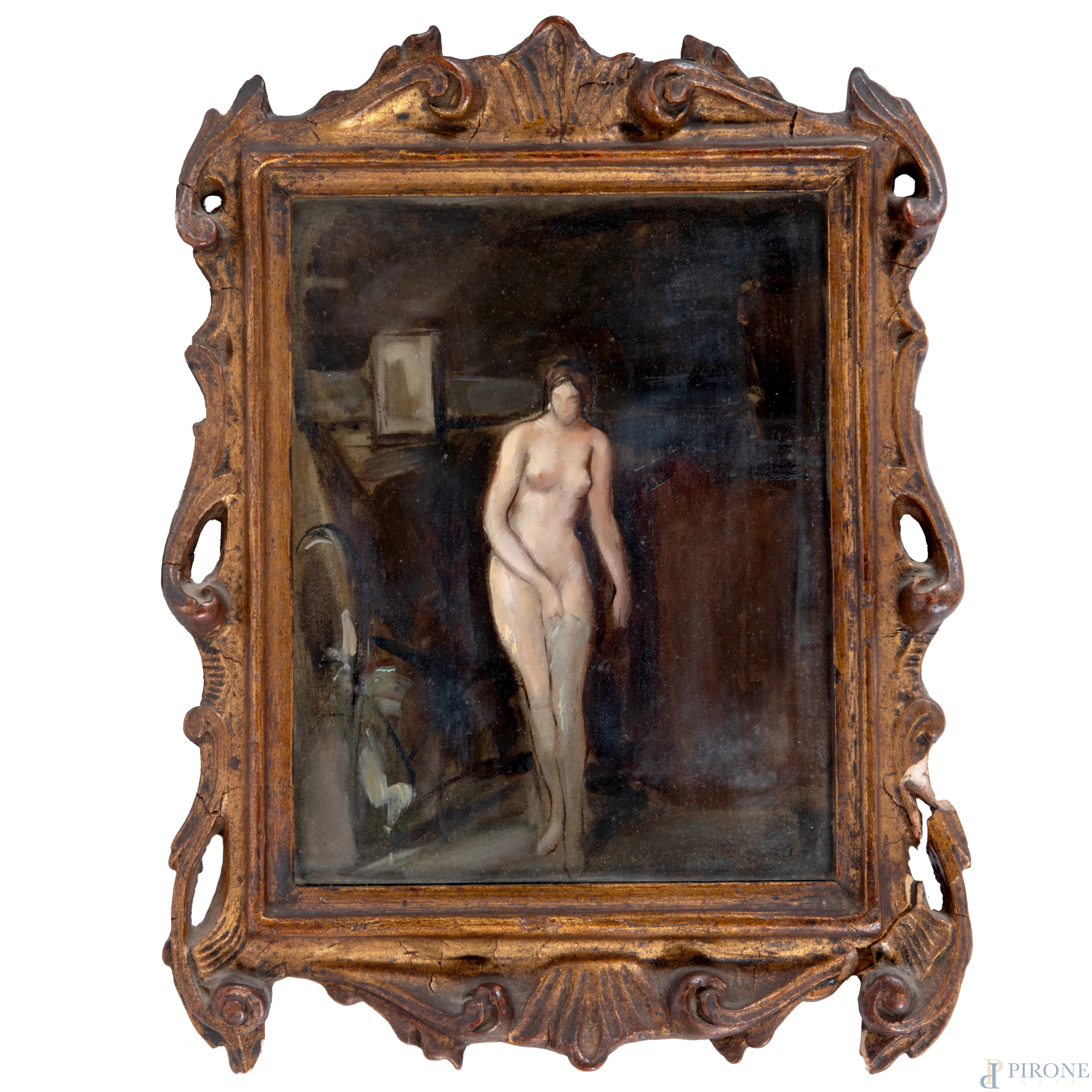 Marcello Coccon Saba, Nudo femminle, XIX-XX secolo, olio su cartone, cm 22,5x18, firmato in basso a destra, entro cornice, (difetti)