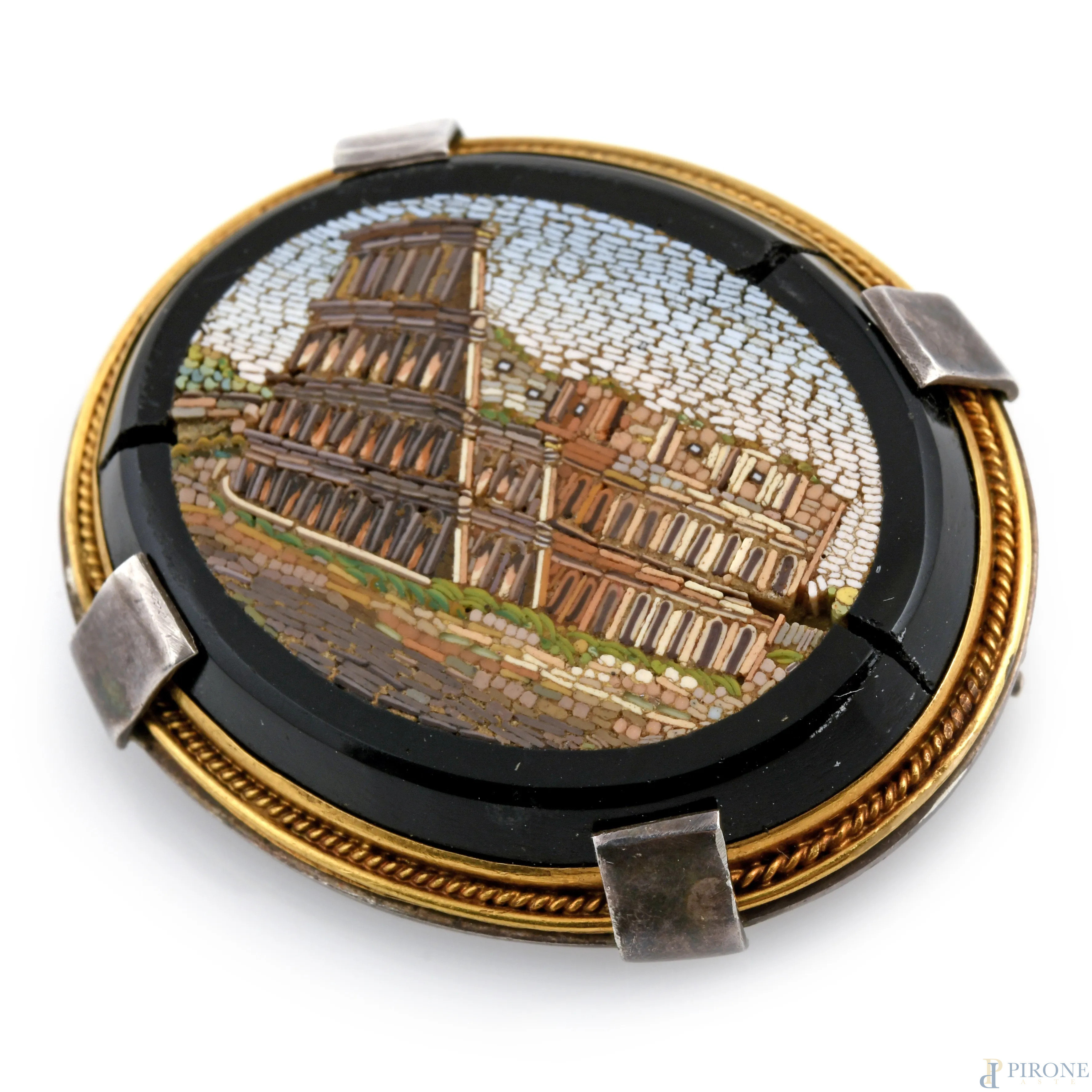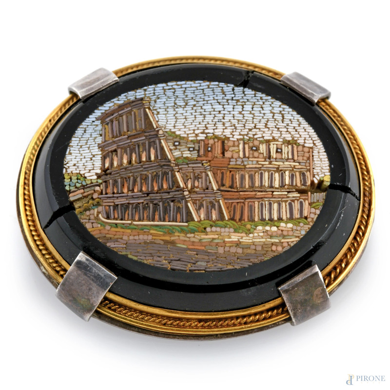 Micromosaico raffigurante Colosseo con montatura a spilla in oro basso e argento, XX secolo, cm 4x3,3, (difetti, rotture)