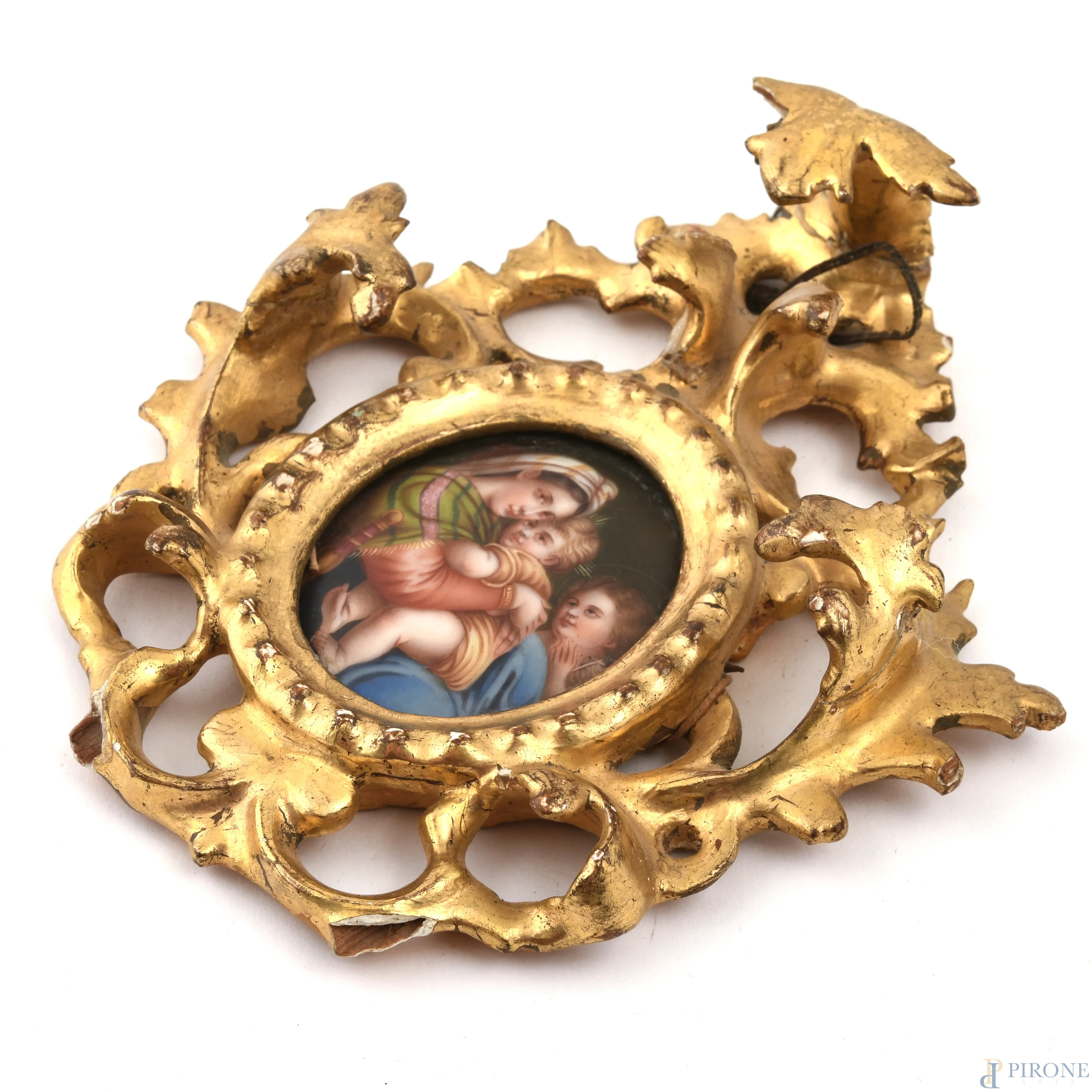 Miniatura in porcellana dipinta con riproduzione a mano della Madonna della Seggiola, XIX-XX secolo, entro cornice in legno dorato finemente intagliato, misure complessive cm 13x12,5, (segni di usura, rotture, cadute di doratura)