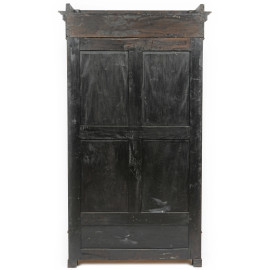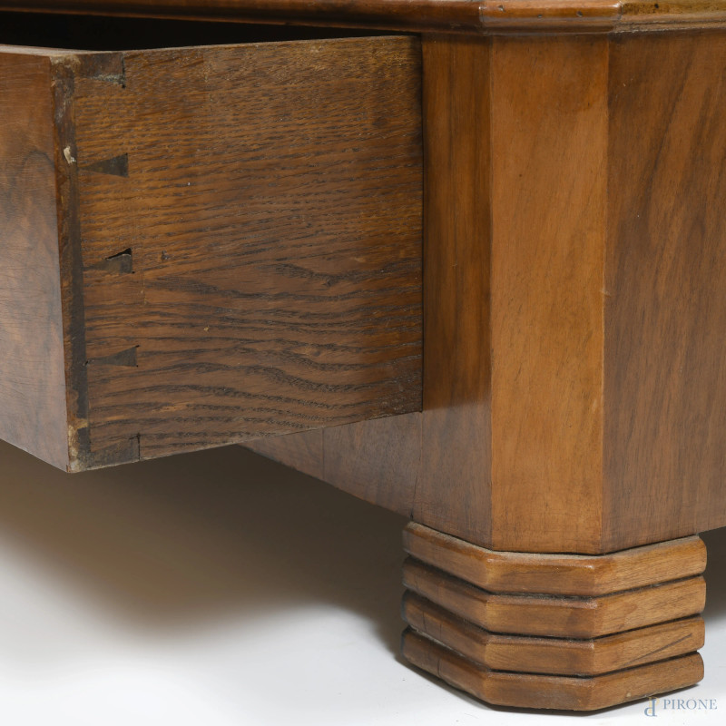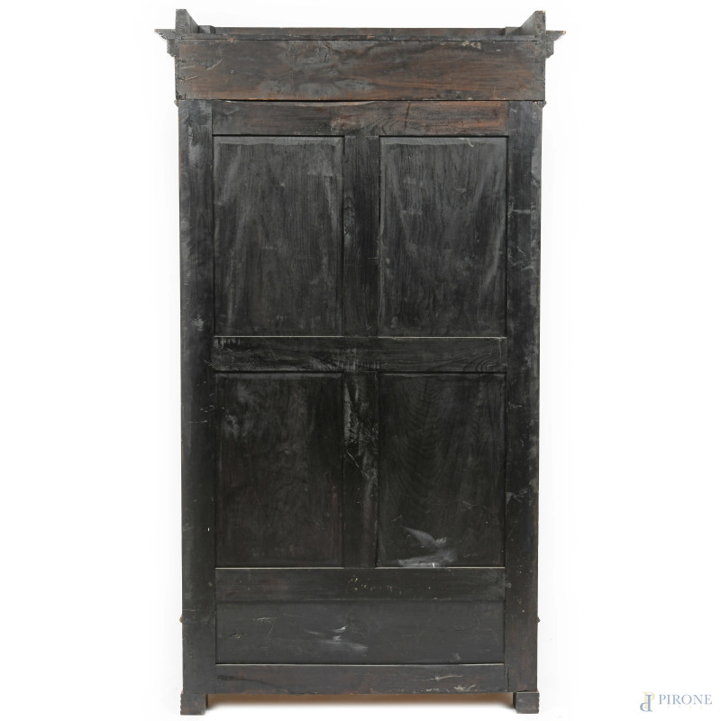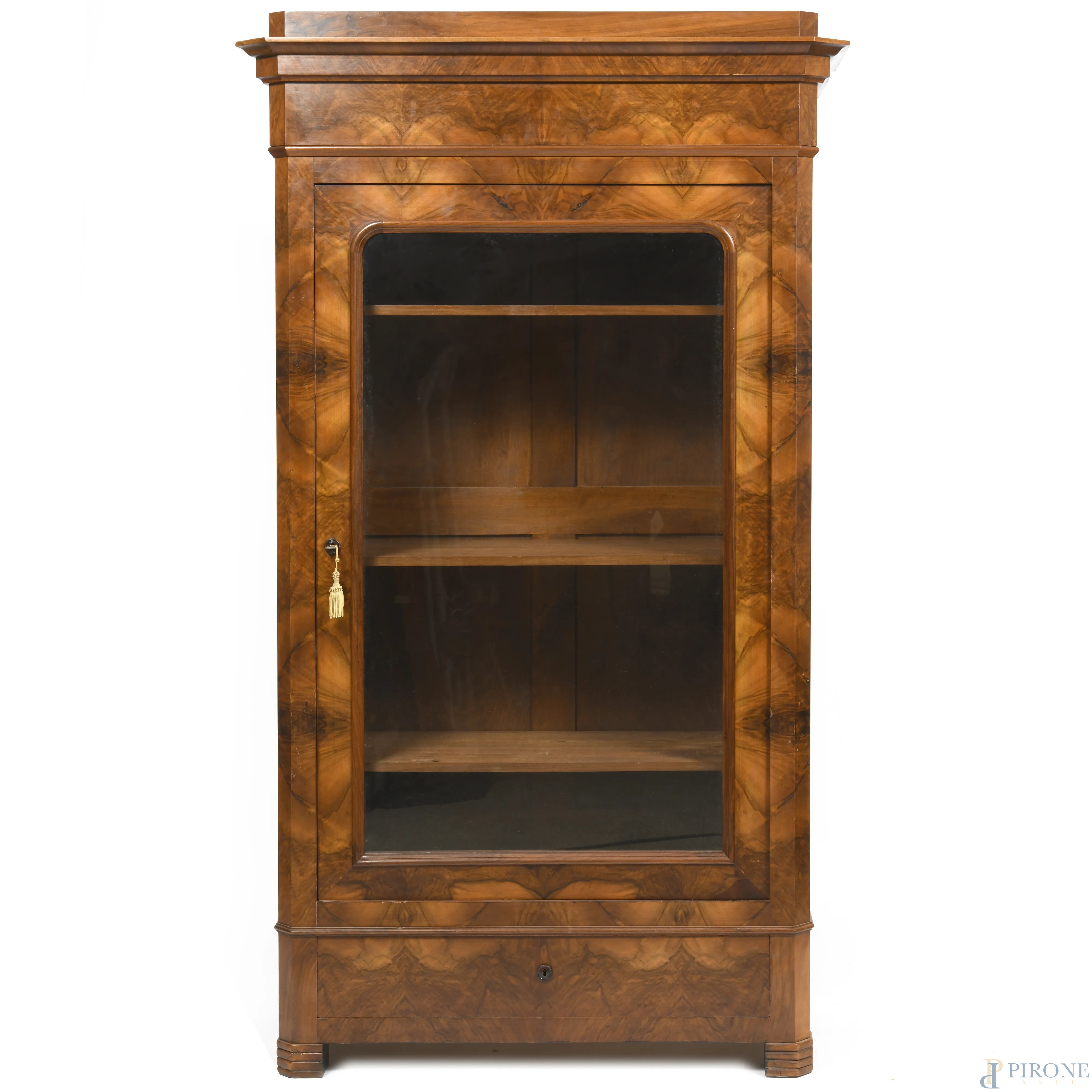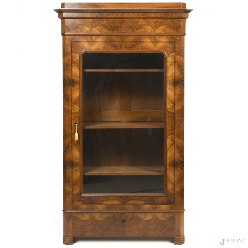 Mobile vetrina in legno impiallacciato in noce e radica di noce con anta singola e cassetto alla base. XX secolo, cm 204x118x52, (segni di usura, scalfiture, difetti)