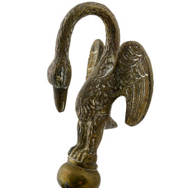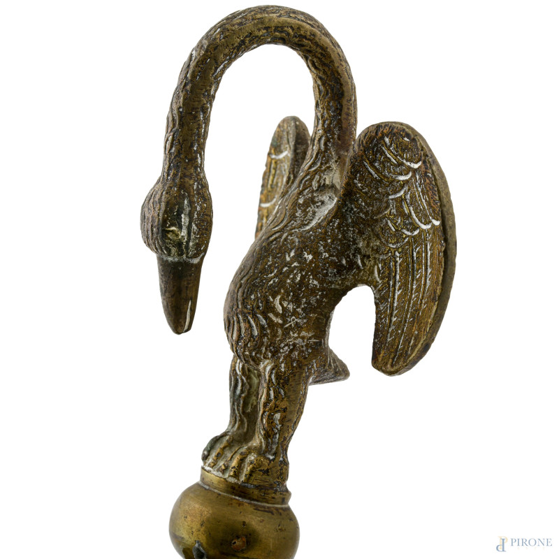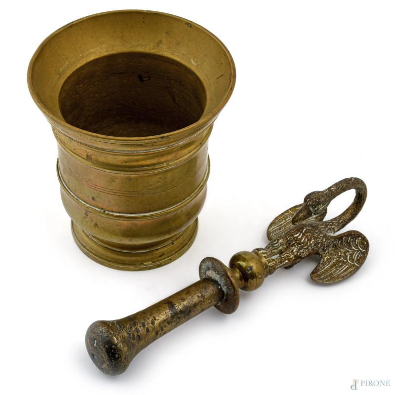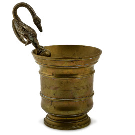 Mortaio in bronzo dorato con pestello con presa a foggia di cigno, XX secolo, misure massime cm 21,5, (segni di usura del tempo)