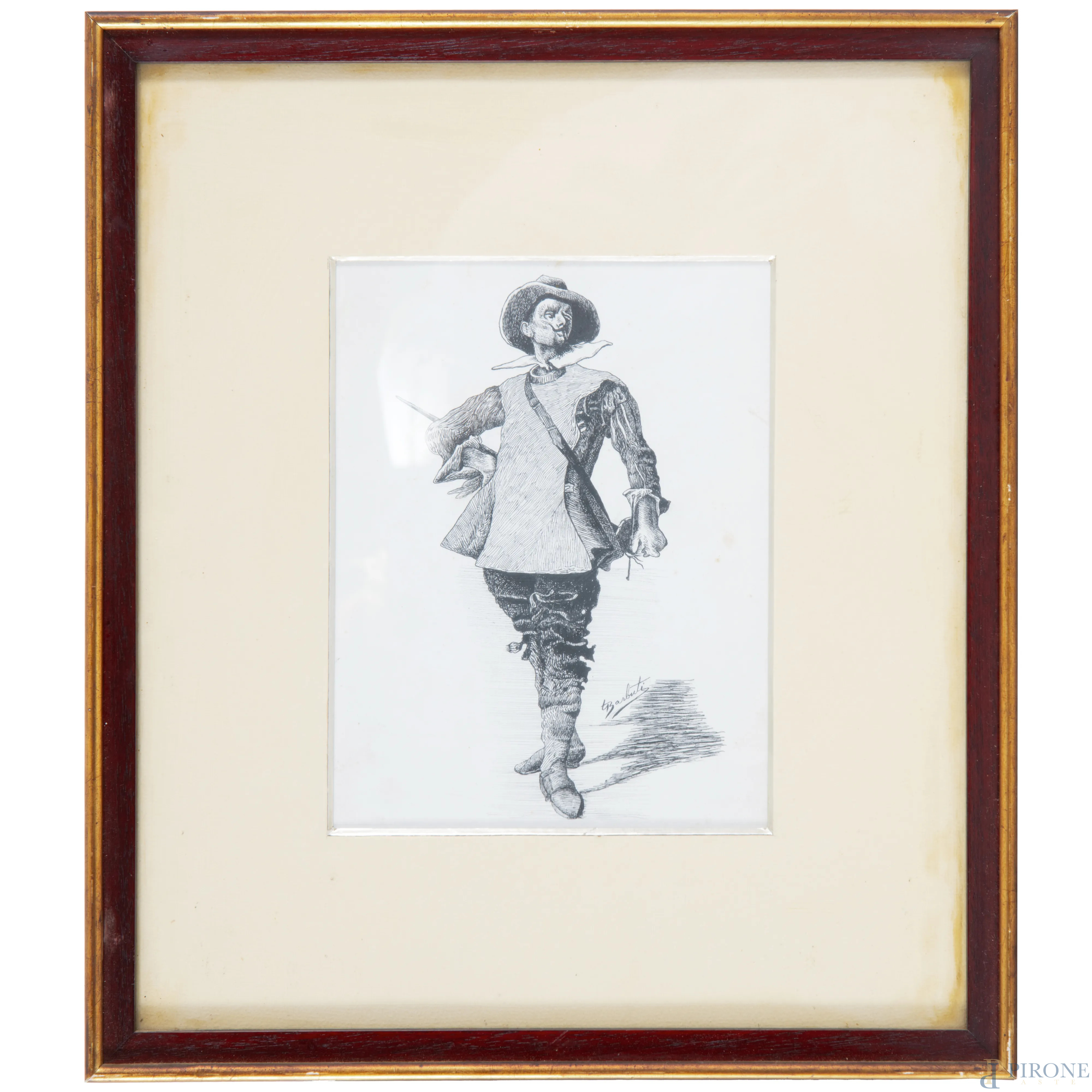 Moschettiere, XX secolo, china su carta, cm 36x31 compreso passepartout, firmato in basso a destra. entro cornice (lievi tracce di umidità)