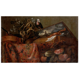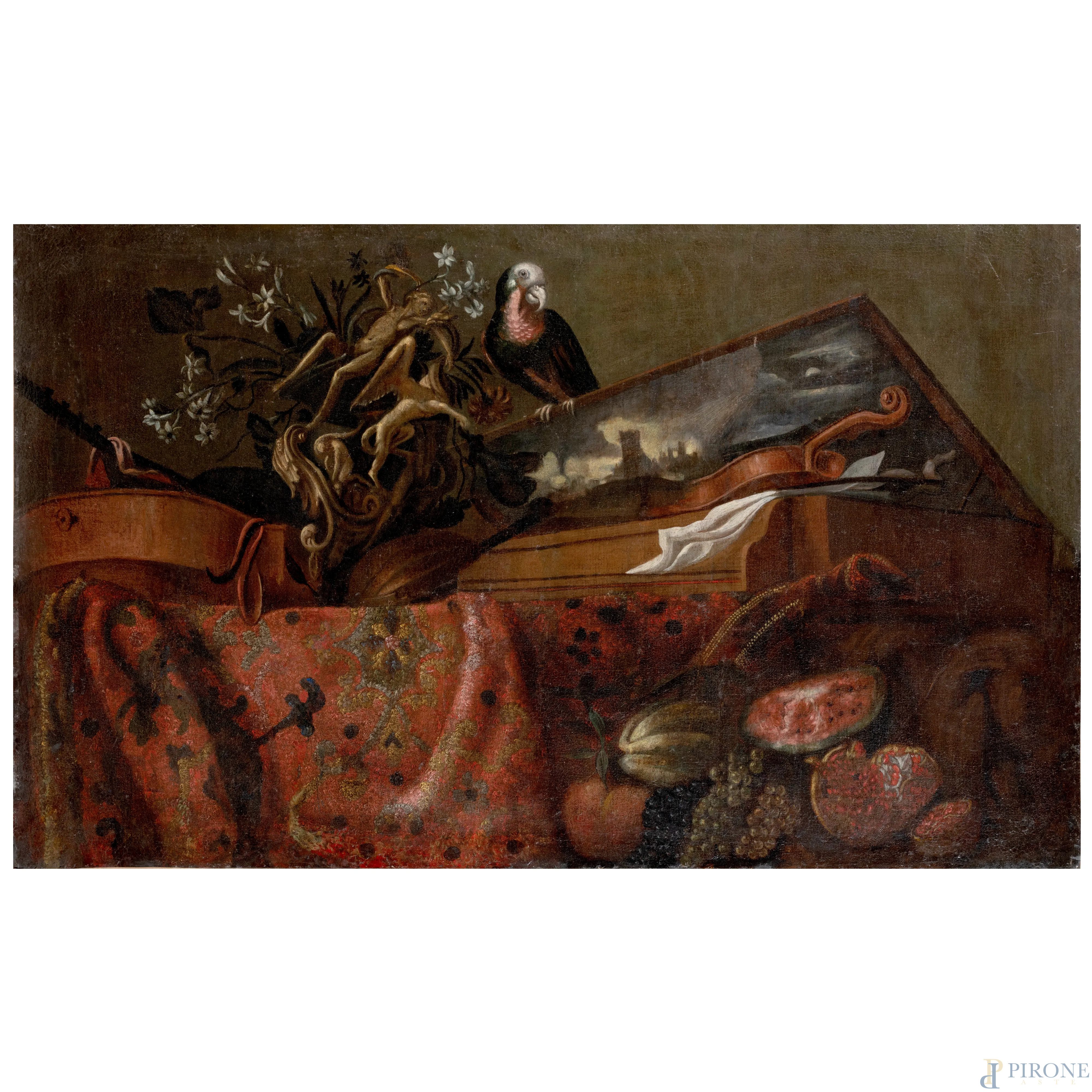 Natura morta con strumenti musicali, drappeggio e pappagallo, XVII-XVIII secolo, olio su tela, cm 84,5x139
