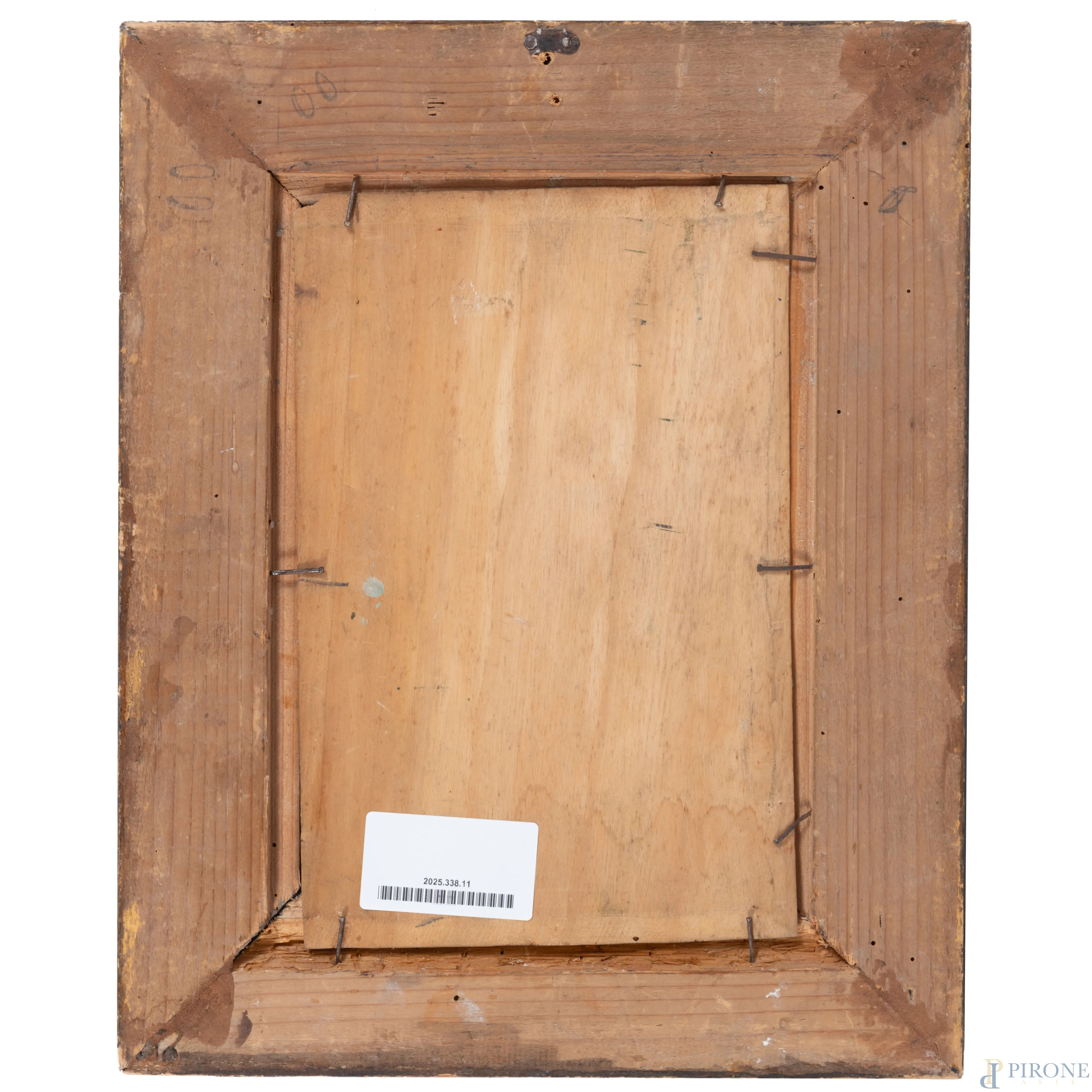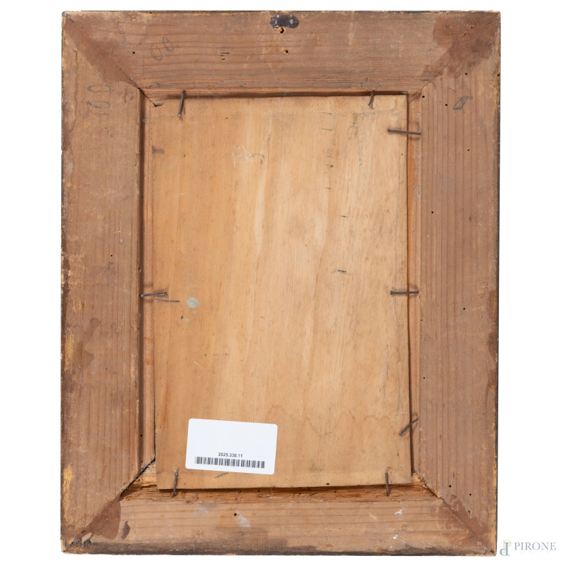 Nicola Biondi (1866-1929), Scorcio di parco con pozzo, , olio su tavoletta, cm 24x16,5, firmato in basso a sinistra, entro cornice, (piccola lacuna all'angolo superiore destro e fessurazione)