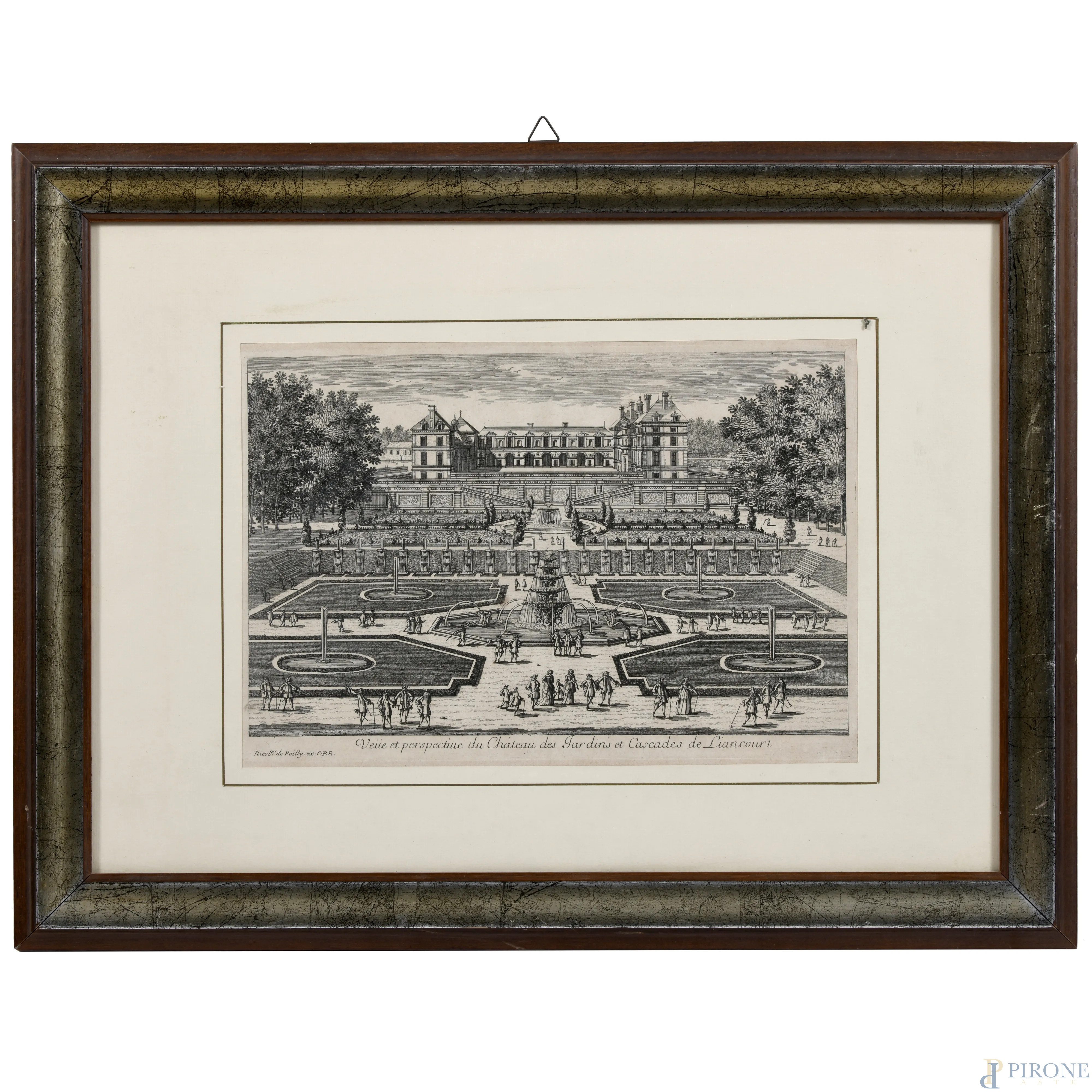 Nicolas de Poilly, acquaforte raffigurante Veduta dei giardini di Liancourt, cm 34x47 compreso passepartout, entro cornice