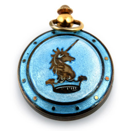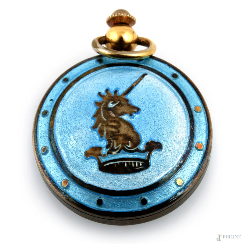 Orologio da tasca Welsbro in oro 14 kt e smalti, cm 3,7x2,8, (difetti, da revisionare)