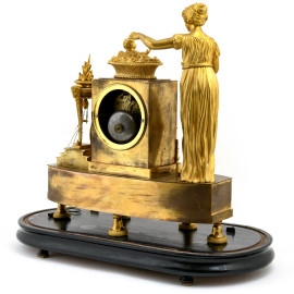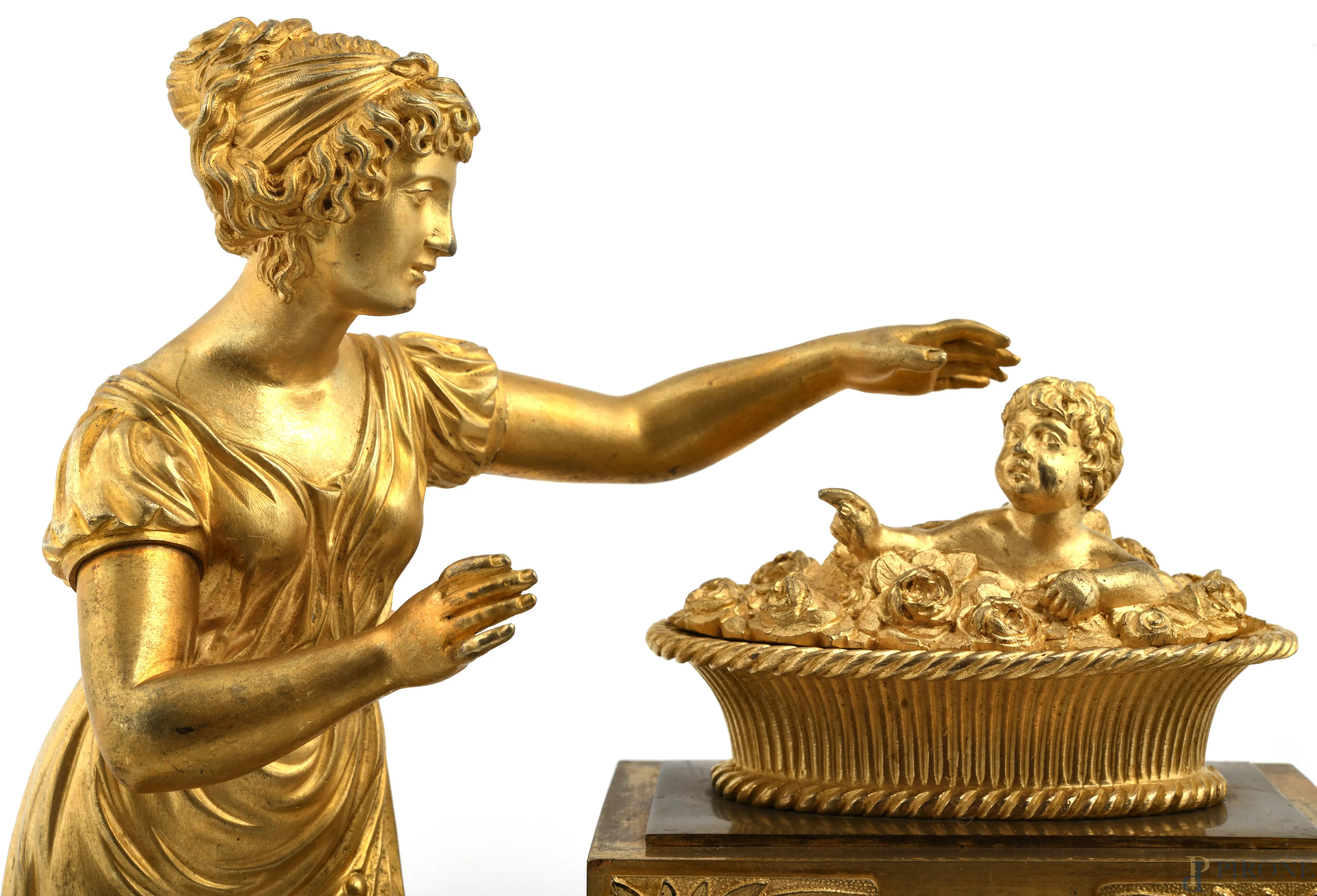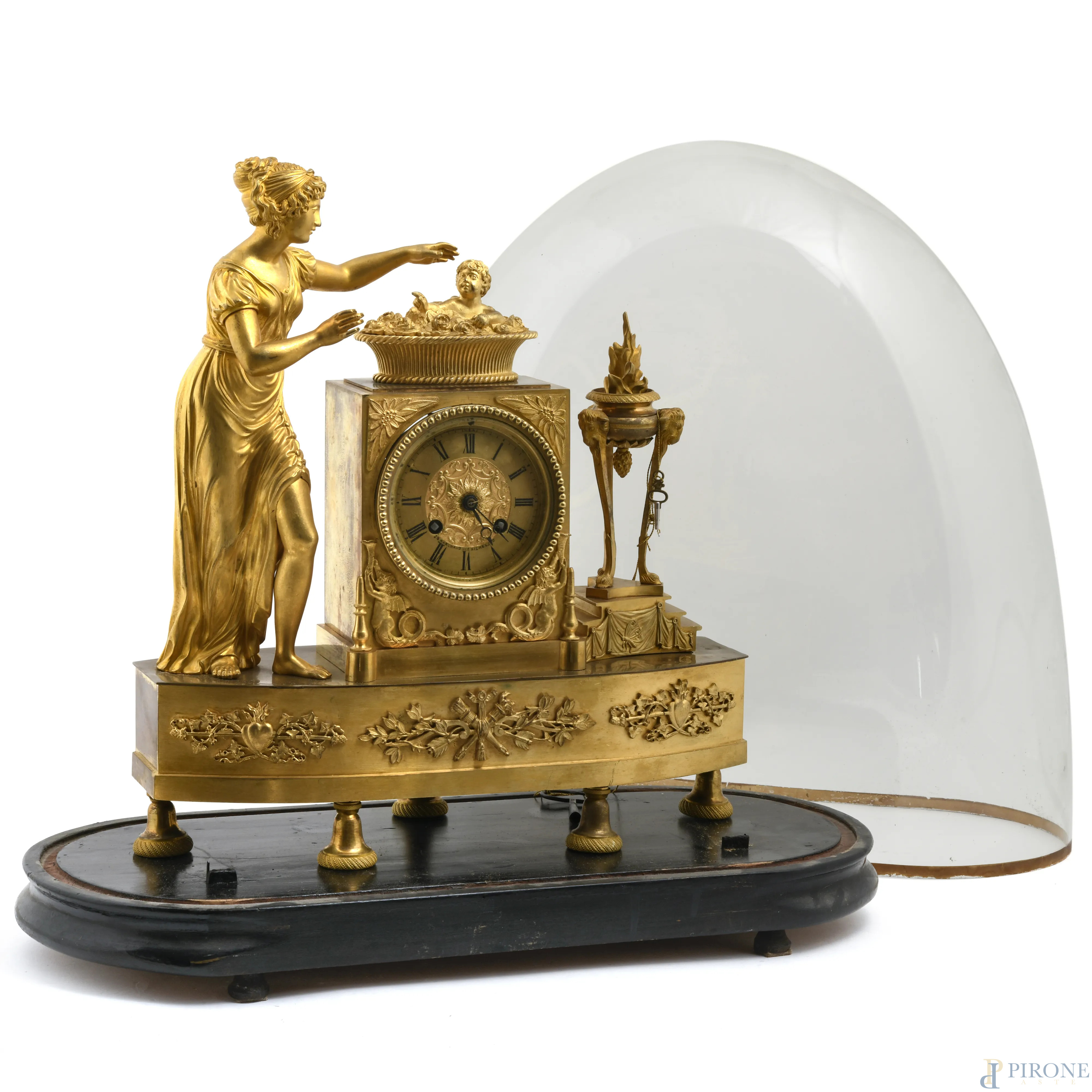 Orologio in bronzo dorato con fanciulla ed amorino. Quadrante a smalto in numeri romani. Entro campana in vetro su base in legno, XIX-XX secolo, cm 48x44x22, (segni di usura, difetti, da revisionare)