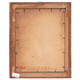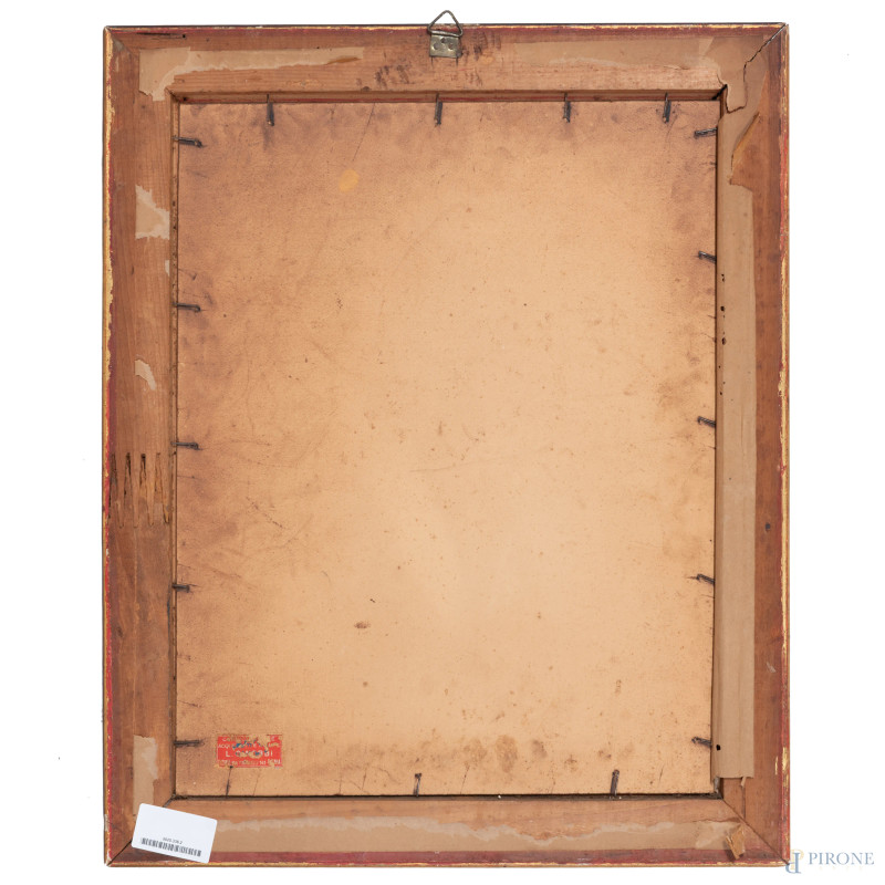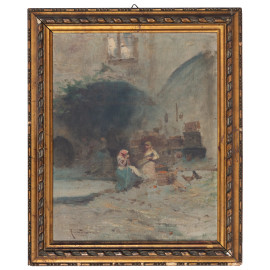 Oscar Ricciardi, (1864-1935), Donne nell'aia, olio su tela applicata su compensato, cm 48x38, firmato in basso a sinistra, entro cornice, (supporto imbarcato)