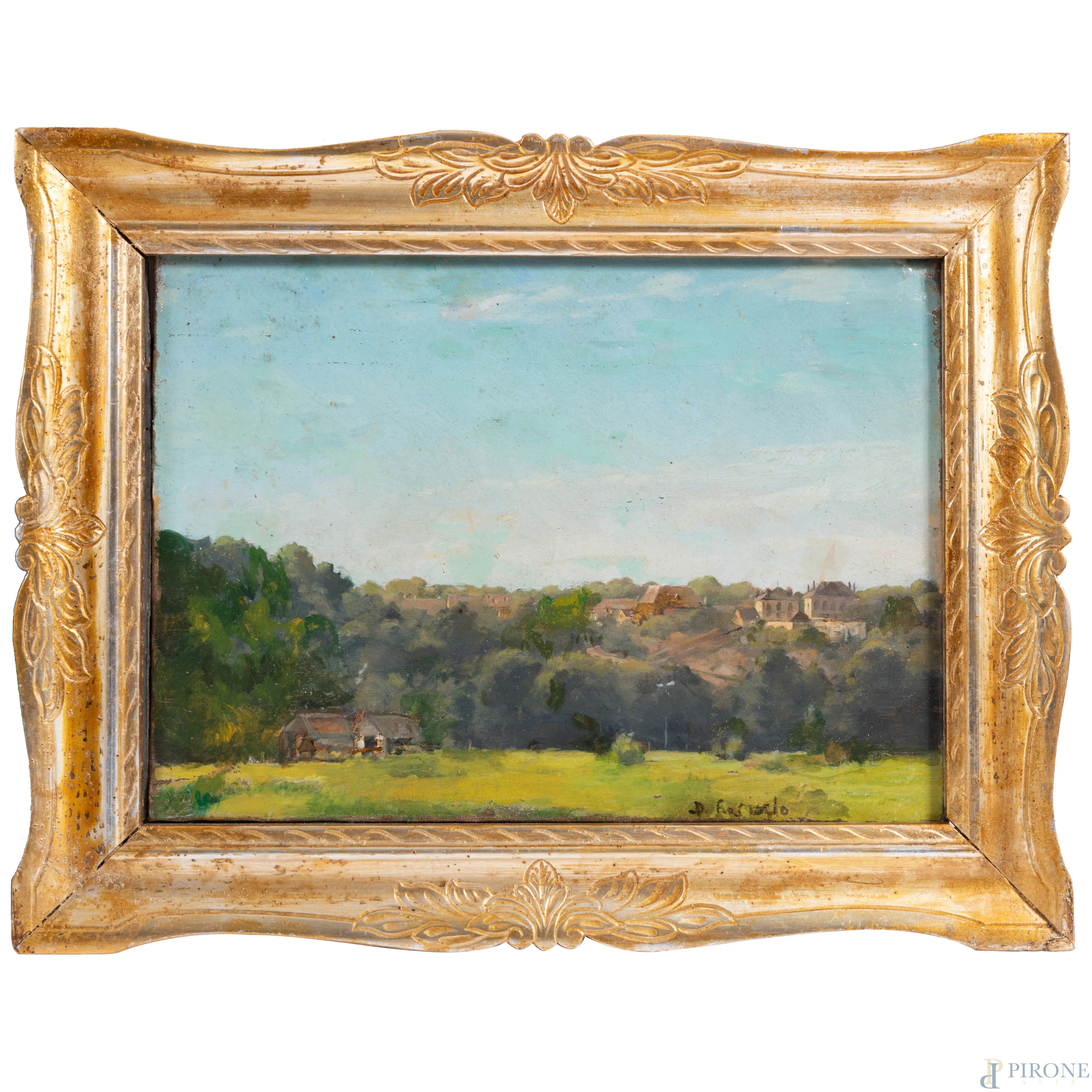 Paesaggio con case, XX secolo, olio su tela, cm 20x27,5, firmato, entro cornice,