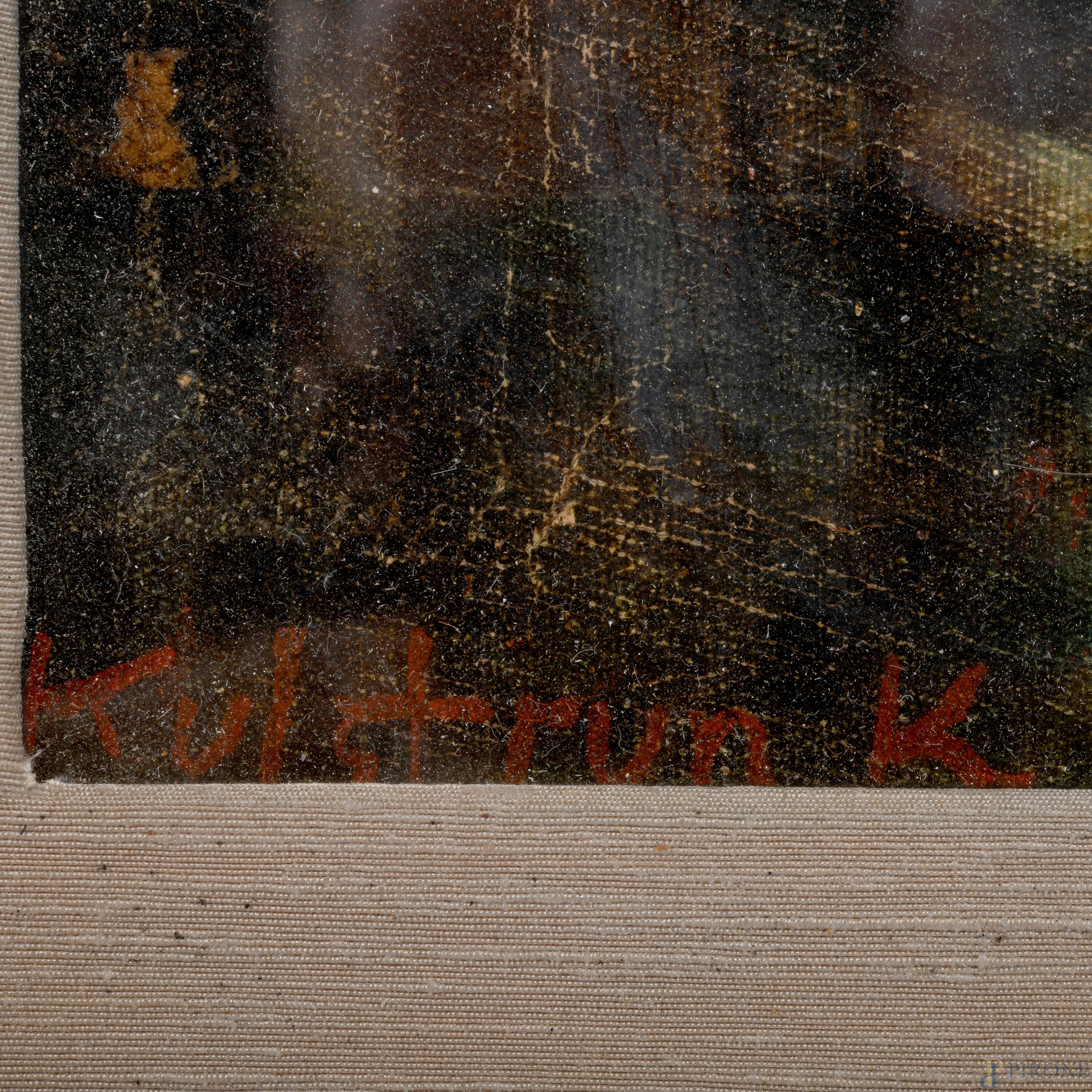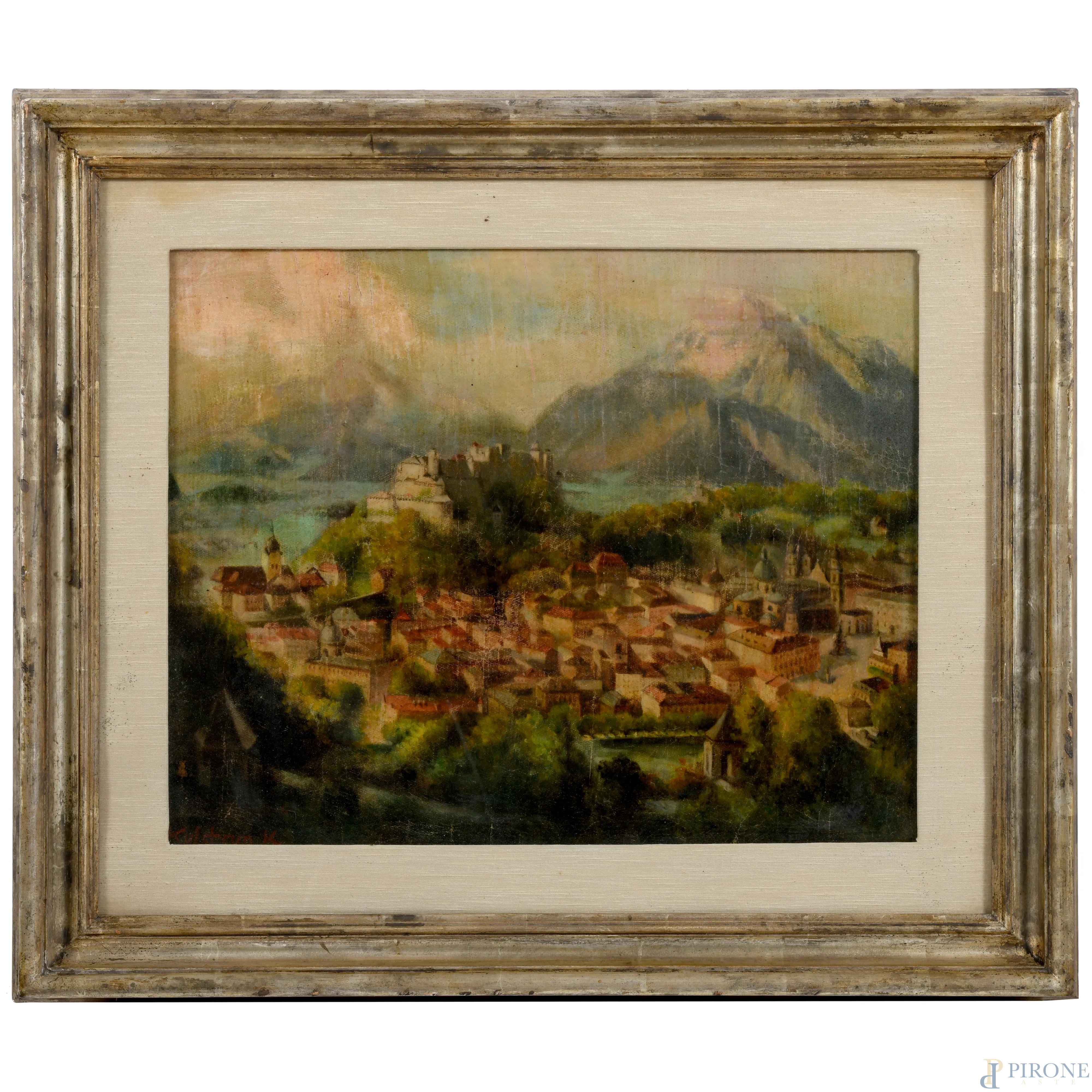 Paesaggio montano con città, olio su tela, cm 45x55, firmato, entro cornice