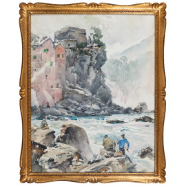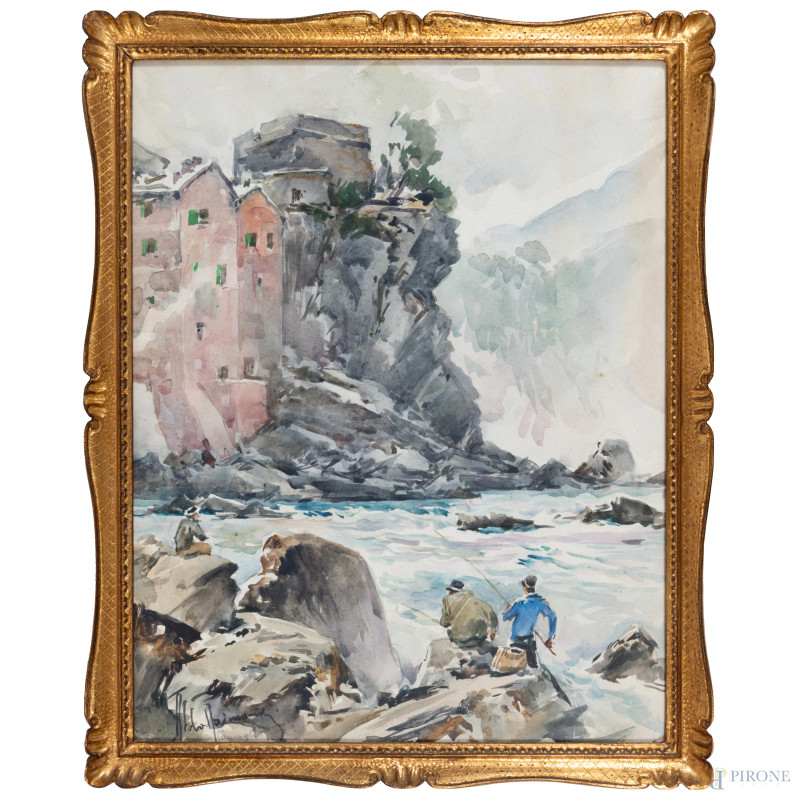 Pescatori sugli scogli, XX secolo, acquerello su carta, cm 47x37, firmato in basso a sinistra, entro cornice