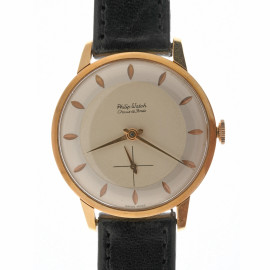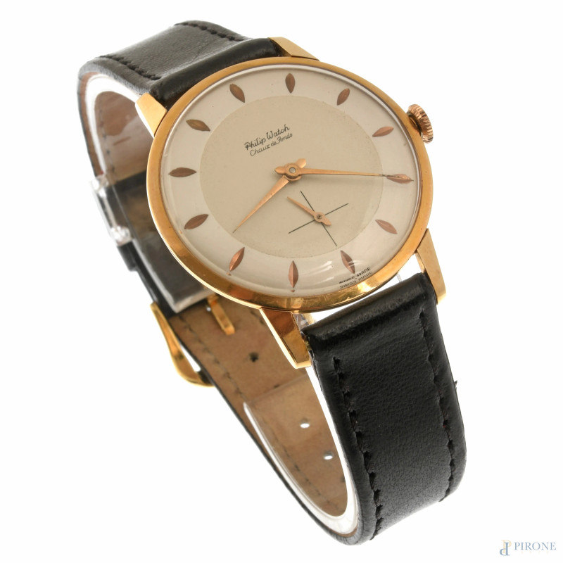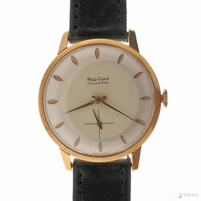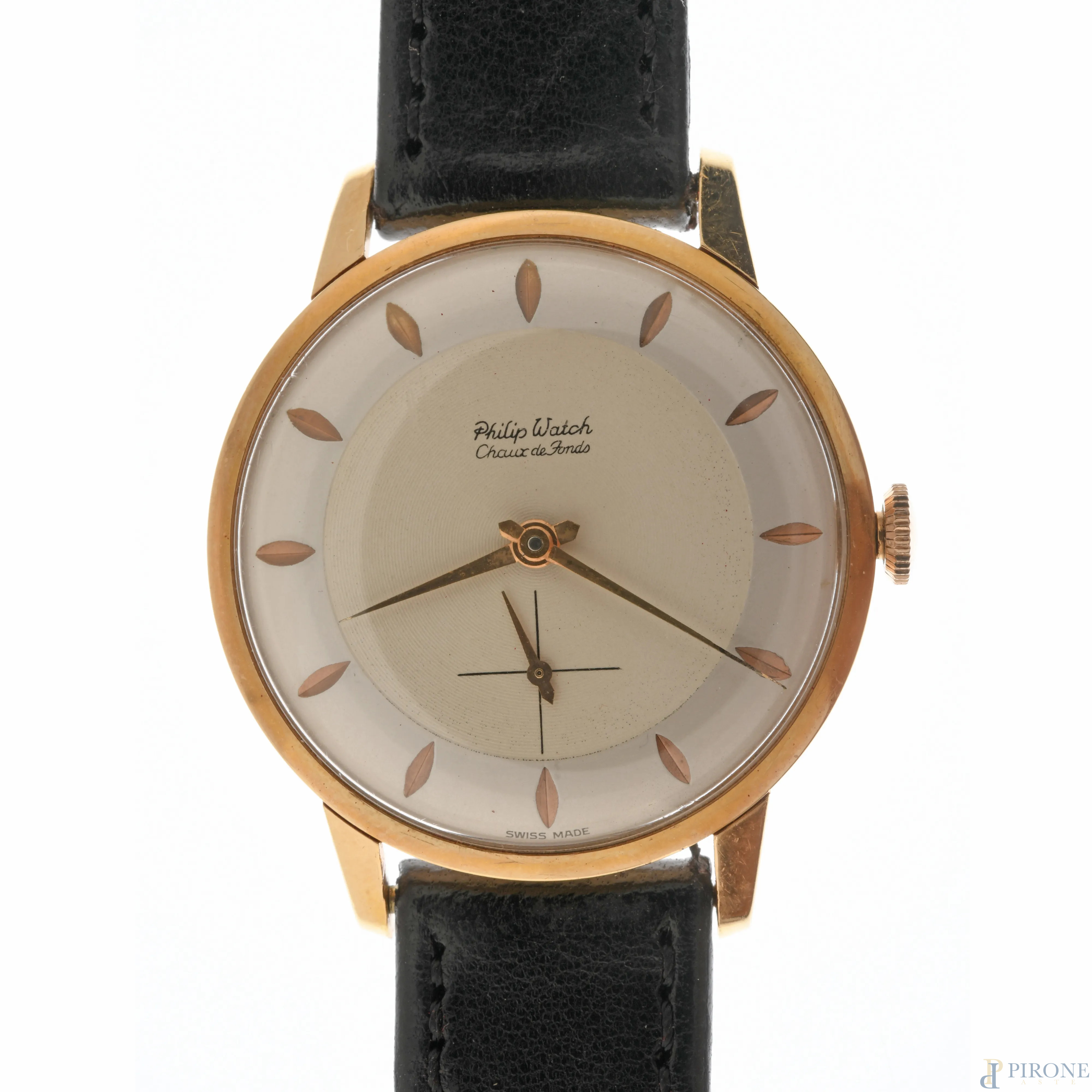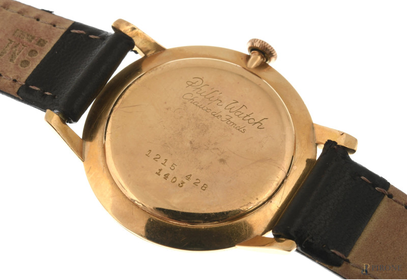 Philip Watch Chaux de Fonds, in oro 750 con cinturino in pelle nera, misura cassa cm 3,5, lunghezza cinturino cm 24,5, (da revisionare, segni di usura)