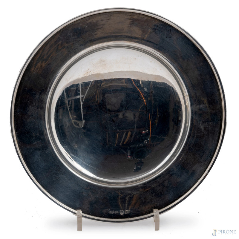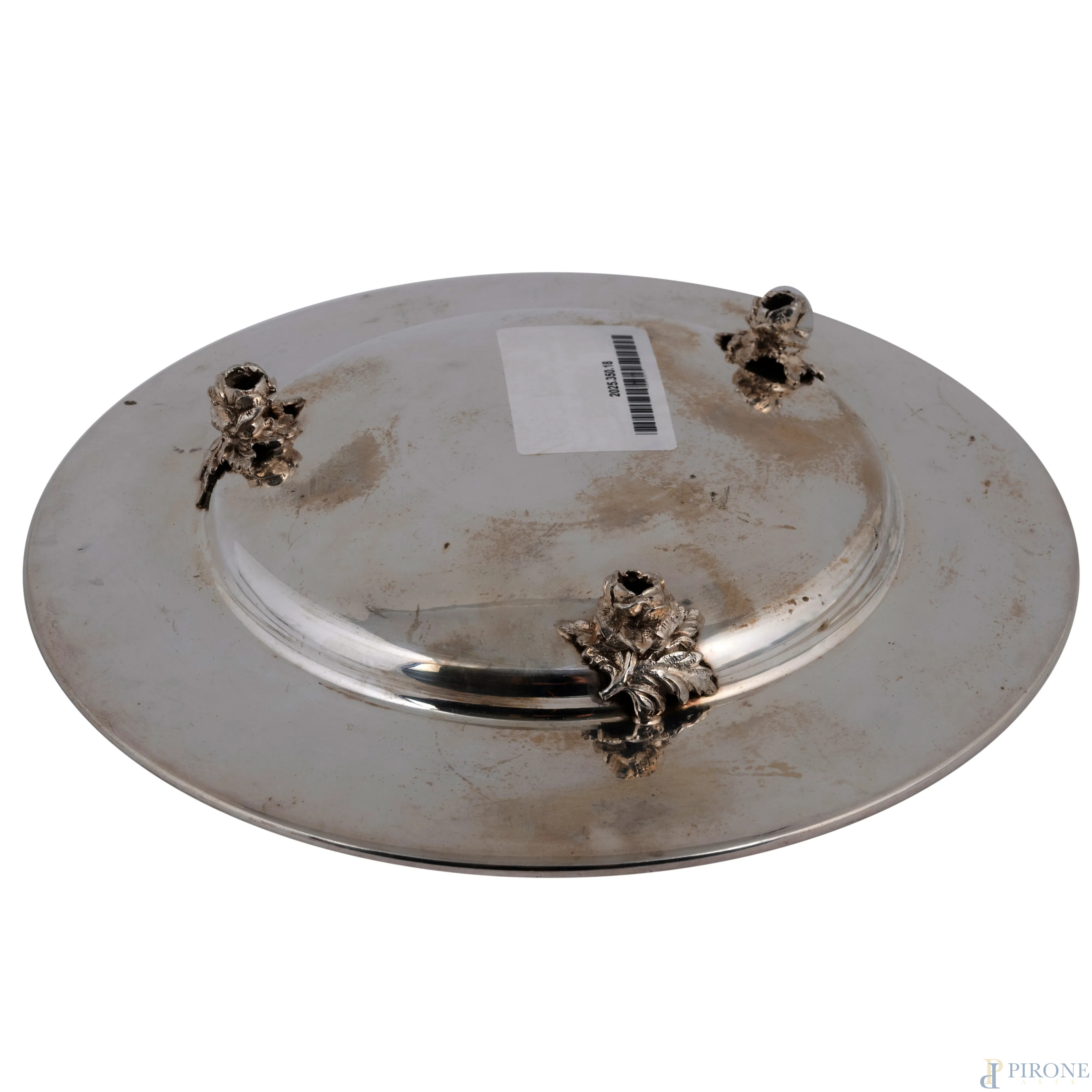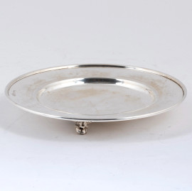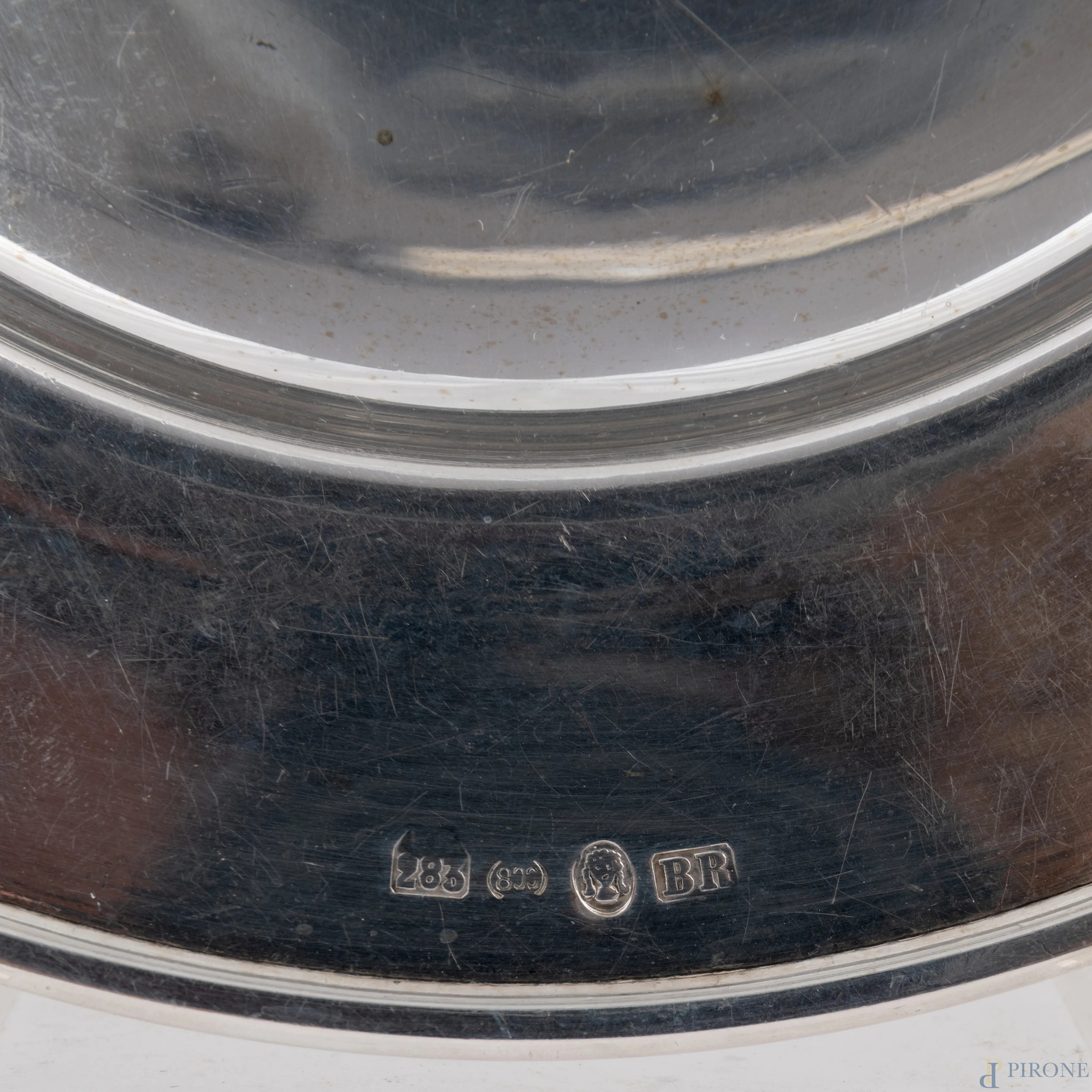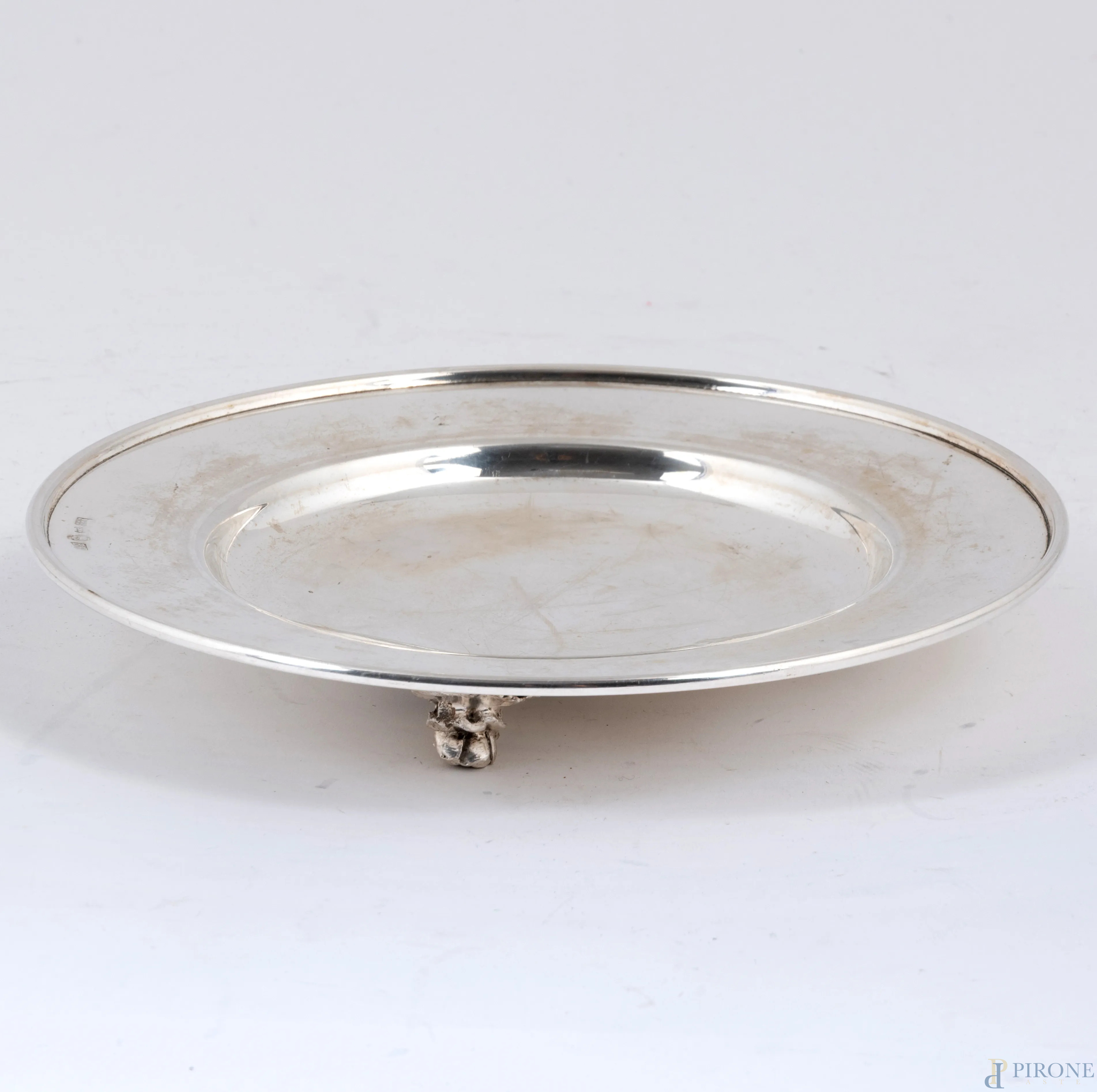 Piattino in argento 800/000 poggiante su tre piedini, XX secolo, cm 3,5x21, peso gr 330