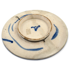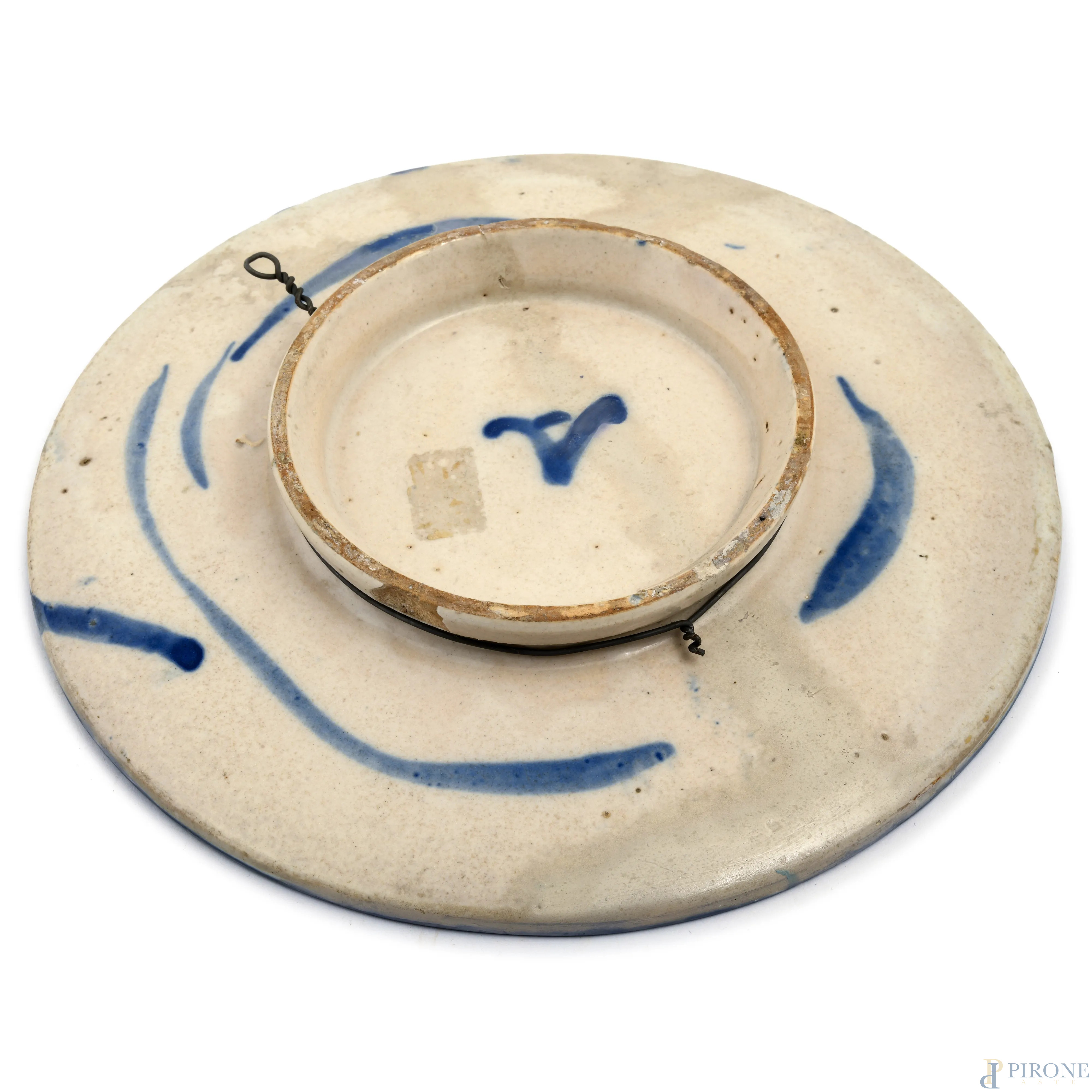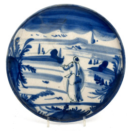 Piatto in ceramica blu con figura in un paesaggio, XX secolo, diametro cm 24,5, (felature, scalfiture, cadute di colore, difetti)