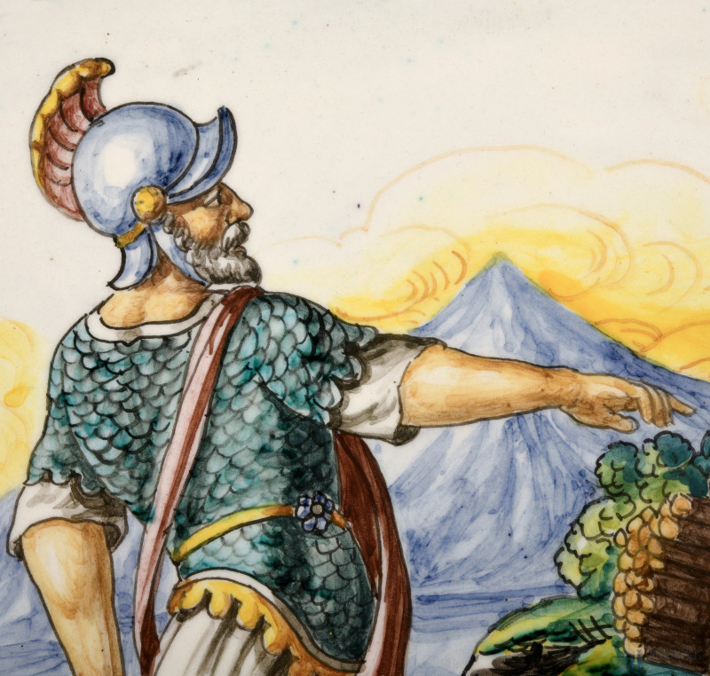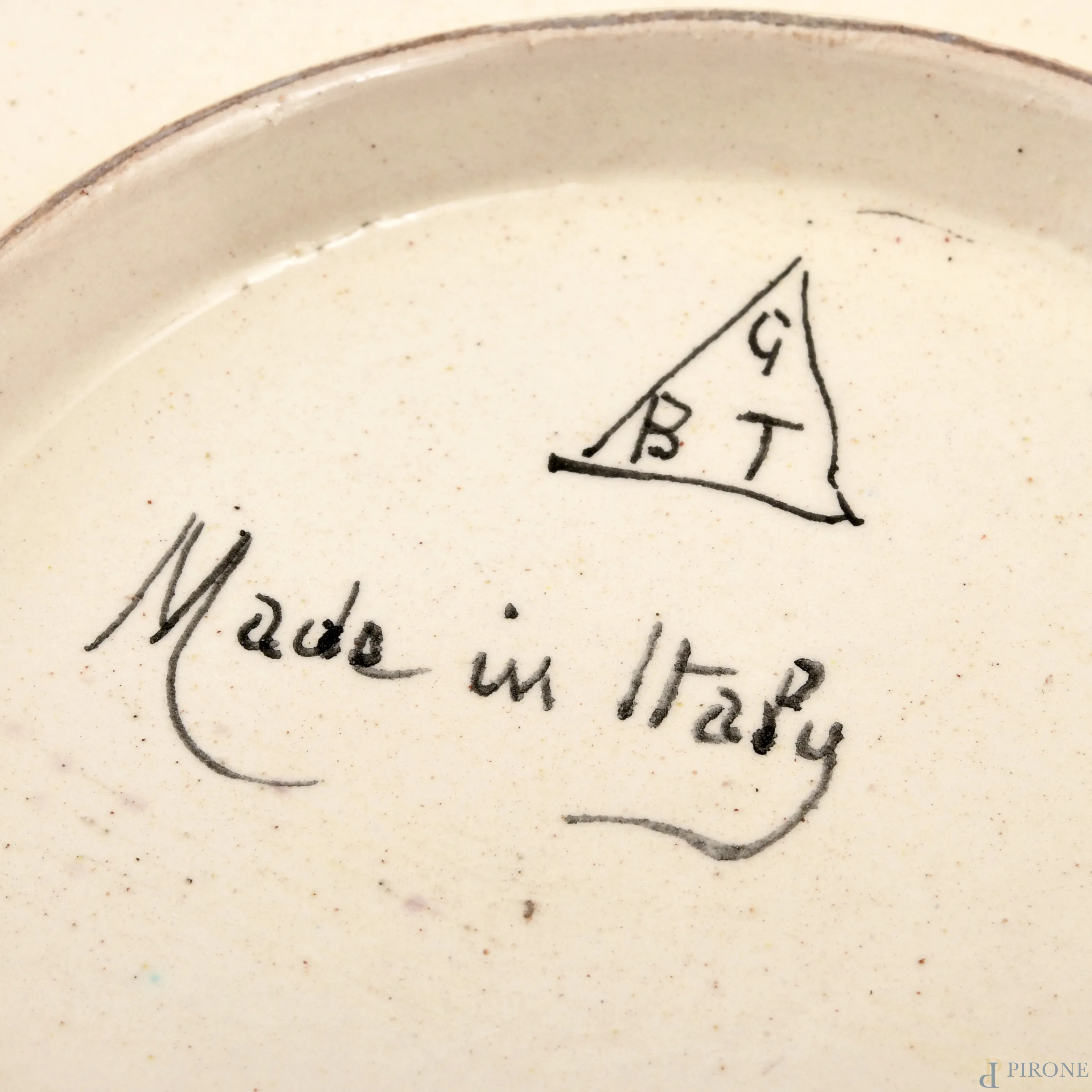 Piatto in ceramica dipinta con coppia di guerrieri, XX secolo, diametro cm 37, al fondo "G.B.T Made in Italy" (segni di usura, piccole cadute di smalto, difetti di cottura)