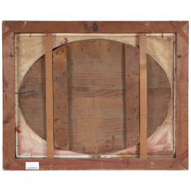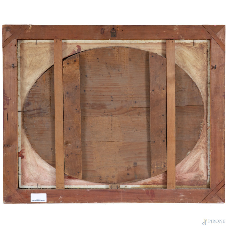 Piazza con figure, XIX secolo, olio su tavola a serto ovale, cm 50x66, entro cornice, (fessurazioni del supporto)