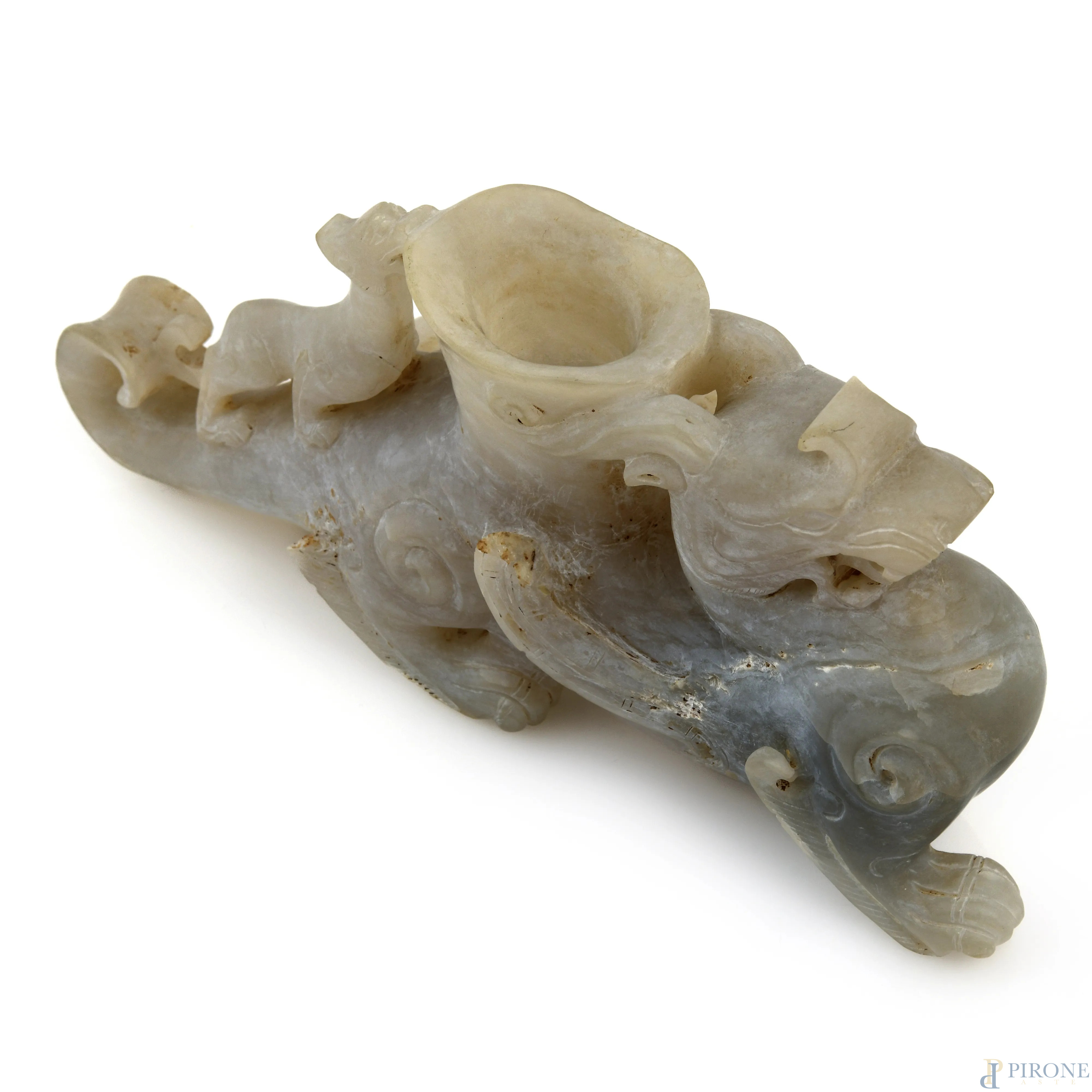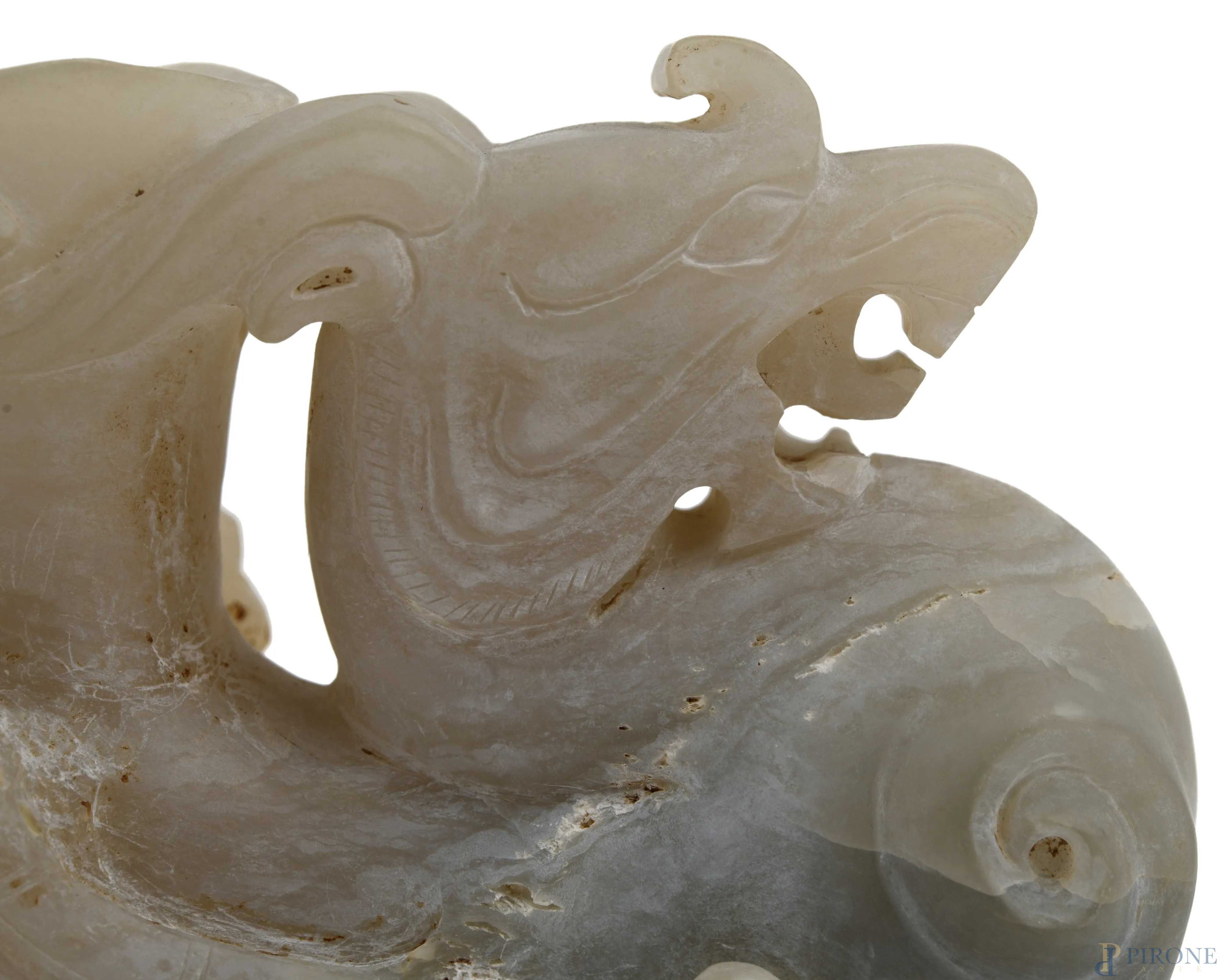 Portacandele a foggia di drago in pietra saponaria bianca, XX secolo, cm 9,5x21x6 (scalfiture, mancanze, rotture)