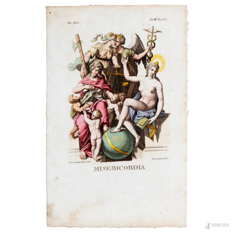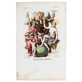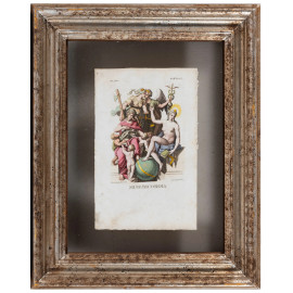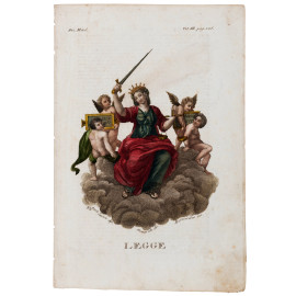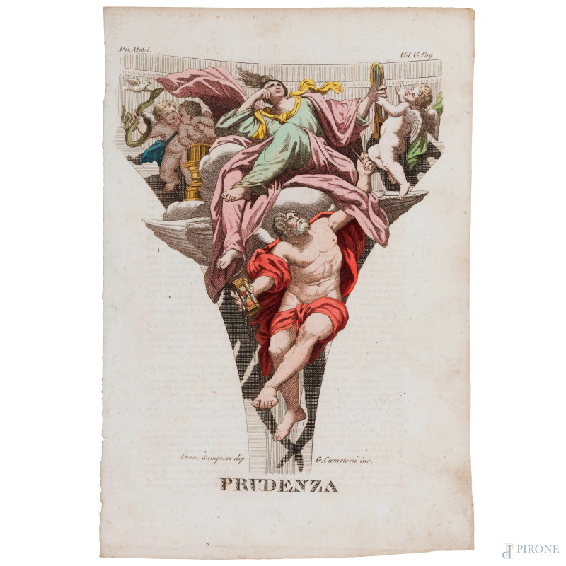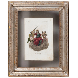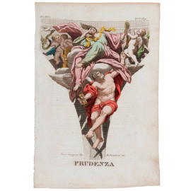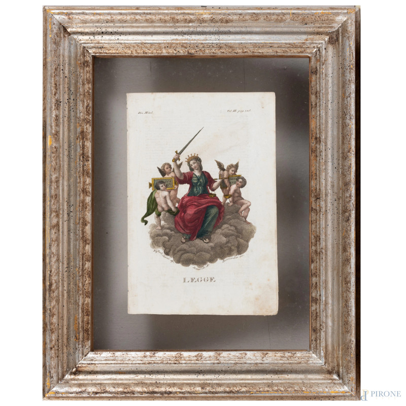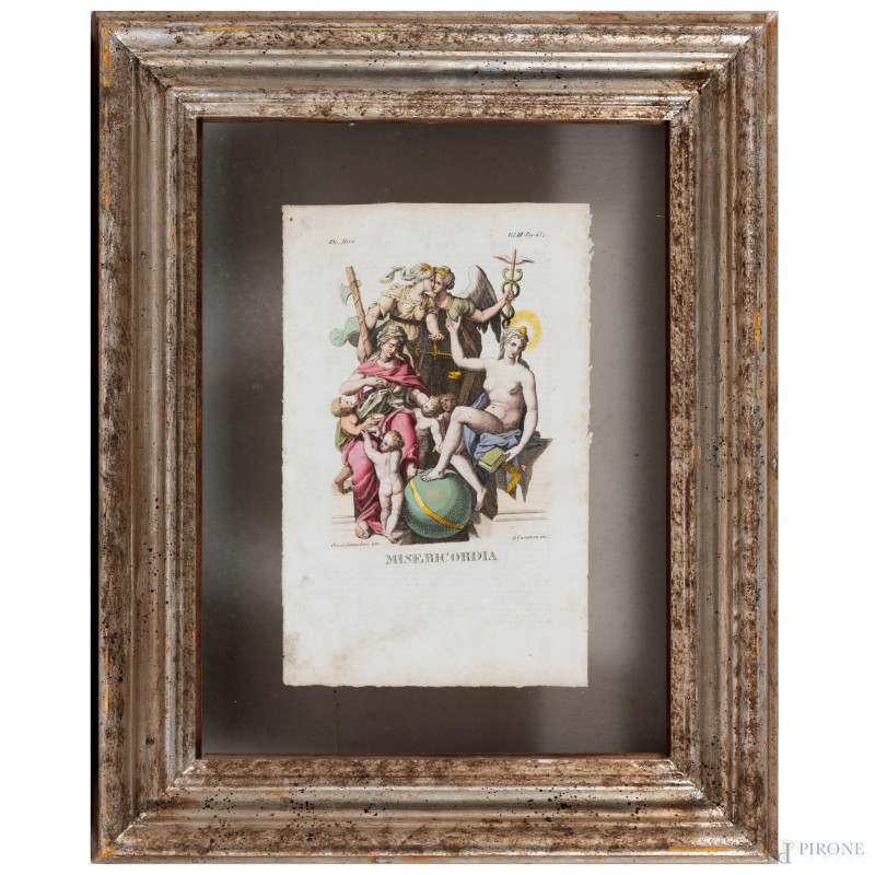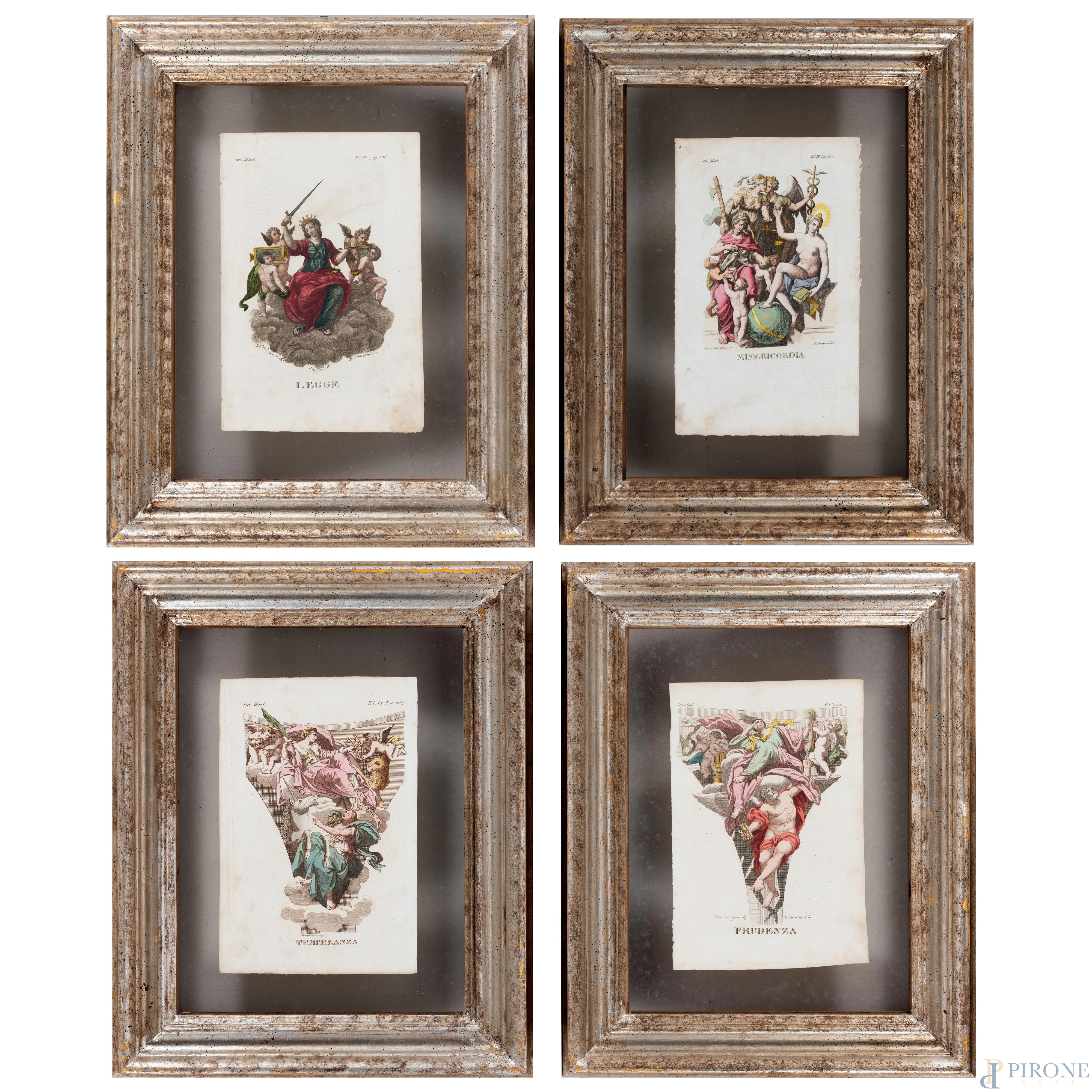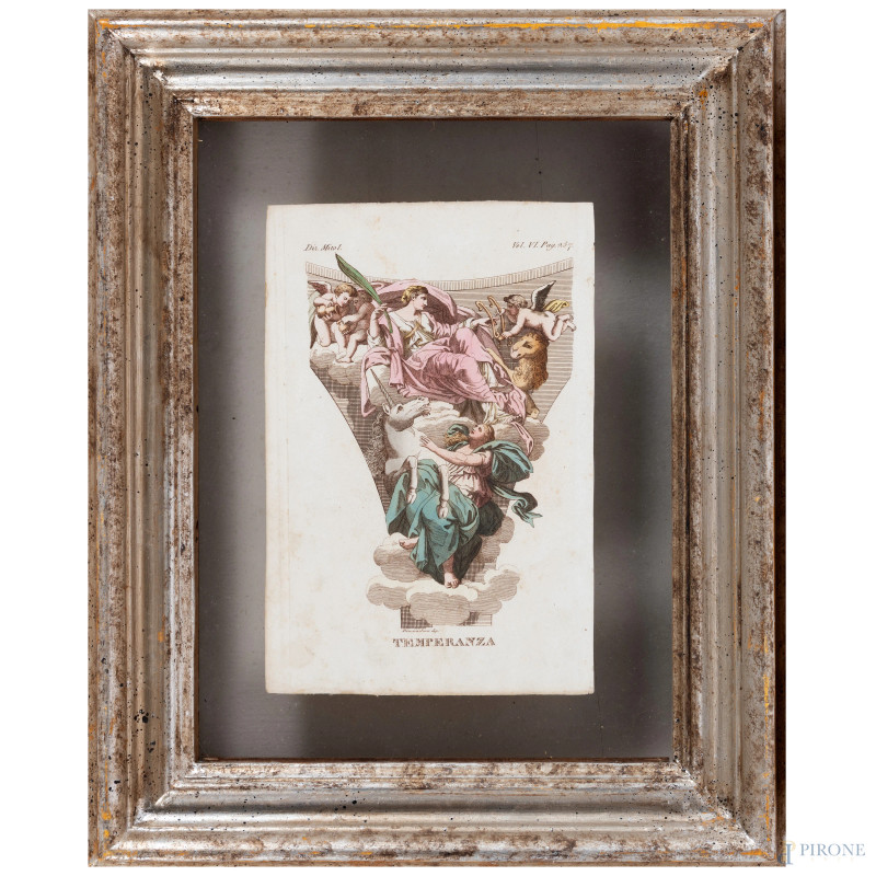 Quattro stampe raffiguranti allegorie delle Virtù, XIX secolo, cm 23x15,5, entro cornice, (segni di usura, tracce di umidità, lievi segni di piegatura, foxing)