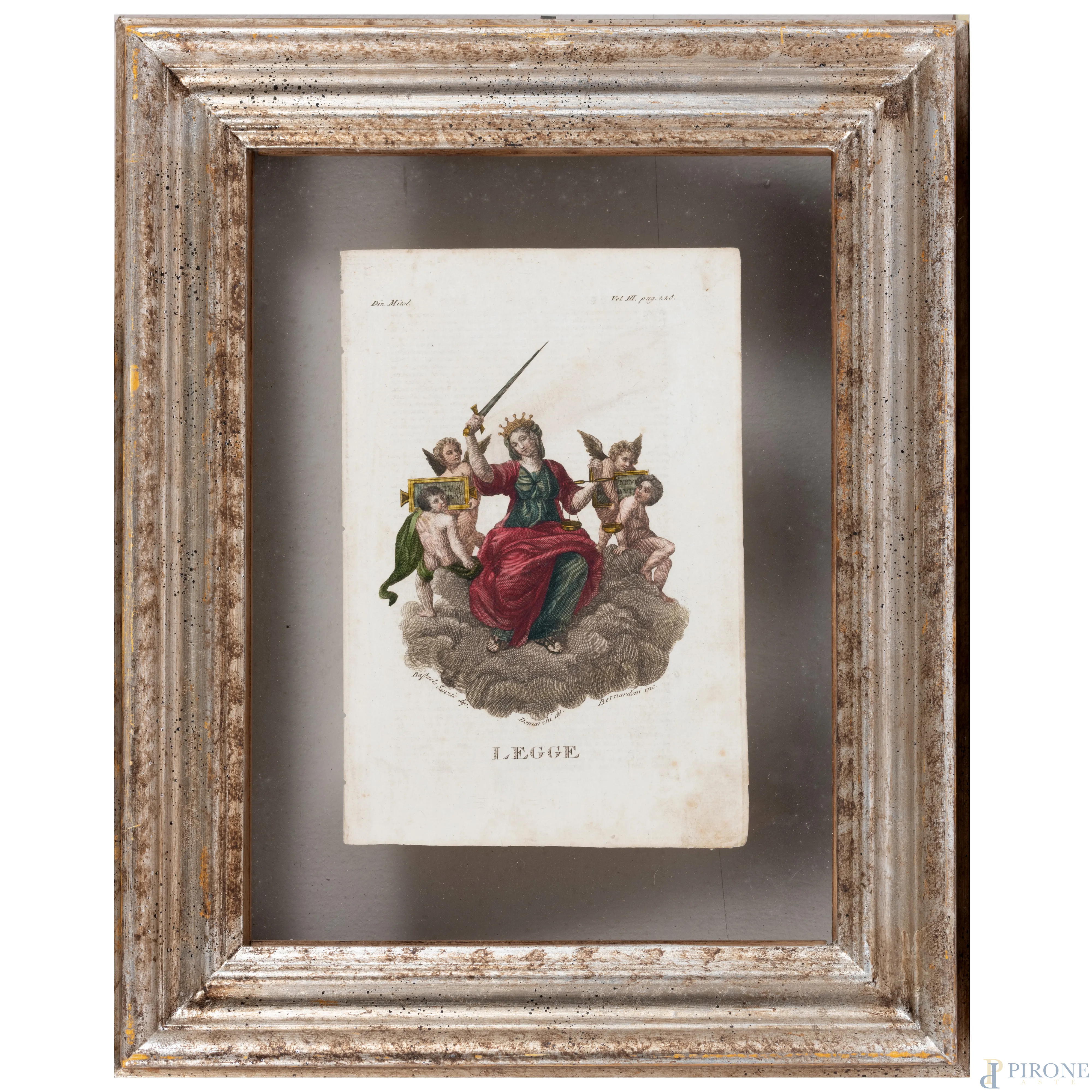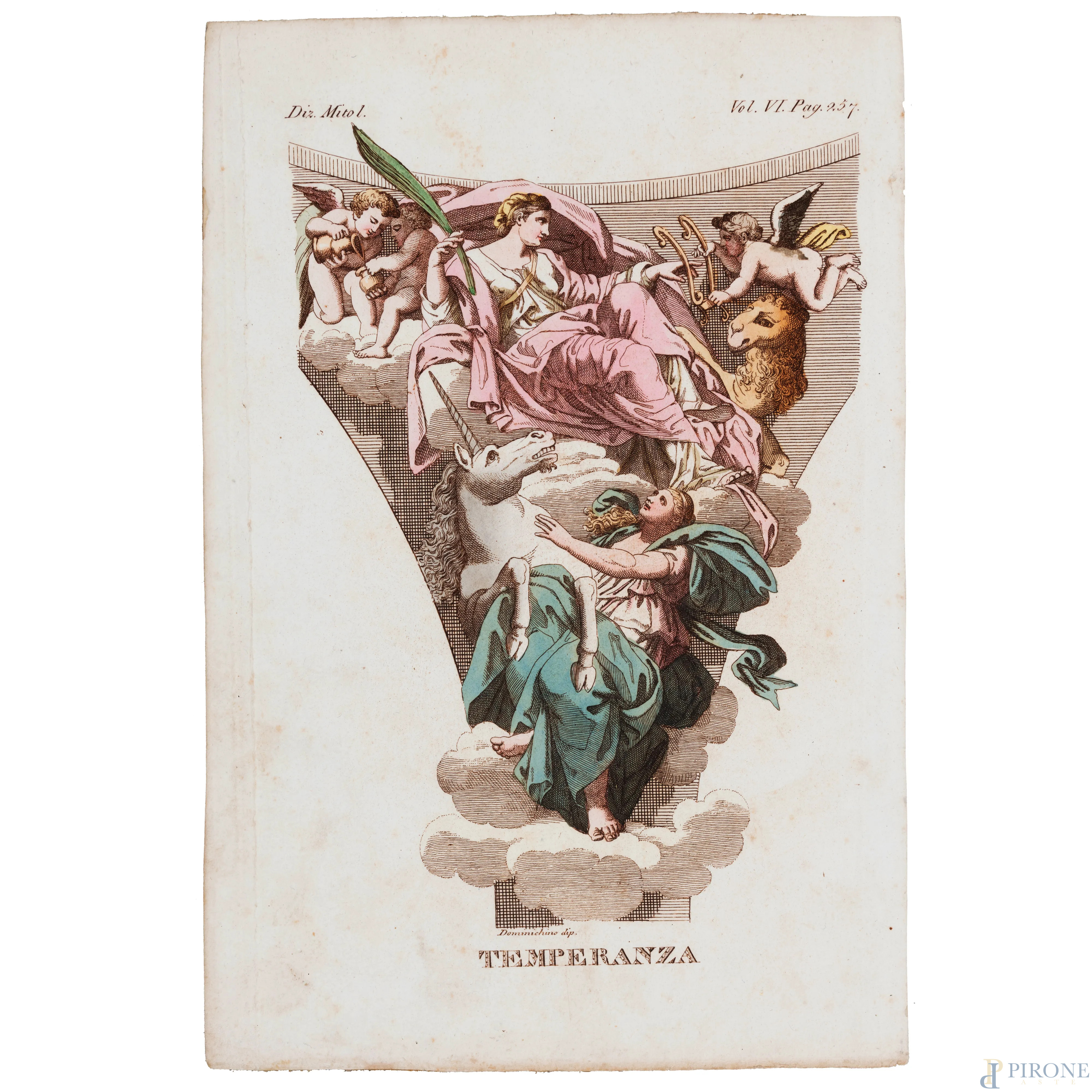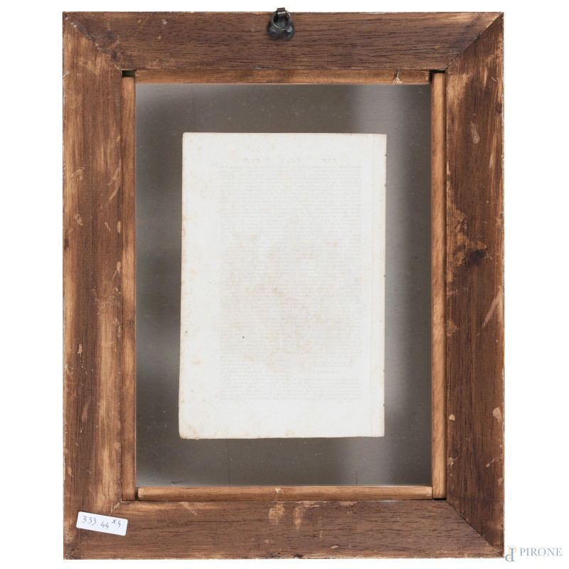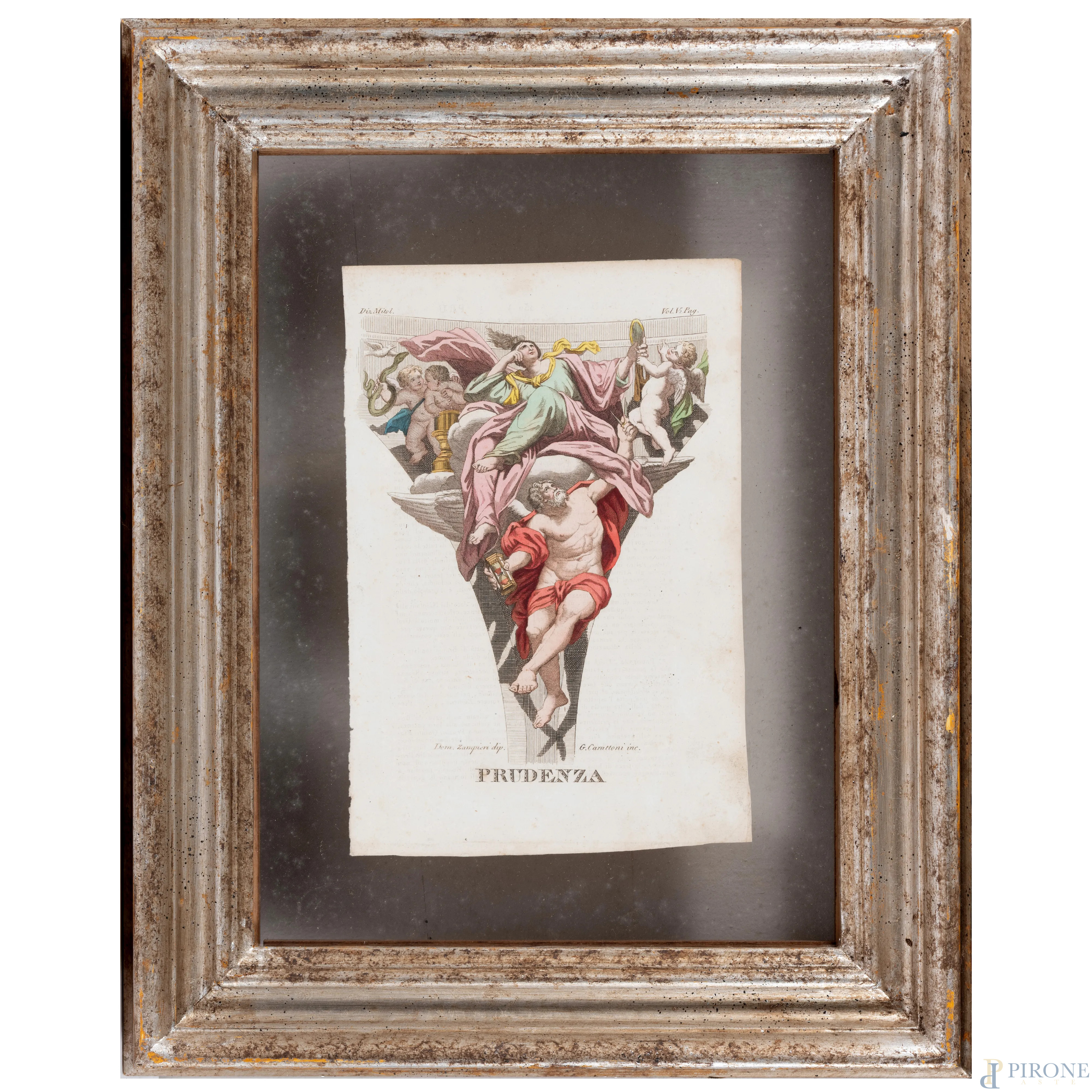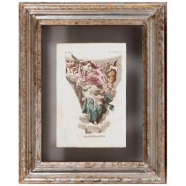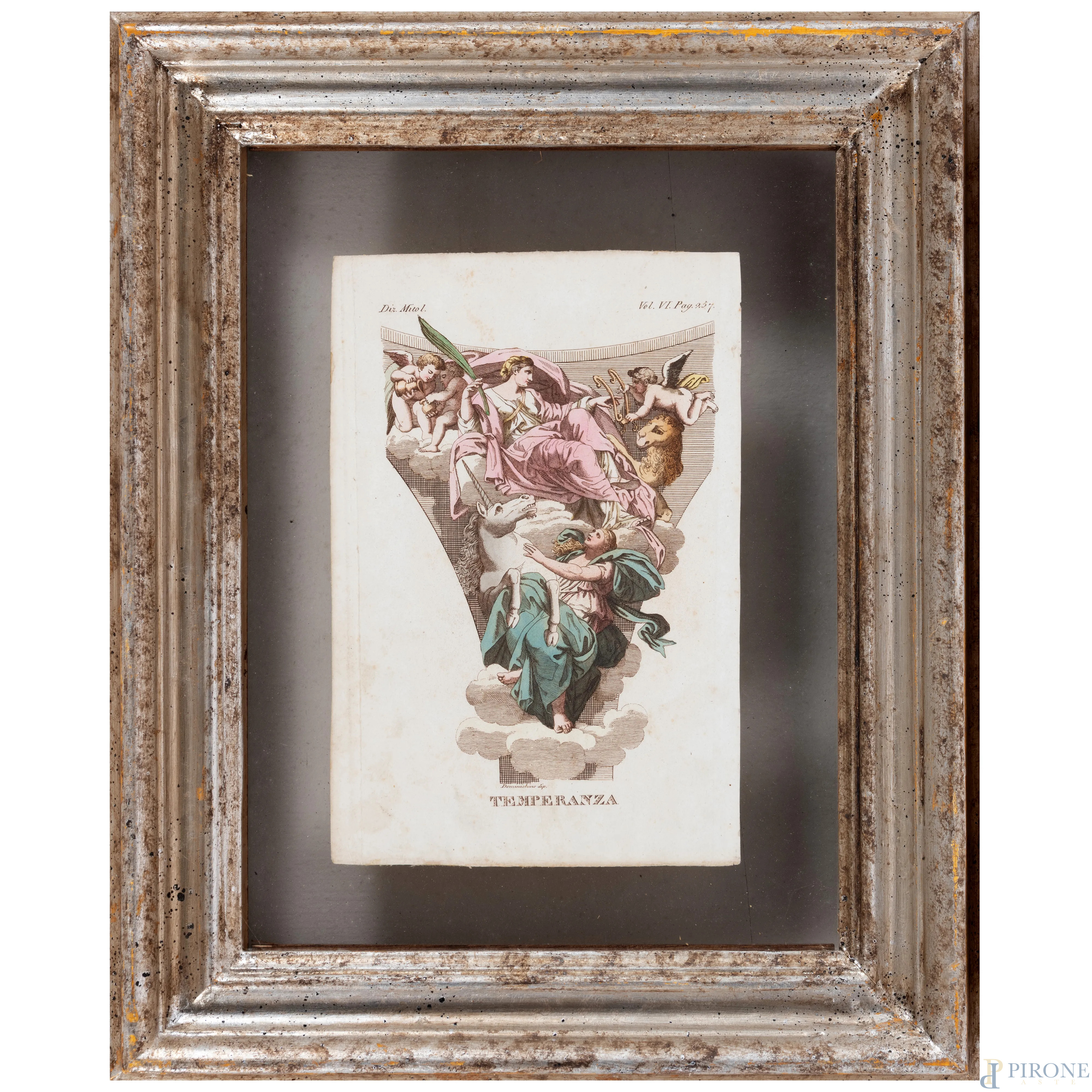 Quattro stampe raffiguranti allegorie delle Virtù, XIX secolo, cm 23x15,5, entro cornice, (segni di usura, tracce di umidità, lievi segni di piegatura, foxing)