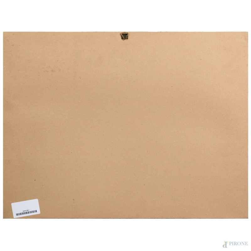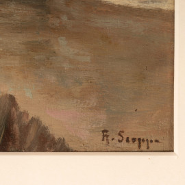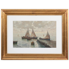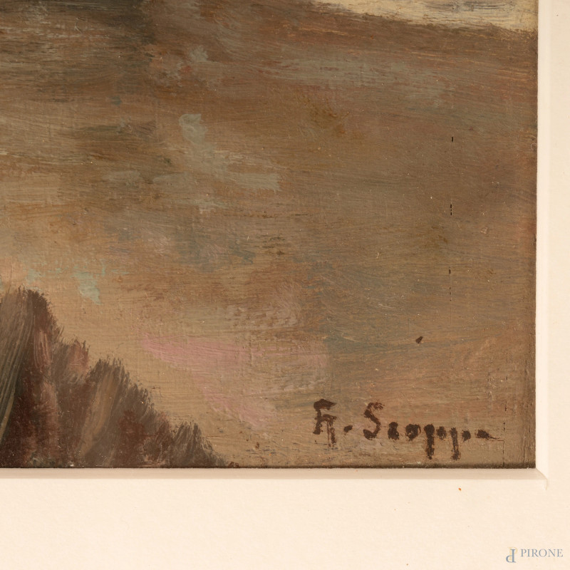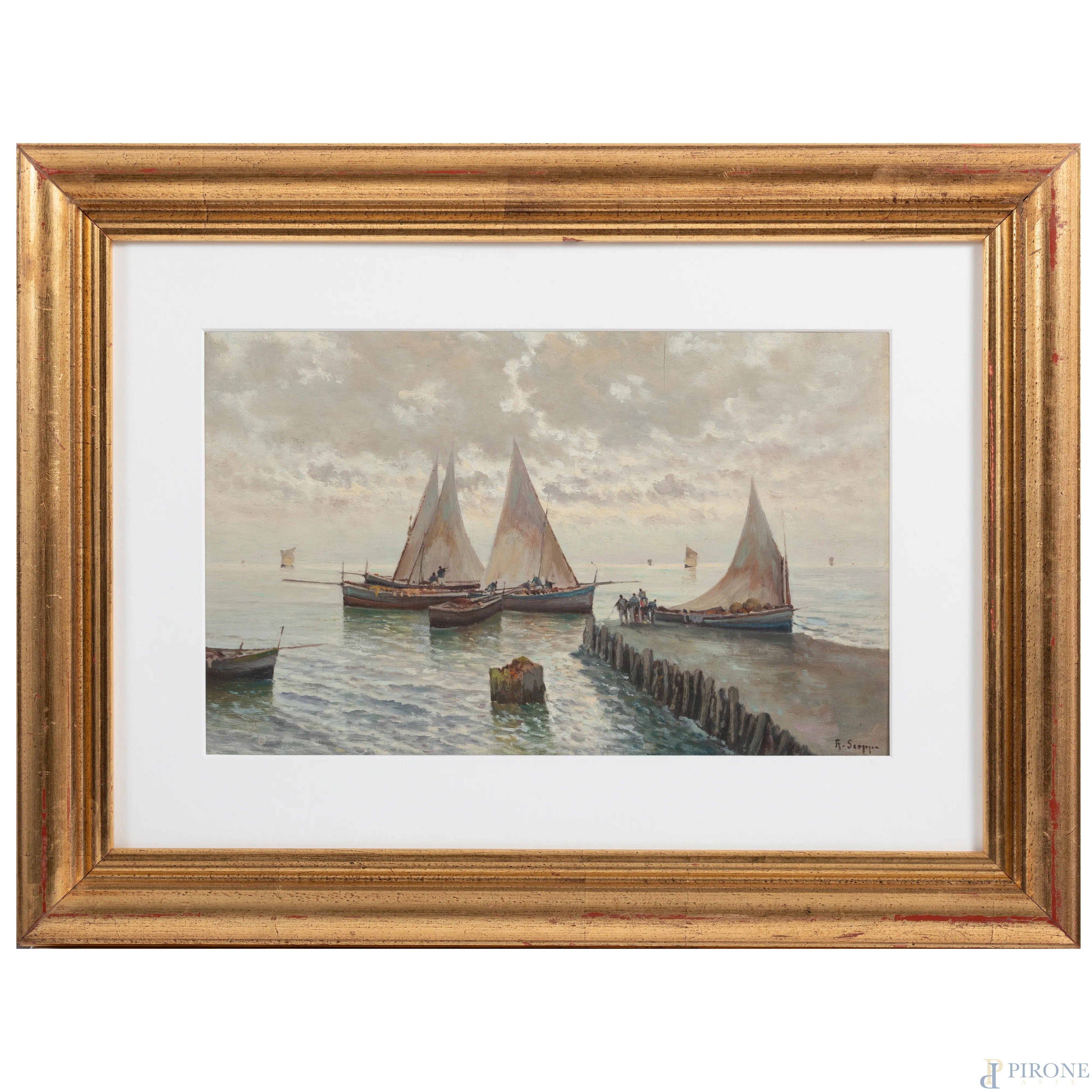 Raimondo Radames Scoppa (1877-1957), Marina con barche dal molo, olio su compensato, cm 20,5x33, firmato in basso a destra, entro cornice
