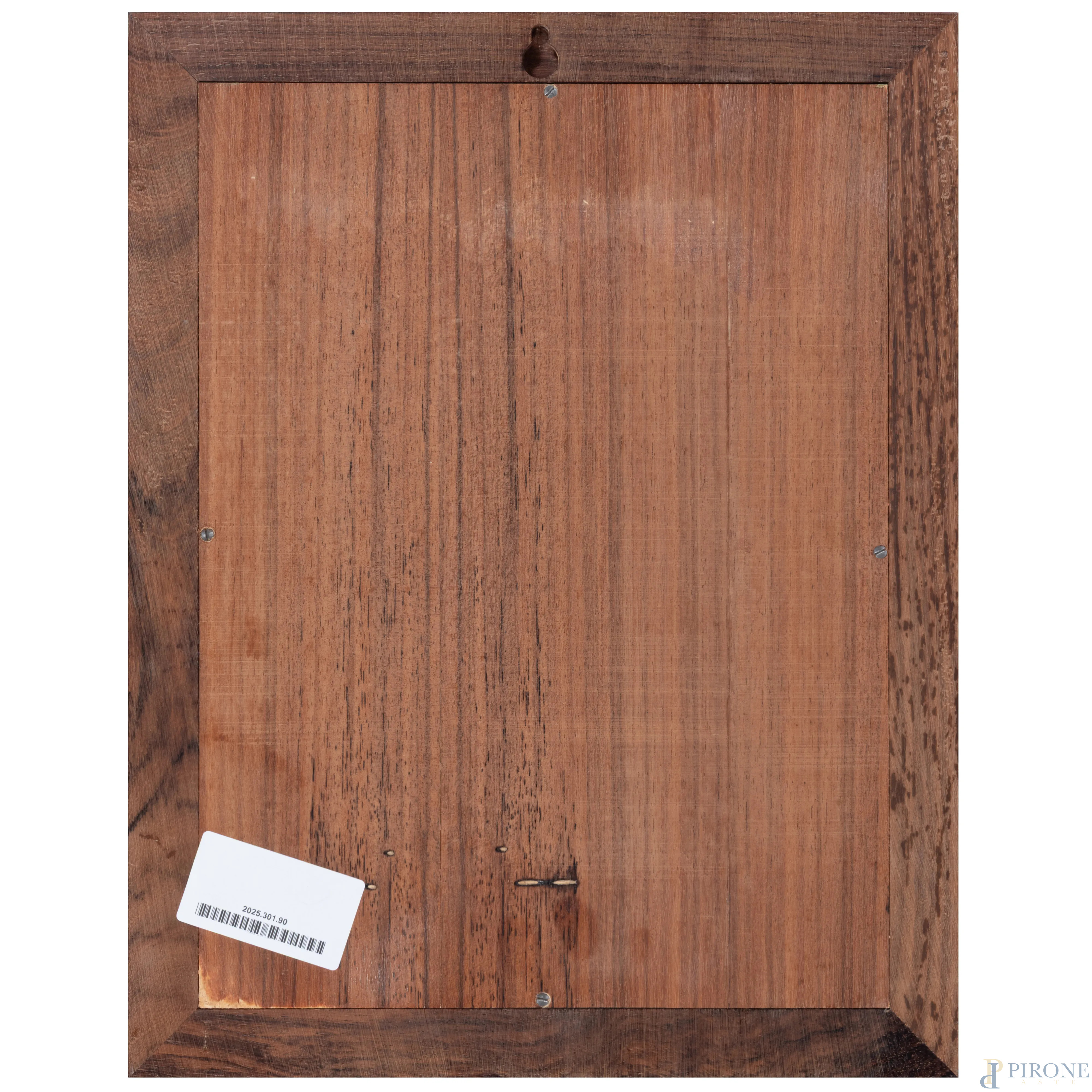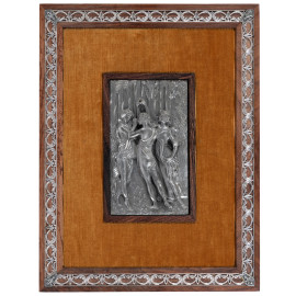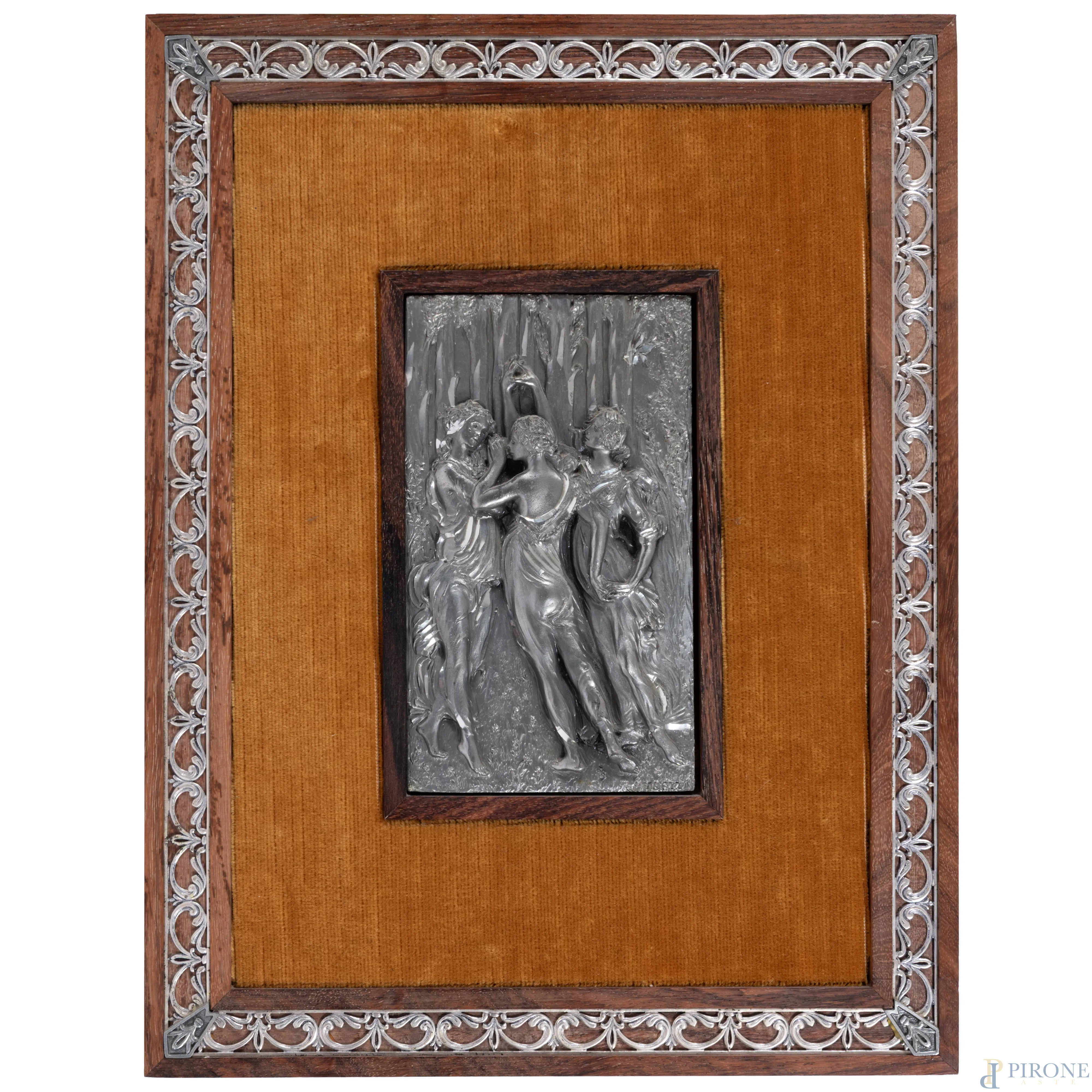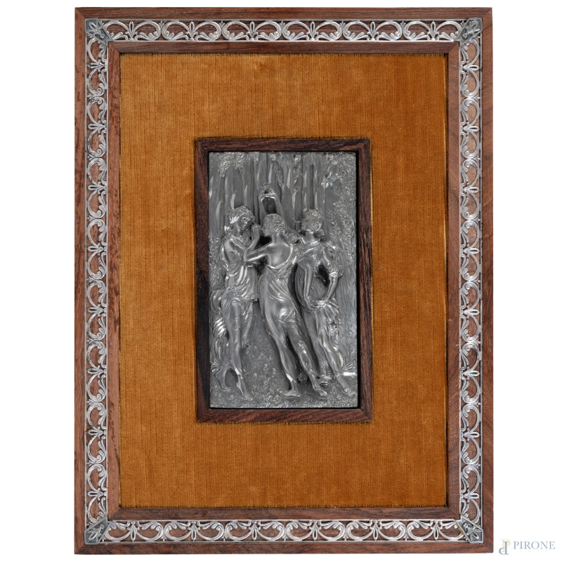 Rilievo in metallo argentato raffigurante le tre Grazie, XX secolo, cm 17x10, firmato in basso a destra "Trezza", entro cornice