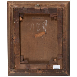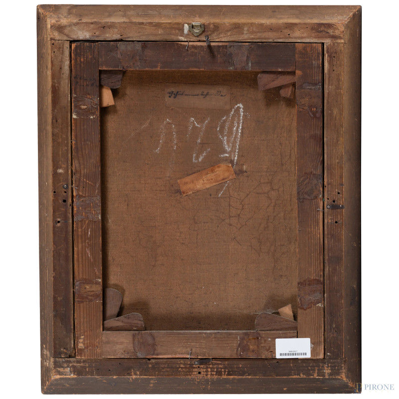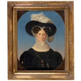 Ritratto di nobildonna con cappello, XIX secolo, olio su tela, cm 50,5x40,5, entro cornice, (cadute di colore)
