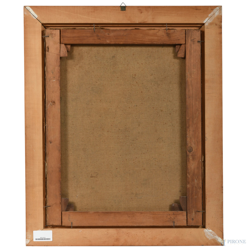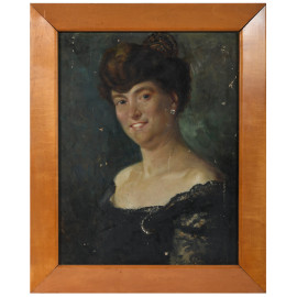 Ritratto di signora, XX secolo, olio su tela, cm 59,5x46,5, entro cornice, (graffi, cadute di colore, segni di battitura)