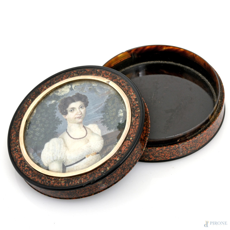 Scatolina a finto porfido con finiture in oro e ritratto a miniatura sul coperchio firmata in basso a destra , XIX secolo, cm 2,5x7,5, (lievi segni di usura del tempo)