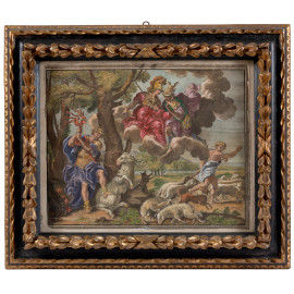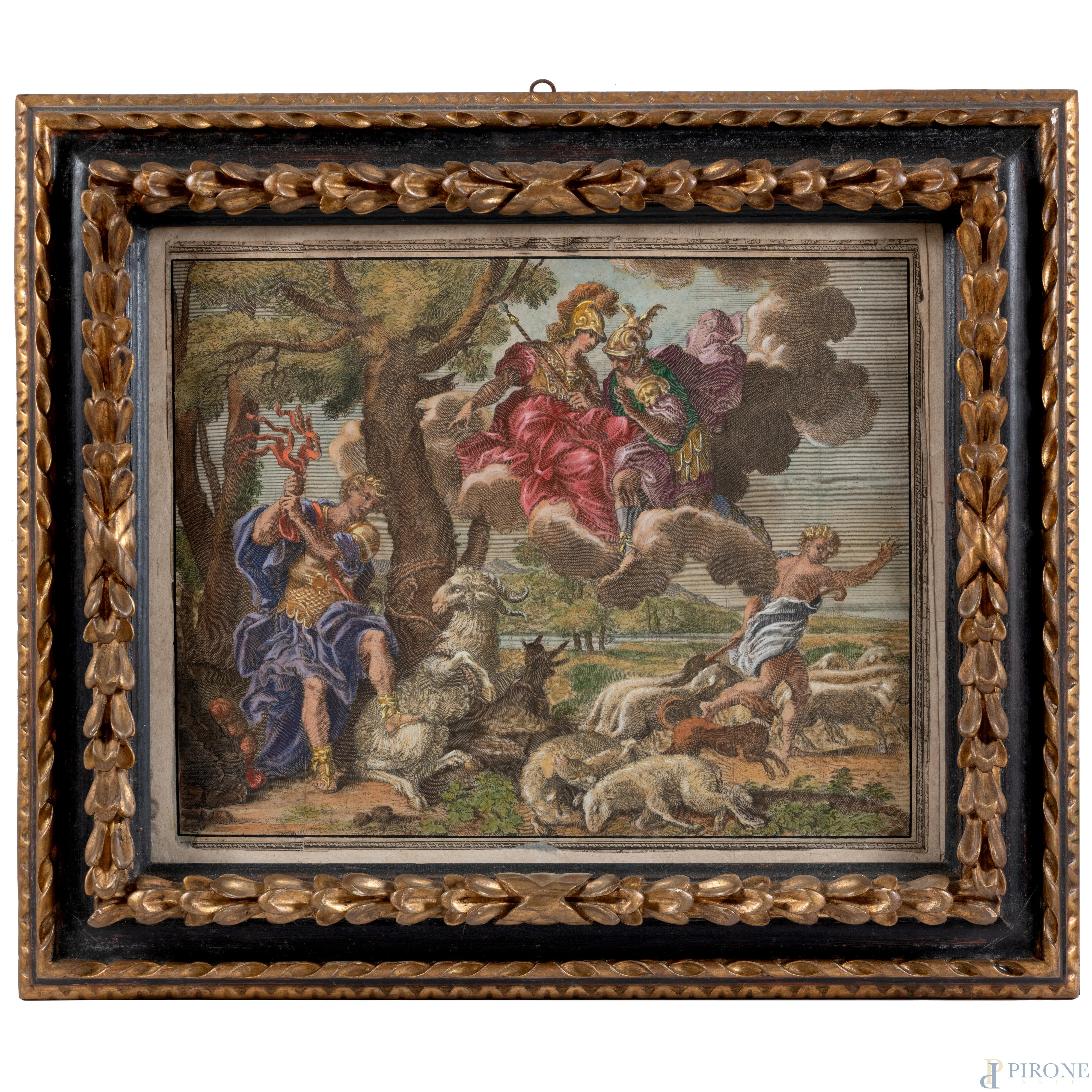 Scena mitologica, XIX secolo, incisione acquerellata, cm 39x48,5 entro cornice, (segni di piegature, usura, bruniture, foxing, tracce di umidità)