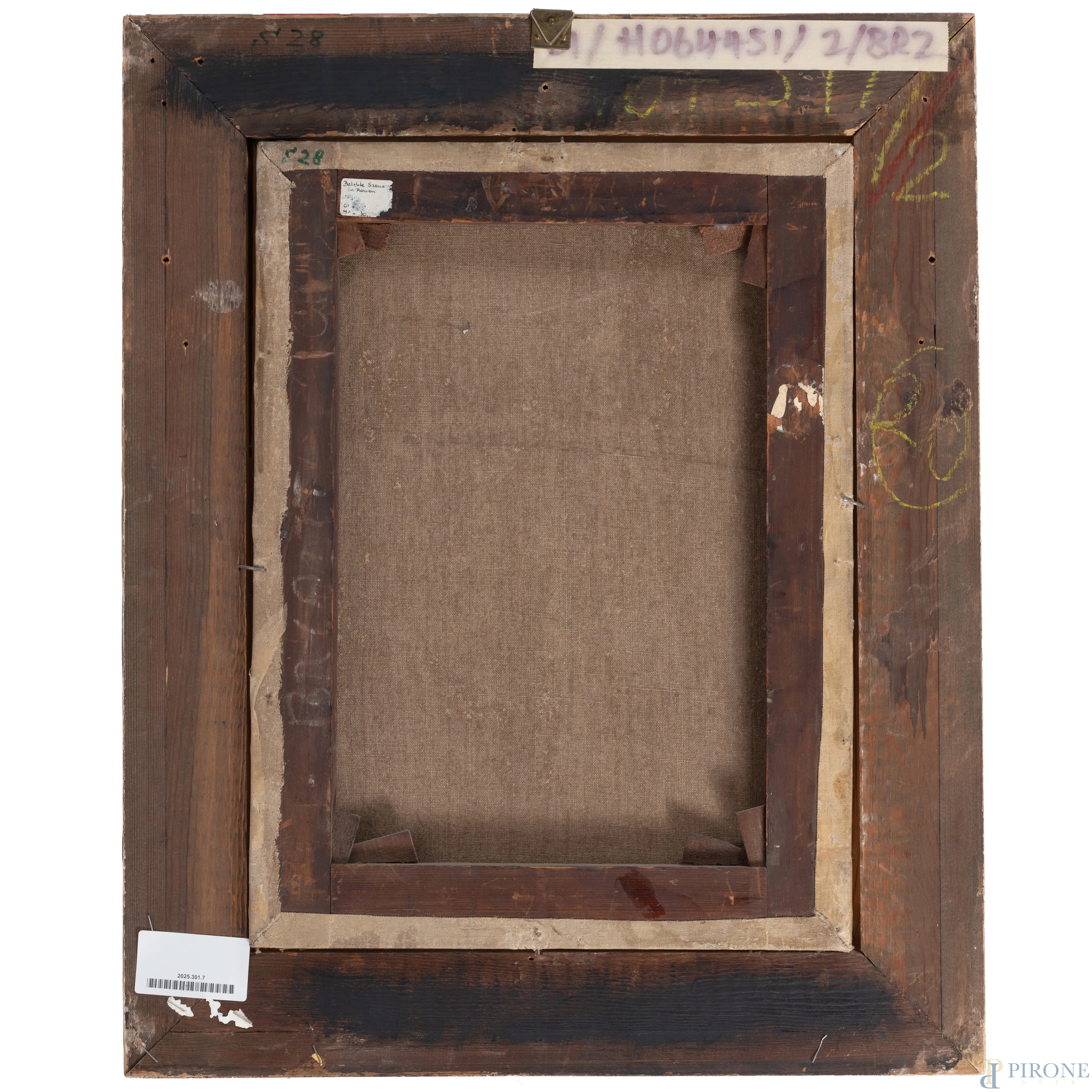 Scena popolare con capriccio, XX secolo, olio su tela, cm 41x31, firmato in basso a destra, entro cornice (piccole cadute di colore)