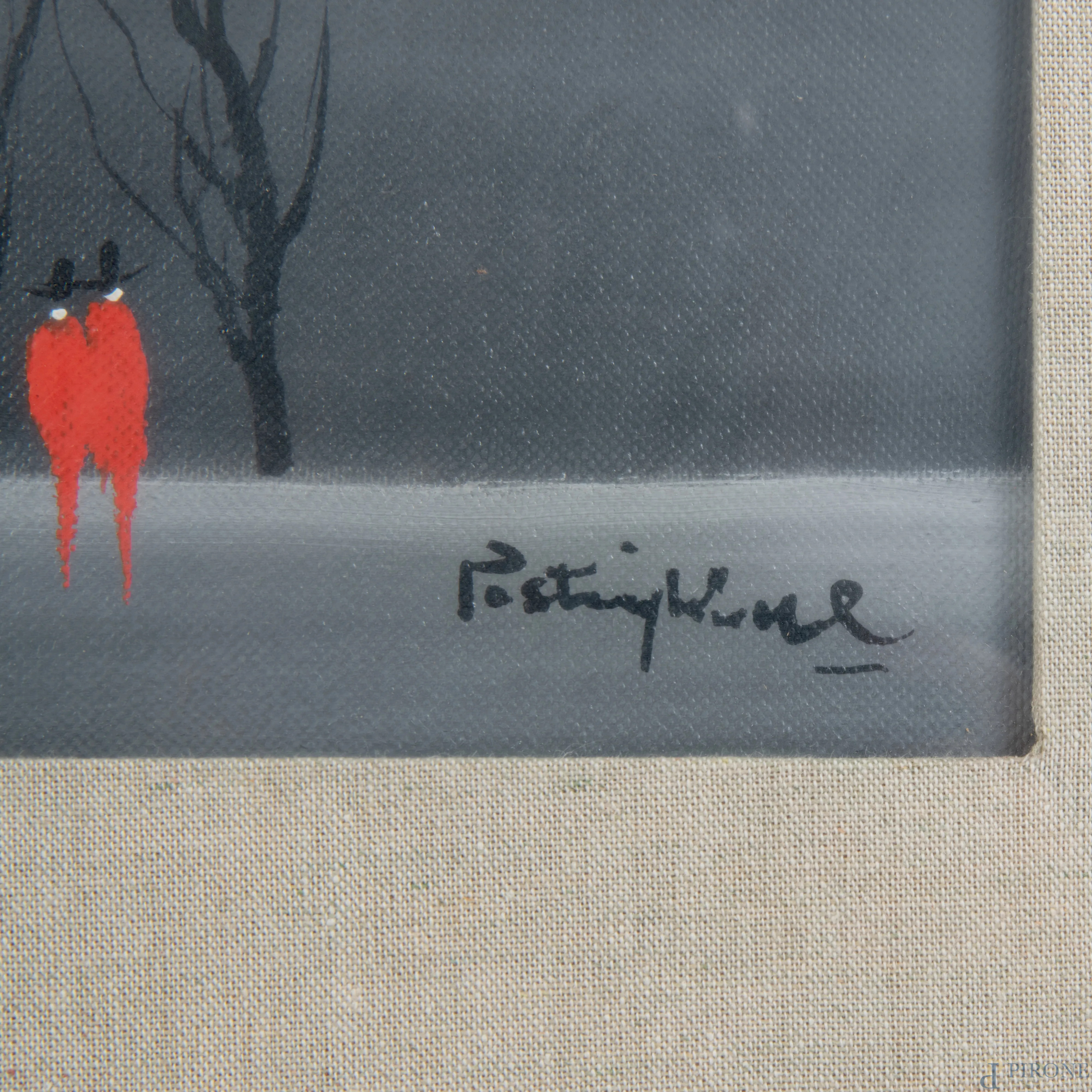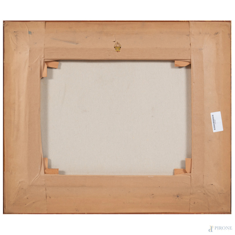 Scorcio di città con figure in rosso, XX secolo, olio su tela, cm 41x51, firmato in basso a destra, entro cornice