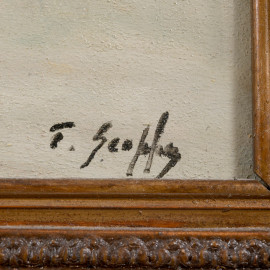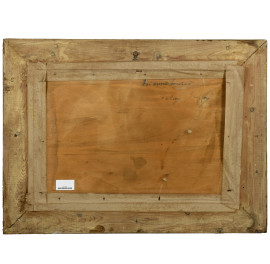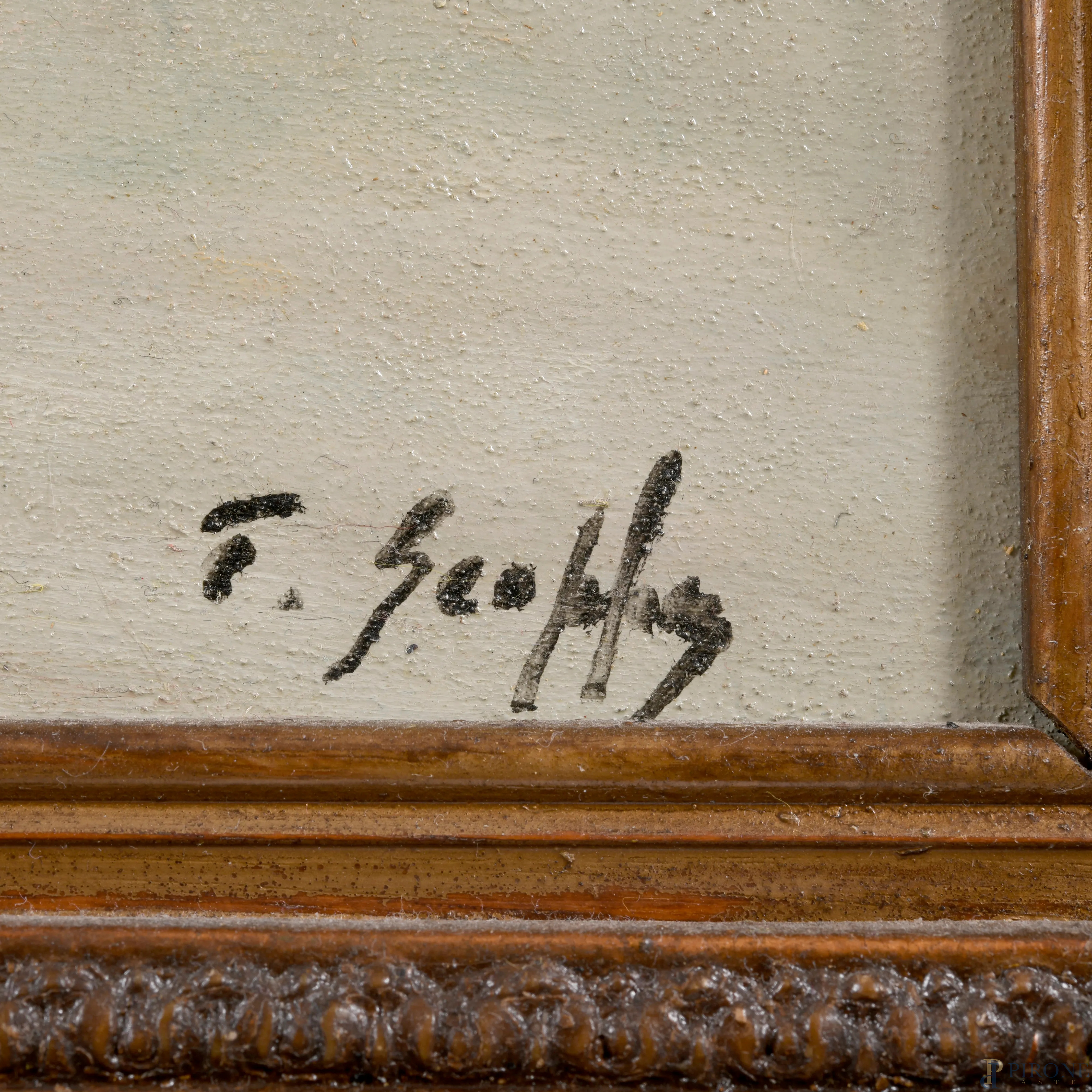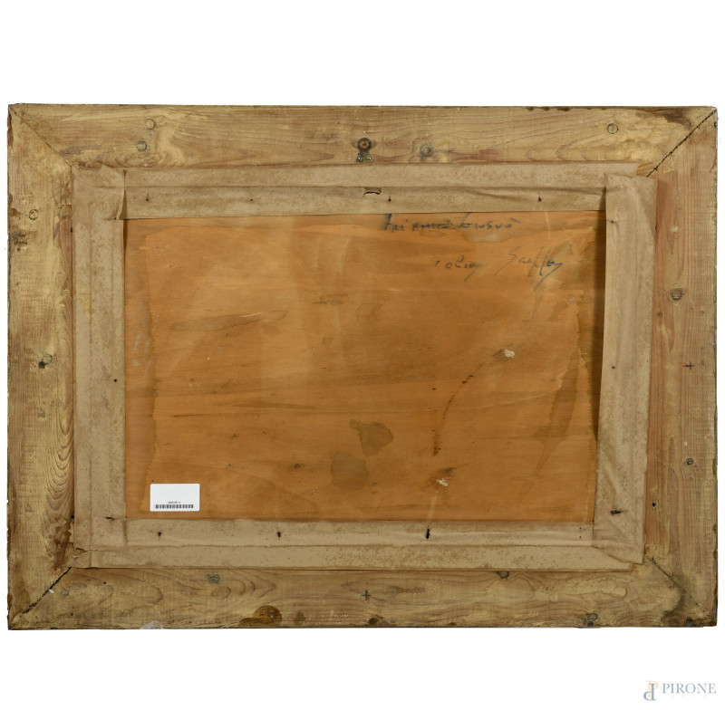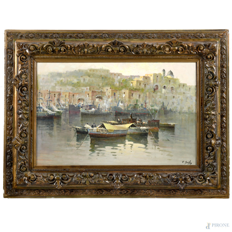 Scorcio di paese con barche, XX secolo, olio su compensato, cm 40x60, firmato in basso, entro cornice