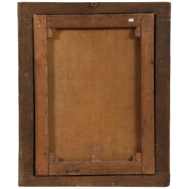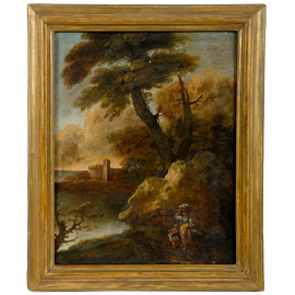 Scorcio fluviale con figure, XVIII secolo, olio su tela, cm 66x49, entro cornice, (piccole cadute di colore)