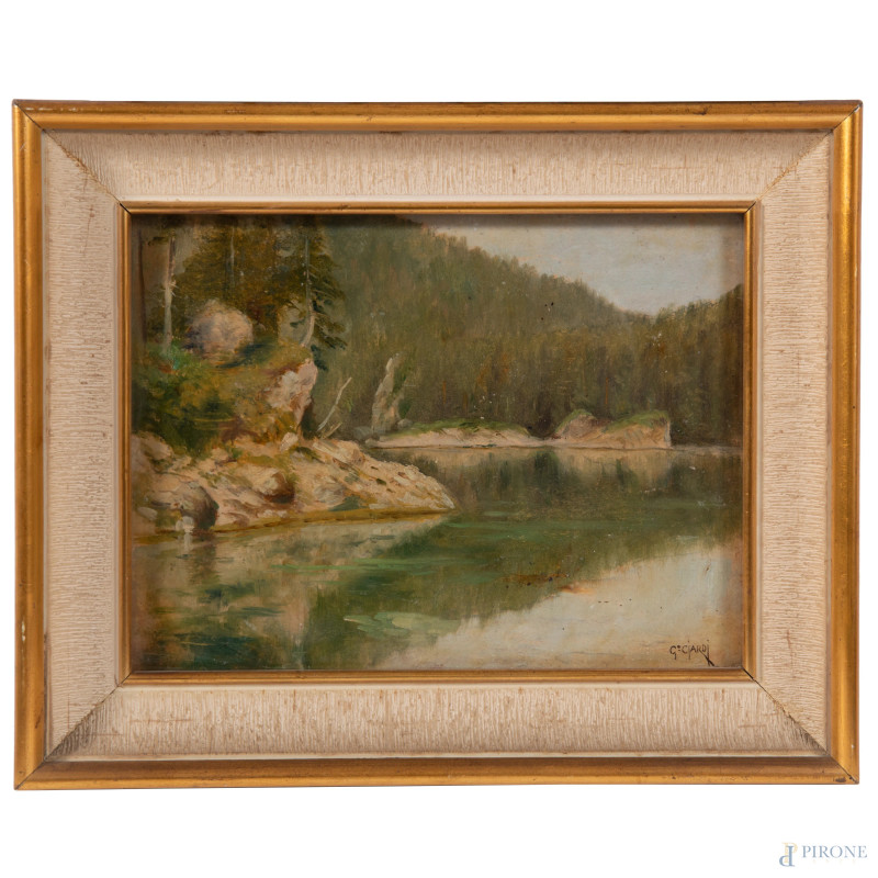 Scorcio lacustre, XIX-XX secolo, olio su tavoletta, cm21x28 , firmato in basso a destra, entro cornice