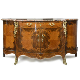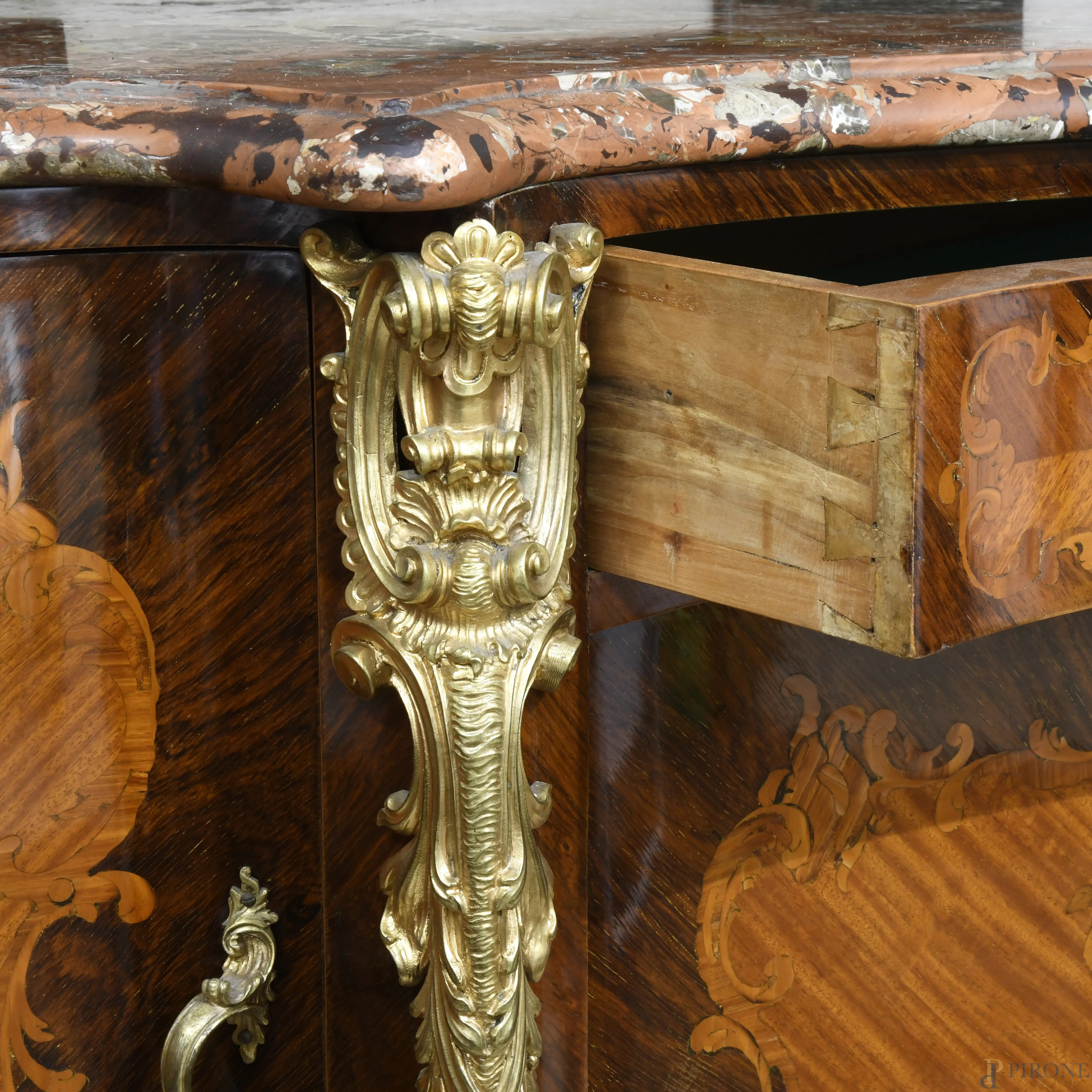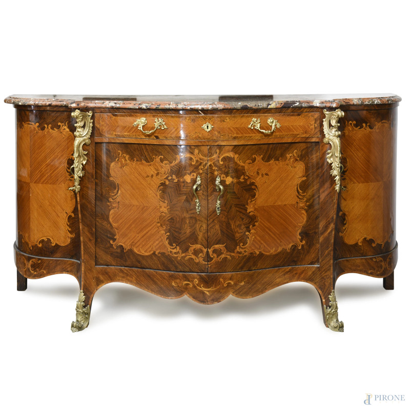 Servante in legno impiallacciato e intarsiato in varie essenze con piano sagomato in marmo. Fronte mosso scandito da due ante convesse laterali che incorniciano un cassettone e un vano a doppia anta centrali. Ferramenta e inserti in bronzo dorato. XX secolo, cm 104x202x63, (graffi, segni di usura, di [..]