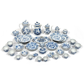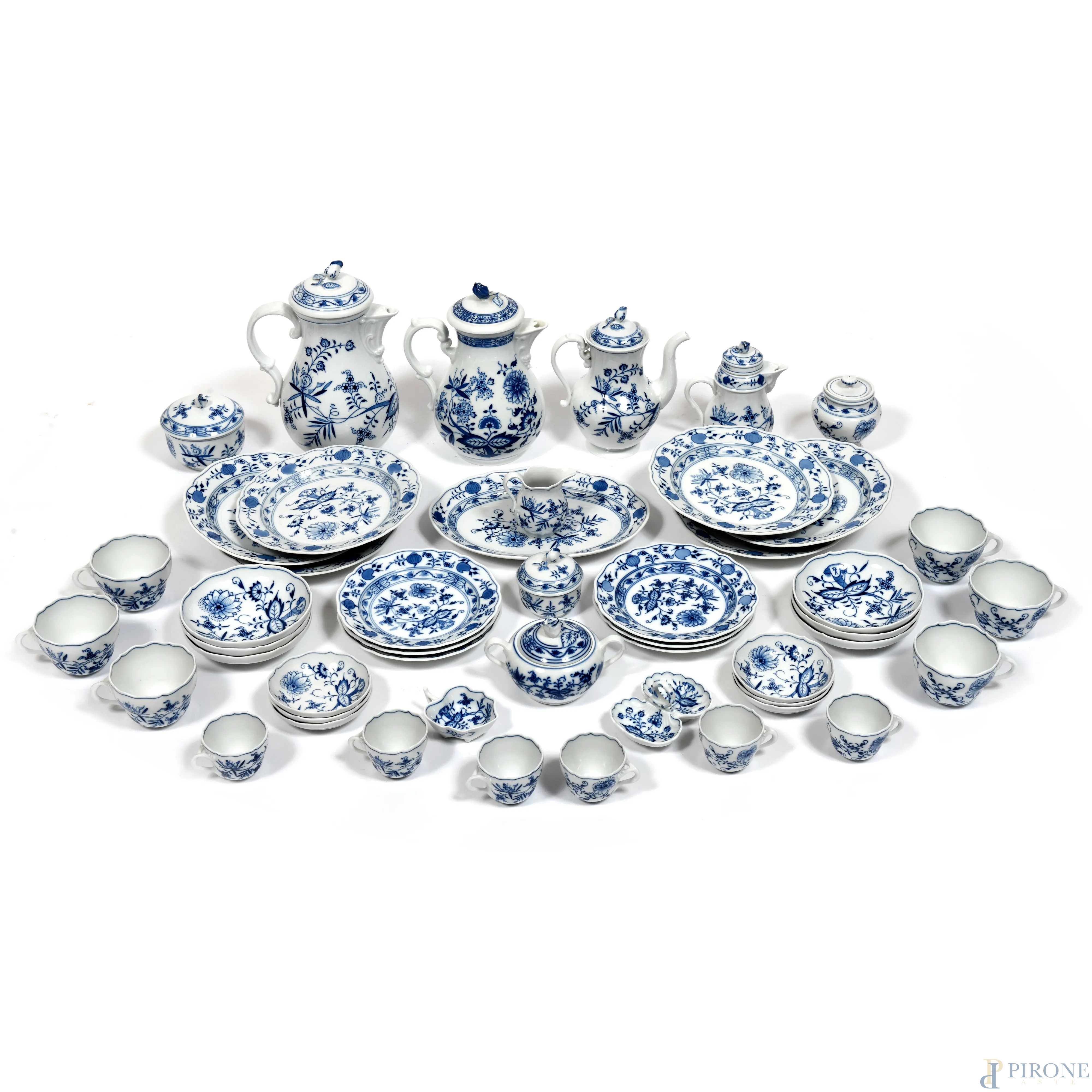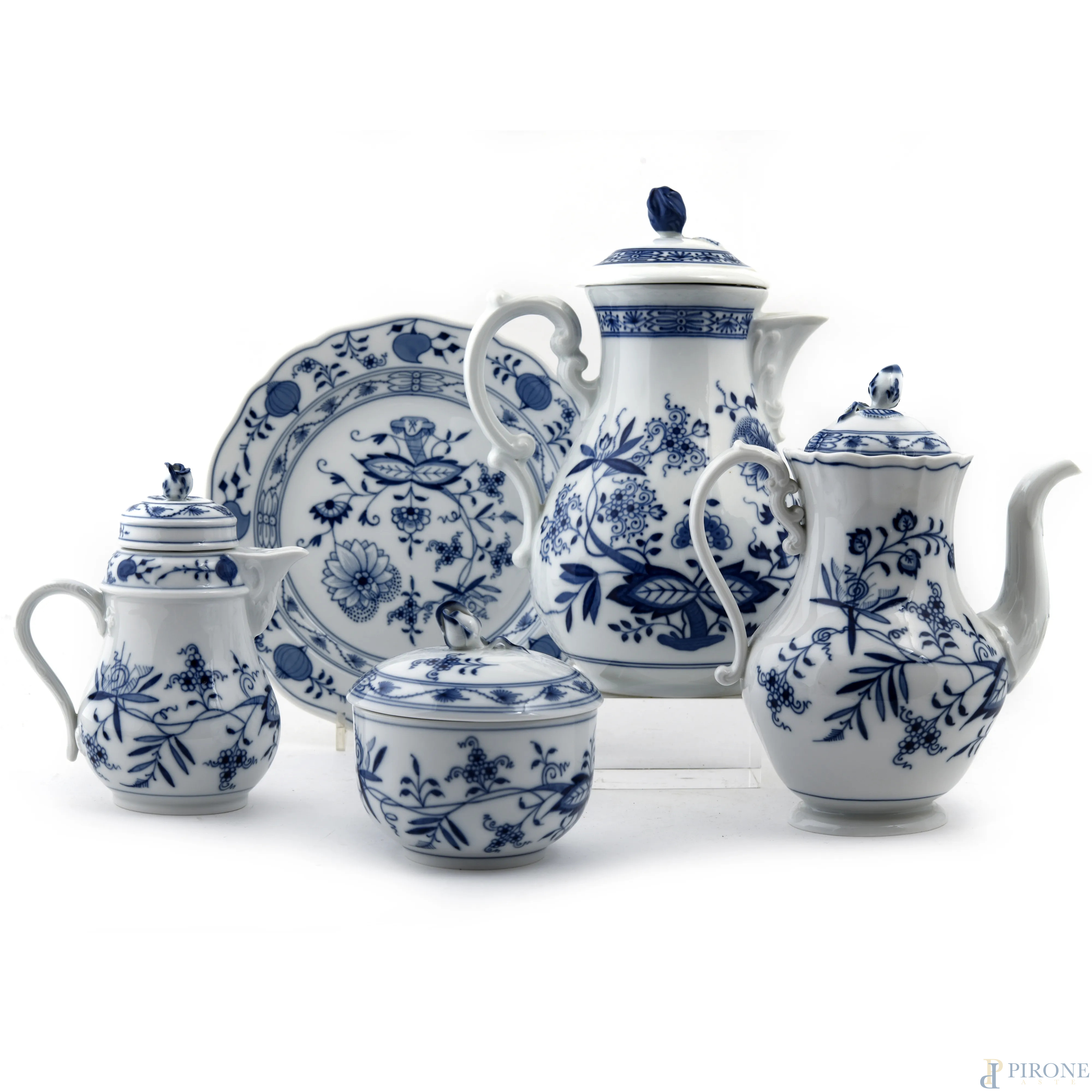 Servizio da tè e caffè in porcellana Meissen decorata a motivi vegetali e floreali nei toni del bianco e del blu, XX secolo, altezza massima cm 27