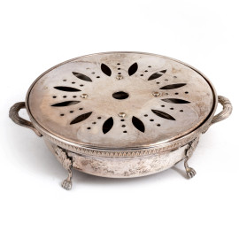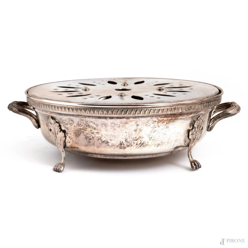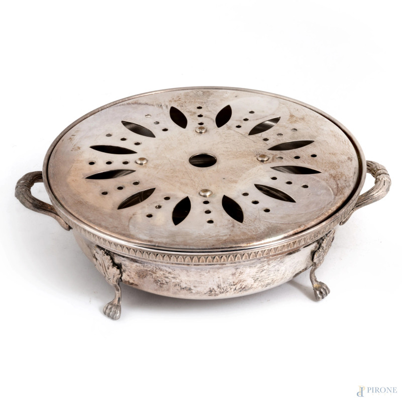 Set da fonduta in metallo argentato, XX secolo, cm 7,5x23, (segni di usura)
