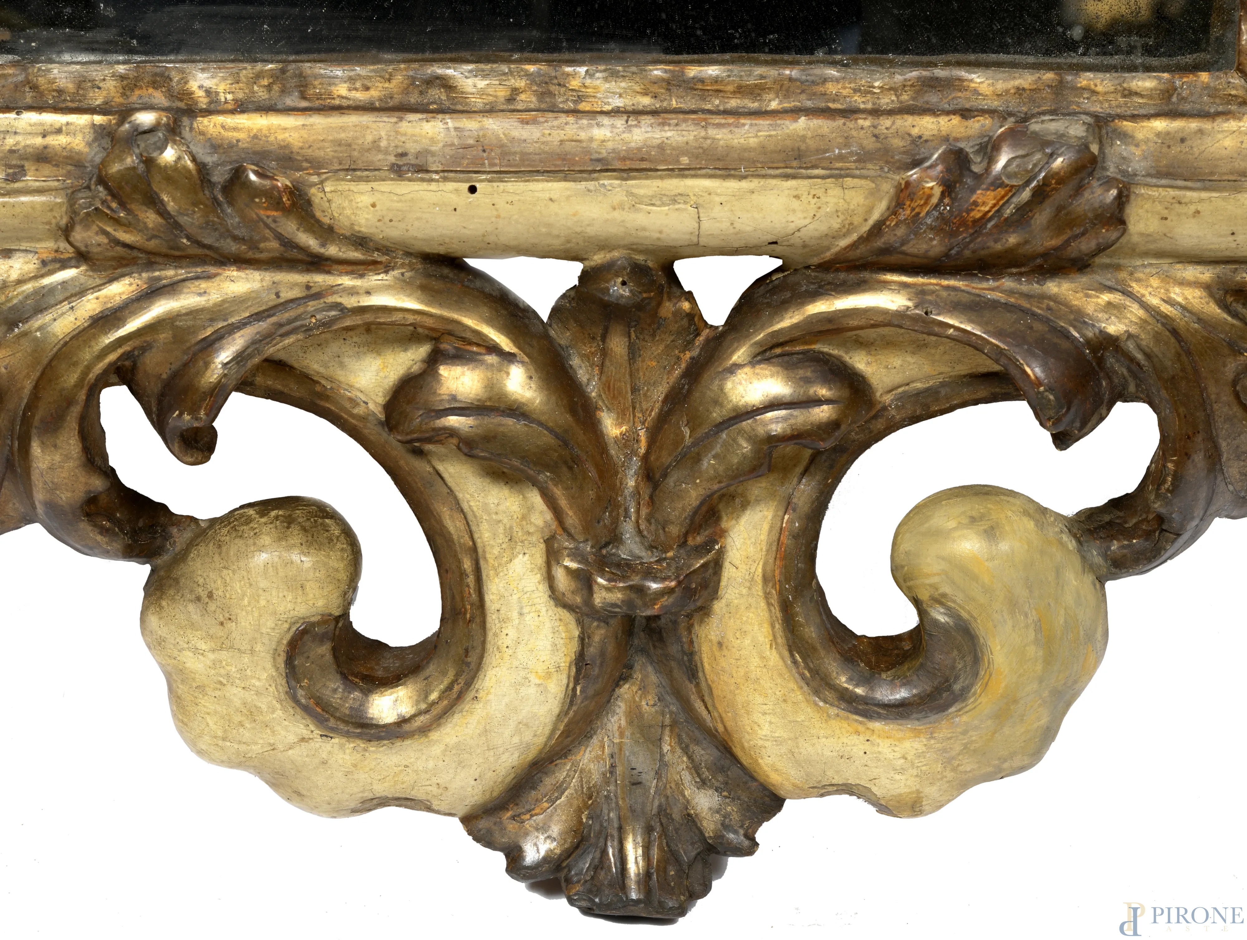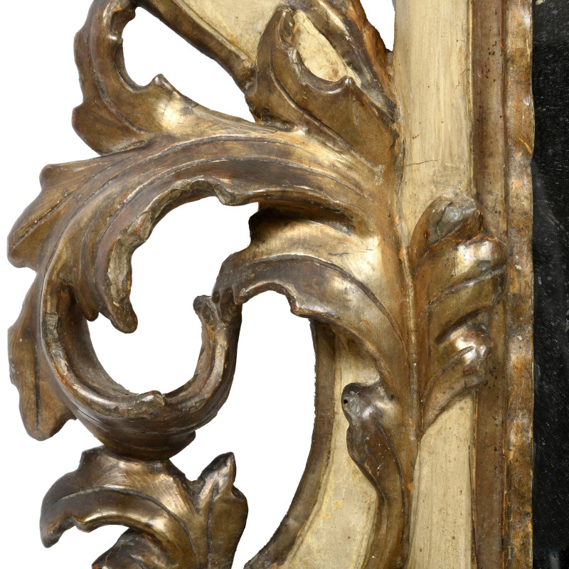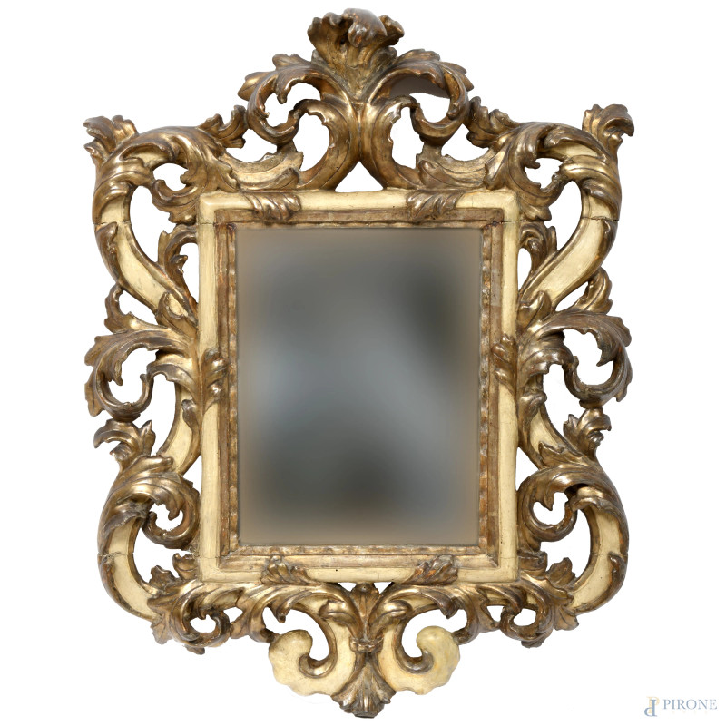 Specchiera in legno intagliato, laccato e dorato, XVIII-XIX secolo, cm 90x70, (segni di usura, rotture, restauri scalfiture, graffi)