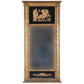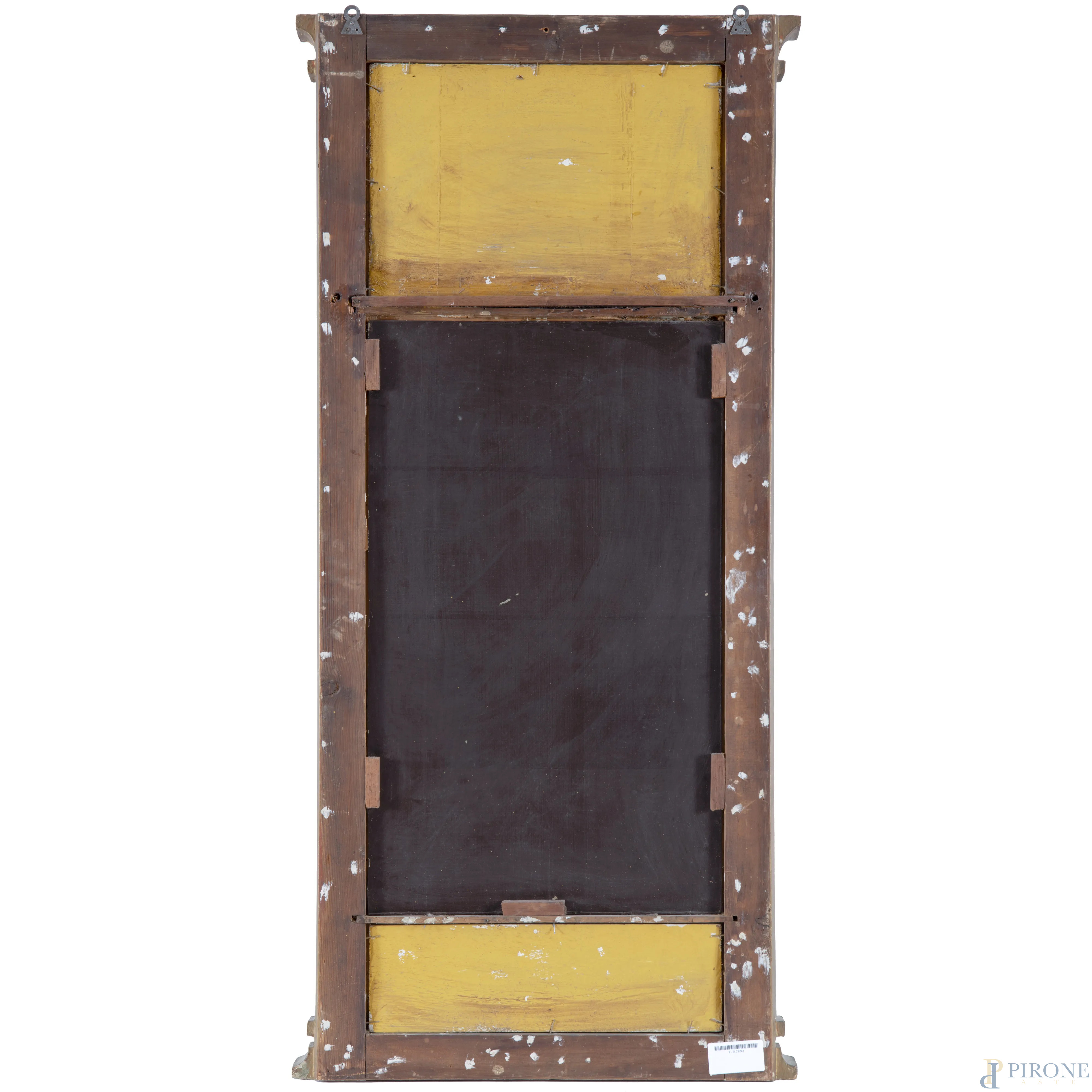 Specchiera in stile Impero in legno intagliato, dorato e laccato nero, XX secolo, misure complessive cm 112,5x53, (scalfiture, cadute di doratura)